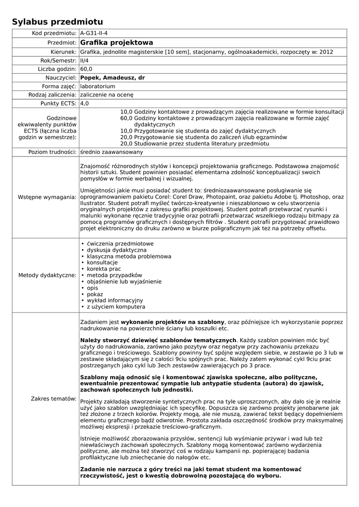 Sylabus przedmiotu Kod przedmiotu: A-G31-II-4 Przedmiot: Grafika projektowa Kierunek: Grafika, jednolite magisterskie [10 sem], stacjonarny, ogólnoakademicki, rozpoczęty w: 2012 Rok/Semestr: II/4 Liczba godzin: 60,0 Nauczyciel: Popek, Amadeusz, dr Forma zajęć: laboratorium Rodzaj zaliczenia: zaliczenie na ocenę Punkty ECTS: 4,0 10,0 Godziny kontaktowe z prowadzącym zajęcia realizowane w formie konsultacji 60,0 Godziny kontaktowe z prowadzącym zajęcia realizowane w formie zajęć dydaktycznych 10,0 Przygotowanie się studenta do zajęć dydaktycznych 20,0 Przygotowanie się studenta do zaliczeń i/lub egzaminów 20,0 Studiowanie przez studenta literatury przedmiotu Godzinowe ekwiwalenty punktów ECTS (łączna liczba godzin w semestrze): Poziom trudności: średnio zaawansowany Znajomość różnorodnych stylów i koncepcji projektowania graficznego. Podstawowa znajomość historii sztuki. Student powinien posiadać elementarna zdolność konceptualizacji swoich pomysłów w formie werbalnej i wizualnej. Umięjetności jakie musi posiadać student to: średniozaawansowane posługiwanie się Wstępne wymagania: oprogramowaniem pakietu Corel: Corel Draw, Photopaint, oraz pakietu Adobe tj. Photoshop, oraz Ilustrator. Student potrafi myśleć twórczo-kreatywnie i nieszablonowo w celu stworzenia oryginalnych projektów z zakresu grafiki projektowej. Student potrafi przetwarzać rysunki i malunki wykonane ręcznie tradycyjnie oraz potrafii przetwarzać wszelkiego rodzaju bitmapy za pomocą programów graficznych i dostępnych filtrów . Student potrafii przygotować prawidłowo projet elektroniczny do druku zarówno w biurze poligraficznym jak też na potrzeby offsetu. • • • • • Metody dydaktyczne: • • • • • • ćwiczenia przedmiotowe dyskusja dydaktyczna klasyczna metoda problemowa konsultacje korekta prac metoda przypadków objaśnienie lub wyjaśnienie opis pokaz wykład informacyjny z użyciem komputera Zadaniem jest wykonanie projektów na szablony, oraz późniejsze ich wykorzystanie poprzez nadrukowanie na powierzchnie ściany lub koszulki etc. Należy stworzyć dziewięć szablonów tematycznych. Każdy szablon powinien móc być użyty do nadrukowania, zarówno jako pozytyw oraz negatyw przy zachowaniu przekazu graficznego i treściowego. Szablony powinny być spójne względem siebie, w zestawie po 3 lub w zestawie składającym się z całości 9ciu spójnych prac. Należy zatem wykonać cykl 9ciu prac postrzeganych jako cykl lub 3ech zestawów zawierających po 3 prace. Szablony mają odnosić się i komentować zjawiska społeczne, albo polityczne, ewentualnie prezentować sympatie lub antypatie studenta (autora) do zjawisk, zachowań społecznych lub jednostki. Zakres tematów: Projekty zakładają stworzenie syntetycznych prac na tyle uproszczonych, aby dało się je realnie użyć jako szablon uwzględniając ich specyfikę. Dopuszcza się zarówno projekty jenobarwne jak też złożone z trzech kolorów. Projekty mogą, ale nie muszą, zawierać tekst będący dopełnieniem elementu graficznego bądź odwrotnie. Prostota zakłada oszczędność środków przy maksymalnej możliwej ekspresji i przekazie treściowo-graficznym. Istnieje możliwość zborazowania przysłów, sentencji lub wyśmianie przywar i wad lub też niewłaściwych zachowań społecznych. Szablony mogą komentować zarówno wydarzenia polityczne, ale można też stworzyć coś w rodzaju kampanii np. popierającej badania profilaktyczne lub zniechęcanie do nałogów etc. Zadanie nie narzuca z góry treści na jaki temat student ma komentować rzeczywistość, jest o kwestią dobrowolną pozostającą do wyboru. • • • • Forma oceniania: • • • • ćwiczenia praktyczne/laboratoryjne dokumentacja realizacji projektu obecność na zajęciach projekt realizacja projektu wystawa wystawa semestralna zaliczenie praktyczne Warunkiem zaliczenia jest zaprojektowanie, wydruk i prezentacja zadań semestralnych oraz Warunki zaliczenia: oddanie zapisu cyfrowego zrealizowanych zadań. Modułowe efekty kształcenia realizowane w ramach przedmiotu: 01W Student, który zaliczył moduł, posiada gruntowną wiedzę dotyczącą technik i technologii w obszarze grafiki projektowej, obejmującą znajomość programów komputerowych 02W zna zasady tworzenia layoutów na różnorodne media (druk, internet, multimedia) 03W posiada zaawansowaną wiedzę o realizacji prac i specyficznych właściwościach wymaganych dla przygotowania np. wydruku poligraficznego, cyfrowego itp. 04W zna nowoczesne techniki graficzne i jest świadomym użytkownikiem mediów elektronicznych, niezbędnych w pracy projektanta 05U realizuje własne koncepcje artystyczne na gruncie grafiki projektowej posługując się umiejętnie nowoczesnymi i tradycyjnymi technikami warsztatu designera 06U jest w stanie samodzielnie wybierać i modyfikować techniki i technologie, właściwe dla realizacji zamysłu projektowego 07U posiada umiejętność tworzenia cykli graficznych, spójnych formalnie i ideowo 08U potrafi zrealizować projekt, przygotowując publikację do druku, identyfikację wizualną firmy, materiały reklamowe, szatę graficzną serwisu www 09K jest świadomy ograniczeń wynikających z zasad prawa autorskiego 10K rozumie potrzebę stałego poszerzania wiedzy oraz rozwijania i doskonalenia własnych umiejętności 1. 2. Literatura: 3. 4. 5. "Anatomia projektu", Steven Heller, Mirko Ilić, wyd. ABE Dom wydawniczy. "Typografia książki-podręcznik projektanta", Michael Mitchell, Susan Wightman, wyd. D2D.pl. "Komunikacja wizualna", Bo Bergstro "Twórcze projektowanie", Gavin Ambrose, Paul Harris, wyd. PWN. "Człowiek i jego znaki", Adrian Frutiger, wyd. Optima.m. wyd.PWN.