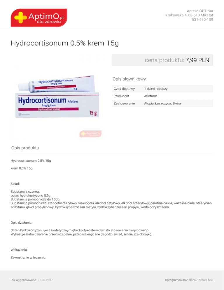 Apteka OPTIMA Krakowska 4, 63-510 Mikstat 531-470-109 Hydrocortisonum 0,5% krem 15g cena produktu: 7,99 PLN Opis słownikowy Czas dostawy 1 dzień roboczy Producent Aflofarm Zastosowanie Atopia, Łuszczyca, Skóra Opis produktu Hydrocortisonum 0,5% 15g krem 0,5% 15g Skład: Substancja czynna: octan hydrokortyzonu 0,5g Substancje pomocnicze do 100g Substancje pomocnicze: eter cetostearylowy makrogolu, alkohol cetylowy, alkohol stearylowy, parafina ciekła, wazelina biała, stearynian sorbitanu, glikol propylenowy, hydroksybenzoesan metylu, hydroksybenzoesan propylu, woda oczyszczona. Opis działania: Octan hydrokortyzonu jest syntetycznym glikokortykosteroidem do stosowania miejscowego. Wykazuje słabe działanie przeciwzapalne, przeciwalergiczne (łagodzi świąd, zmniejsza obrzęki). Wskazania: Zewnętrznie w leczeniu: Plik wygenerowano: 07-03-2017 Oprogramowanie sklepu: AptusShop Apteka OPTIMA Krakowska 4, 63-510 Mikstat 531-470-109 atopowego zapalenia skóry (wyprysk alergiczny, pokrzywka); liszaju rumieniowatego; rumieniu wielopostaciowego; liszaju płaskiego o nasilonym świądzie; łojotokowego zapalenia skóry; różnych postaci wyprysku, zwłaszcza wyprysku zliszajowaciałego; łuszczycy owłosionej skóry głowy, łuszczycy zadawnionej; świerzbiączki; podczas kontynuacji leczenia silnie działającymi glikokortykosteroidami; oparzeń I,II st. (w tym słonecznych); stanów po ukąszeniach owadów (jako środek łagodzący). Przeciwwskazania: Stosowanie leku jest przeciwwskazane kiedy występuje: nadwrażliwość na którykolwiek ze składników preparatu; infekcje i stany zapalne skóry o etiologii bakteryjnej, wirusowej lub grzybiczej; trądzik zwykły, trądzik różowaty; atrofia (zanik) skóry; nowotwór i stany przed nowotworowe skóry; zapalenie skóry wokół ust; gruźlica i kiła skóry. Nie stosować na otwarte rany i uszkodzoną skórę. Nie stosować przy współistniejącej grzybicy układowej. Należy pamiętać: brak efektu po 7 dniach stosowania preparatu lub zaostrzenie objawów chorobowych jest wskazaniem do skonsultowania się z lekarzem w celu określenia przyczyny schorzenia; nie należy stosować preparatu Hydrocortisonum 0,5 % krem dłużej niż 14 dni, bez porozumienia z lekarzem; bez porozumienia z lekarzem nie stosować u dzieci do 12 roku życia; stosowanie u chorych z cukrzycą jest możliwe wyłącznie na zlecenie lekarza specjalisty; nie stosować na zdrową skórę; stosowanie na skórę twarzy dopuszczalne jest tylko przez krótki okres (do 3 dni); nie stosować na rozległą powierzchnię skóry bez uprzedniej konsultacji z lekarzem; nie stosować w infekcjach skórnych o podłożu bakteryjnym bez zlecenia lekarza specjalisty; nie stosować na powieki u osób z jaskrą o wąskim i szerokim kącie przesączania oraz zaćmą bez zlecenia lekarza specjalisty. Okres ciąży i karmienia piersią: Kobiety ciężarne lub planujące zajście w ciąże oraz kobiety karmiące piersią powinny zasięgnąć porady lekarza o możliwości stosowania leku, a następnie postępować dokładnie według jego zaleceń. Nie stosować preparatu bez porozumienia z lekarzem. Zdolność prowadzenia pojazdów Hydrocortisonum 0,5 %, krem jest uważany za bezpieczny i nie powoduje upośledzenia sprawności psychofizycznej, zdolności prowadzenia pojazdów i obsługi urządzeń mechanicznych w ruchu. Interakcje: Plik wygenerowano: 07-03-2017 Oprogramowanie sklepu: AptusShop Apteka OPTIMA Krakowska 4, 63-510 Mikstat 531-470-109 Nie opisano dotąd wzajemnego oddziaływania (interakcji) zewnętrznie podawanego octanu hydrokortyzonu z innymi lekami. Stosowanie: Hydrocortisonum 0,5 %, krem należy stosować tylko zewnętrznie. O ile lekarz nie zaleci inaczej nakładać niewielką ilość preparatu na miejsce zmienione chorobowo 2-3 razy dziennie. Działania niepożądane: Przy krótkim stosowaniu na niewielką powierzchnię skóry, lek nie powoduje zwykle działań niepożądanych. Stosowany przez dłuższy czas może wywołać zanikowe zapalenie skóry, a na twarzy trądzik posteroidowy i zapalenie skóry wokół ust. Możliwe jest także wystąpienie niewielkiego odbarwienia skóry. Po nałożeniu preparatu mogą pojawić się objawy podrażnienia skóry takie jak pieczenie, zaczerwienienie, nadmierna suchość, które mogą być związane z reakcją na składniki pomocnicze preparatu. W przypadku powtarzania się opisanych działań niepożądanych należy skonsultować się z lekarzem. Przed użyciem należy sprawdzić termin ważności leku podany na opakowaniu. Nie stosować preparatu po upływie terminu ważności! Przechowywanie: Preparat należy przechowywać w szczelnie zamkniętych opakowaniach, w suchym i niedostępnym i niewidocznym dla dzieci miejscu o temperaturze 15-25°C. Chronić przed mrozem. Plik wygenerowano: 07-03-2017 Powered by TCPDF (www.tcpdf.org) Oprogramowanie sklepu: AptusShop