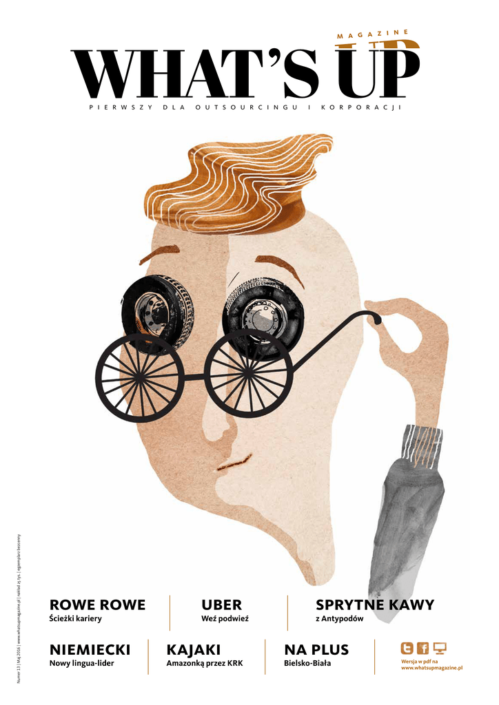 e m a g a z i n Numer 13 | Maj 2016 | www.whatsupmagazine.pl | nakład 25 tys. | egzemplarz bezcenny p i e r w s z y rowe rowe Ścieżki kariery niemiecki Nowy lingua-lider d l a o u t s o u r c i n g u uber Weź podwieź kajaki Amazonką przez krk i k o r p o r a c j i sprytne kawy z Antypodów na plus Bielsko-Biała Wersja w pdf na www.whatsupmagazine.pl 2 what’s up? www.whatsupmagazine.pl Enter spis treści temat numeru 3Rowerowe ścieżki kariery rozmowa numeru 6 Z Uberem do pracy hr 8 Sprechen Sie Deutsch? przedstawiamy 10Bielsko-Biała 11 Sprytna kawa Rano srebrna Jubilee Line pęka w szwach. Jedna z nowszych linii londyńskiego metra kursuje dosłownie co dwie minuty, ale i tak wszystkich chętnych z węzła London Bridge w kierunku biurowców na Canary Wharf nie zabierze. Obywa się co prawda bez znanych z chińskich systemów metra „upychaczy” podróżnych, ale i tak tłok bywa niemiłosierny. W tym samym momencie do pracy w gorącej Lusace w Angoli mkną pracownicy portugalskich korporacji. Małymi busikami, taksówkami, służbowymi autami. Żar leje się z nieba, w korku zmyślne piruety kręcą motocykle, skutery, rowery. Pod każdą szerokością geograficzną świata chodzi o to samo – aby w jak najkrótszym czasie dotrzeć na stanowisko pracy. Z pastą do zębów na wardze, okruchami kanapki na spodniach, uwierającymi kluczami w kieszeni. Codziennie rozgrywa się szaleńczy wyścig z czasem: ma być szybciej, sprawniej, lepiej. Wystarczy jedna awaria, jeden wypadek, i nawet najbardziej sprawny system rozsypuje się jak domek z kart. Do pracy dojedziesz później, straci Twoja firma (pieniądze), stracisz Ty (odpracowując to w wolnym czasie). Obserwując starania różnych aglomeracji świata, łatwo zauważyć, że nie zawsze postęp i wszechobecna technicyzacja oznacza poprawę w dziedzinie komunikacji. W dobie powrotu do korzeni, popularności idei work-life balance, ekologicznego stylu życia, what’s up magazine pierwszy dla outsourcingu i korporacji www.whatsupmagazine.pl redaktor naczelny Rafał Romanowski zastępca Magda Wójcik wydawca Fundacja Aktywnych Obywateli im. Józefa Dietla dyrektor artystyczny & ilustracje Joanna Sowula fotografie Piotr Banasik editor (english) Łukasz Cioch korekta Agata Malczewska reklama Anna Głuc [email protected] + 48 503 920 670 kreacja i marketing Agencja Kreatywna Lemon Media facebook Whatsupmagazine.pl twitter @WhatsUpKrakow kontakt +48 519 636 121 [email protected] Redakcja nie zwraca materiałów niezamówionych, zastrzega sobie prawo redagowania nadesłanych tekstów, nie odpowiada za treść zamieszczonych reklam i ogłoszeń. segregowania śmieci, oszczędzania kapiącej wody z kranu, łatwo zauważyć, że i w dziedzinie poruszania się po miastach jesteśmy u progu stopniowej ewolucji przyzwyczajeń. Na naszych oczach rowery – wynalazek przecież XIX-wieczny – odzyskały pozycję na komunikacyjnych mapach miast. Przez lata zapomniane, traktowane jako niegodne w konkurencji z coraz szybszymi i komfortowymi samochodami, okazują się obecnie jednym z lepszych pomysłów na poruszanie się po zatłoczonych miastach. W 2016 roku rowery panoszą się już niemal wszędzie, rowerową komunikacją stoją miasta Niemiec, Beneluksu, Skandynawii, miast Chin, Korei, Japonii. Również i w Polsce posiadanie roweru jest w modzie. Okazuje się, że spychany na margines dwukołowy pojazd ma obecnie znacznie więcej przywilejów, niż zatruwający środowisko i zajmujący zbyt pokaźną przestrzeń automobil. Zmiany w myśleniu skazanego na codzienne dotarcie do pracy człowieka wyczuwa też inny gracz globalnego rynku komunikacji – Uber. Odsądzany od czci i wiary, oblewany cuchnącymi cieczami przez warszawskich taksówkarzy produkt Ubera nie proponuje jednak nic szokującego. Chodzi o zwiększenie load factor na pokładach samochodów – po prostu wypełnienie ich pasażerami. Twoja tylna kanapa w samochodzie marnuje się rankiem w drodze do pracy – podwieź kogoś i zbij sobie koszty. Zbyt długo czekasz na taksówkę? Zobacz, kto jest w okolicy i skieruj go do siebie jednym kliknięciem. Queen & Kraków’s Bike Culture In 1978, one of the most iconic British rock bands, Queen, released their memorable single, Bicycle Race. The idea for the song came as the band’s lead singer, Freddie Mercury, saw Tour de France cyclists race outside the Mountain Studios in Montreaux. The official video for the single featured 65 nude models cycling vigorously around Wimbledon Greyhound Stadium. What an inspiration for our feature story in the spring edition of What’s Up Magazine! While the prospects for Kraków’s sports arenas may not be so jolly this season, cycling, biking and riding, on the other hand, certainly appear to have a bright future! That, in a city, where “old”, “traditional”, and “conservative” persist among the most entrenched reputation drivers. However, the amazing growth of one of Kraków’s key industries – yes, it’s you, I’m talking about – combined with the city’s ever more mature forms of social activism and young, success-hungry entrepreneurship, are reasons enough to believe that major progress has been on Kraków’s doorstep for quite some time now. It is thanks to you that some of the city’s most forward-thinking projects on sustainability, environment and quality of life actually stand a chance of making a real change – in near, rather than distant future. nieruchomości 12Prezentacja: INTER-BUD z miasta 14Ustawą w krajobraz dbamy o ciebie 16 Kobiece MMA | Zostać rodzicem siesta 18K(a)jak Kraków 19 Prezentacja: The Messy Head Hospital wokół stołu 20 Czas na piknik siedem uciech głównych 21Prezentacja: Galeria 22Kulturalny maj Więcej pasażerów – mniej samochodów. Nierealne? Wpiszcie w wyszukiwarkę hasła „Ahyeon” lub „Cheonggyecheon” i poczytajcie, jak 10-milionowy Seul – symbol ekonomicznego triumfu Korei Południowej – zamyka przecinające