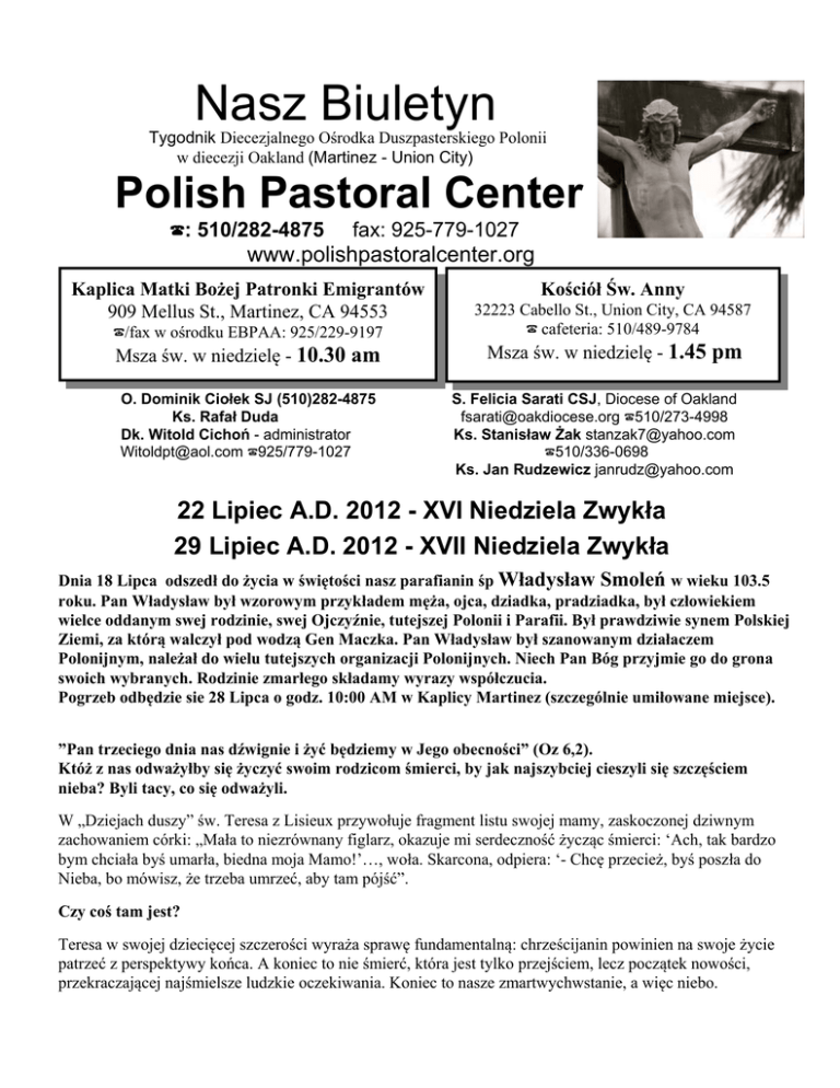 Nasz Biuletyn Tygodnik Diecezjalnego Ośrodka Duszpasterskiego Polonii w diecezji Oakland (Martinez - Union City) Polish Pastoral Center ?: 510/282-4875 fax: 925-779-1027 www.polishpastoralcenter.org Kaplica Matki Bożej Patronki Emigrantów 909 Mellus St., Martinez, CA 94553 ?/fax w ośrodku EBPAA: 925/229-9197 Msza św. w niedzielę - 10.30 am O. Dominik Ciołek SJ (510)282-4875 Ks. Rafał Duda Dk. Witold Cichoń - administrator [email protected] ?925/779-1027 Kościół Św. Anny 32223 Cabello St., Union City, CA 94587 ? cafeteria: 510/489-9784 Msza św. w niedzielę - 1.45 pm S. Felicia Sarati CSJ, Diocese of Oakland [email protected] ?510/273-4998 Ks. Stanisław Żak [email protected] ?510/336-0698 Ks. Jan Rudzewicz [email protected] 22 Lipiec A.D. 2012 - XVI Niedziela Zwykła 29 Lipiec A.D. 2012 - XVII Niedziela Zwykła Dnia 18 Lipca odszedł do życia w świętości nasz parafianin śp Władysław Smoleń w wieku 103.5 roku. Pan Władysław był wzorowym przykładem męża, ojca, dziadka, pradziadka, był człowiekiem wielce oddanym swej rodzinie, swej Ojczyźnie, tutejszej Polonii i Parafii. Był prawdziwie synem Polskiej Ziemi, za którą walczył pod wodzą Gen Maczka. Pan Władysław był szanowanym działaczem Polonijnym, należał do wielu tutejszych organizacji Polonijnych. Niech Pan Bóg przyjmie go do grona swoich wybranych. Rodzinie zmarłego składamy wyrazy współczucia. Pogrzeb odbędzie sie 28 Lipca o godz. 10:00 AM w Kaplicy Martinez (szczególnie umiłowane miejsce). ”Pan trzeciego dnia nas dźwignie i żyć będziemy w Jego obecności” (Oz 6,2). Któż z nas odważyłby się życzyć swoim rodzicom śmierci, by jak najszybciej cieszyli się szczęściem nieba? Byli tacy, co się odważyli. W „Dziejach duszy” św. Teresa z Lisieux przywołuje fragment listu swojej mamy, zaskoczonej dziwnym zachowaniem córki: „Mała to niezrównany figlarz, okazuje mi serdeczność życząc śmierci: ‘Ach, tak bardzo bym chciała byś umarła, biedna moja Mamo!’…, woła. Skarcona, odpiera: ‘- Chcę przecież, byś poszła do Nieba, bo mówisz, że trzeba umrzeć, aby tam pójść”. Czy coś tam jest? Teresa w swojej dziecięcej szczerości wyraża sprawę fundamentalną: chrześcijanin powinien na swoje życie patrzeć z perspektywy końca. A koniec to nie śmierć, która jest tylko przejściem, lecz początek nowości, przekraczającej najśmielsze ludzkie oczekiwania. Koniec to nasze zmartwychwstanie, a więc niebo. Także św. Augustyn uznał, że nie godzi się lamentować nad śmiercią własnej matki, bo „tak się zazwyczaj opłakuje śmierć uważaną za nieszczęście albo za całkowite unicestwienie. Ona zaś nie umierała nieszczęśliwie, ani nie osuwała się w nicość”. Tak myśleli ludzie, którzy żyli nadzieją zmartwychwstania. W sumie rzadko myślimy o naszym końcu, bo zaprzątają nas głównie tzw. sprawy doczesne. Zazwyczaj żyjemy troskami, lękami, przyjemnościami, ubraniami, pieniędzmi, urzędami i funkcjami. Lamentujemy nad defektami świata, społeczeństwa i państwa. Oczekujemy cudownych rozwiązań, raju na ziemi, bo tak naprawdę najchętniej urządzilibyśmy się tutaj na dobre, gdyby to tylko było możliwe. Dlaczego? Bo wieczność jawi nam się jako pewna odległa, pozaziemska, mglista i nieżyciowa rzeczywistość. Nie mówiąc już o tym, że czasem wkrada nam się wątpliwość: Czy tamten świat w ogóle istnieje? Kto to wie. Kto to zbadał. Cóż jednak się stało, skoro św. Paweł ogłasza, że jeśli Chrystus nie zmartwychwstał, to cała nasza wiara niewarta jest złamanego szeląga, a wszyscy wokół mogliby nas wówczas uznać za godnych współczucia. Potraktowaliby nas jak naiwne poczciwiny, które dały się nabrać. Przez lata sądziłem, że w zmartwychwstaniu chodzi o moje być albo nie być po śmierci. Skoro Jezus zmartwychwstał, to znaczy, że „coś” tam chyba jest. Z czasem odkryłem jednak, że akurat do przekonania o nieśmiertelności duszy Chrystus w ogóle nie jest mi potrzebny. Bo przecież już grecka mitologia mówiła o pośmiertnym losie umarłych, którzy nie przepadają w nicości, lecz lądują w Hadesie (Stary Testament nazywa to miejsce Szeolem). Była to jednak tak przerażająca kraina, że nikomu się tam nie spieszyło. Dlatego Achilles woła w „Odysei”: „Wolałbym za parobka służyć na cudzej roli, u biednego chłopa, który ledwo się może utrzymać, niż tu panować nad wszystkimi, co znikli ze świata”. Platon i Plotyn też pisali o nieśmiertelności, o wiecznych powrotach i oczyszczeniach, a Stoicy o zjednoczeniu z wiecznym i boskim kosmosem. Tak czy owak, większość starożytnych przeczuwała, że jakiś rodzaj życia po śmierci nas czeka. Tylko nieliczni twierdzili, że wszystko, co mamy, to ziemska egzystencja. Wielu współczesnych myślicieli, jak chociażby Hannah Arendt, nieśmiertelność rozumie symbolicznie jako przedłużenie pamięci o sobie na tym świecie czy to przez zrodzenie potomstwa, czy przez pozostawienie po sobie wielkich dzieł. Nie stać ich już na jakiekolwiek mentalne wyjście poza to, co widzialne. Śmierć i samotność padły w boju Cóż więc takiego wniósł Chrystus? Czy jedynie dowiódł, iż „coś” będzie po śmierci? Po pierwsze, Zmartwychwstanie Chrystusa nie tyle mówi o tym, że będziemy żyć, ale jak będziemy żyć. Od dziecka odmawiam w Kościele „Credo”. Czasem zastanawiam się nad jego treścią, częściej powtarzam to wyznanie mechanicznie z całą wspólnotą. Długo jednak nie zwracałem uwagi na pewien wymowny szczegół. Gdy dochodzimy do śmierci Chrystusa, rozpoczyna się specyficzny ruch, proces zstępowania „w dół”: „ukrzyżowan, umarł i pogrzebion, zstąpił do piekieł”, a następnie „trzeciego dnia zmartwychwstał”. Krzyż, ziemia, grób, świat „podziemny”, niebiosa. Jezus odbył przedziwną podróż. Dla ludzi oświeconych naukowymi teoriami, taka wędrówka zmarły