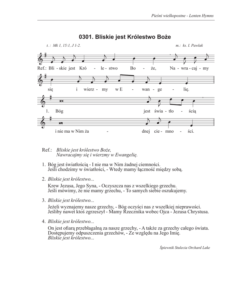 Pieśni wielkopostne - Lenten Hymns 0301. Bliskie jest Królestwo Boże t. : Mk 1, 15:1, J 1-2. m.: ks. I. Pawlak Ref.: Bli - skie jest Kró się 1. i - le - stwo wierz - my Bóg i nie ma w Nim ża wE Bo - - - że, Na - wra - caj - my wan - ge - lię. jest świa - tło - ścią dnej cie - mno - ści. Ref.:Bliskie jest królestwo Boże, Nawracajmy się i wierzmy w Ewangelię. 1. Bóg jest światłością - I nie ma w Nim żadnej ciemności. Jeśli chodzimy w światłości, - Wtedy mamy łączność między sobą. 2. Bliskie jest królestwo... Krew Jezusa, Jego Syna, - Oczyszcza nas z wszelkiego grzechu. Jeśli mówimy, że nie mamy grzechu, - To samych siebie oszukujemy. 3. Bliskie jest królestwo... Jeżeli wyznajemy nasze grzechy, - Bóg oczyści nas z wszelkiej nieprawości. Jeśliby nawet ktoś zgrzeszył - Mamy Rzecznika wobec Ojca - Jezusa Chrystusa. 4. Bliskie jest królestwo... On jest ofiarą przebłagalną za nasze grzechy, - A także za grzechy całego świata. Dostępujemy odpuszczenia grzechów, - Ze względu na Jego Imię. B liskie jest królestwo... Śpiewnik Stulecia Orchard Lake
