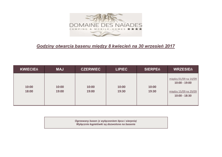 Godziny otwarcia basenu między 8 kwiecień na 30 wrzesień 2017 KWIECIEń MAJ CZERWIEC LIPIEC SIERPEń WRZESIEń między 01/09 na 14/09 10:00 - 19:00 10:00 18:00 10:00 19:00 10:00 19:00 10:00 19:30 10:00 19:30 między 15/09 na 29/09 10:00 - 18:30 Ogrzewany basen (z wyłączeniem lipca i sierpnia) Wyłącznie kąpielówki są dozwolone na basenie