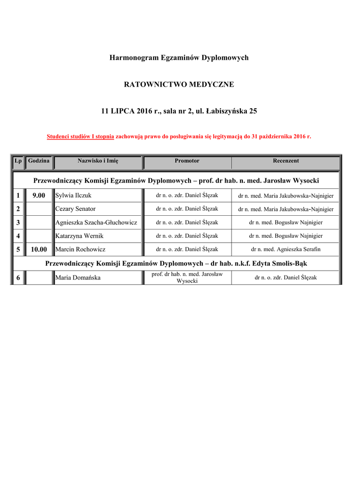 Harmonogram Egzaminów Dyplomowych RATOWNICTWO MEDYCZNE 11 LIPCA 2016 r., sala nr 2, ul. Łabiszyńska 25 Studenci studiów I stopnia zachowują prawo do posługiwania się legitymacją do 31 października 2016 r. Lp Godzina Nazwisko i Imię Promotor Recenzent Przewodniczący Komisji Egzaminów Dyplomowych – prof. dr hab. n. med. Jarosław Wysocki Sylwia Ilczuk dr n. o. zdr. Daniel Ślęzak dr n. med. Maria Jakubowska-Najnigier 2 Cezary Senator dr n. o. zdr. Daniel Ślęzak dr n. med. Maria Jakubowska-Najnigier 3 Agnieszka Szacha-Głuchowicz dr n. o. zdr. Daniel Ślęzak dr n. med. Bogusław Najnigier 4 Katarzyna Wernik dr n. o. zdr. Daniel Ślęzak dr n. med. Bogusław Najnigier Marcin Rochowicz dr n. o. zdr. Daniel Ślęzak dr n. med. Agnieszka Serafin 1 5 9.00 10.00 Przewodniczący Komisji Egzaminów Dyplomowych – dr hab. n.k.f. Edyta Smolis-Bąk 6 Maria Domańska prof. dr hab. n. med. Jarosław Wysocki dr n. o. zdr. Daniel Ślęzak