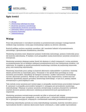 Spis treści 1 Wstęp 2 Monitoring radiologiczny kraju 3 Kontrola narażenia zawodowego 4 Indywidualna kontrola narażenia 5 Metodyka doboru programu monitoringu 6 Pomiary kontrolne 7 Dekontaminacja Wstęp Praca lub przebywanie w warunkach narażenia na promieniowanie jonizujące wymaga kontroli wielkości tego narażenia i oceny jego ewentualnego wpływu na zdrowie człowieka. Kontroli podlega zarówno narażenie zawodowe, jak i narażenie ludności od promieniowania naturalnego i spowodowane działalnością człowieka. Monitoring narażenia może obejmować pomiary środowiska naturalnego, pomiary środowiska pracy lub kontrolę indywidualną. W każdym z tych przypadków można kontrolować narażenie zewnętrzne i wewnętrzne. Monitoring narażenia obejmuje pomiar dawki lub skażenia w celach związanych z oceną narażenia na promieniowanie lub na działanie substancji promieniotwórczych oraz interpretację wyników i ich rejestrację. Ze względu na sposób prowadzenia monitoringu rozróżnia się monitoring stanowiska pracy oraz monitoring indywidualny. Monitoring stanowiska pracy polega na kontroli aktywności radionuklidów w powietrzu i kontrolę skażeń powierzchni na stanowisku pracy. Otrzymane w ten sposób dane pozwalają na ocenę narażenia pracowników, klasyfikacji do kategorii narażenia i szybkie wykrywanie ewentualnego wzrostu aktywności powietrza. Metoda ta jest obarczona dużą niepewnością i system musi być okresowo sprawdzany poprzez procedury monitoringu kontrolnego, w tym m.in. pomiary skażeń wewnętrznych u poszczególnych osób. Taka metoda oceny narażenia jest wystarczająca w przypadku monitorowania pracowników kategorii B, natomiast w przypadku pracowników kategorii A, wymagane jest prowadzenie monitoringu indywidualnego. Obejmuje on pomiar narażenia zewnętrznego za pomocą dozymetrów osobistych oraz/lub okresowe pomiary aktywności substancji promieniotwórczych zgromadzonych w organizmie. Monitoring narażenia wewnętrznego prowadzi się tylko w sytuacjach gdy istnieje prawdopodobieństwo jego wystąpienia, a więc podczas prac z otwartymi źródłami promieniowania lub w sytuacjach awaryjnych, związanych z uwolnieniami materiałów promieniotwórczych. Monitoring indywidualny pozwala na ocenę indywidualnego narażenia, kontrolę warunków pracy i wprowadzenie korekt w zakresie skuteczności barier ochronnych, a także szybkie wprowadzenie działań interwencyjnych i ich kontrolę w sytuacjach awaryjnych. W zależności od celu i sposobu prowadzenia monitoringu, rozróżnia się jego następujące rodzaje: rutynowy, specjalny, kontrolny i związany z określoną czynnością. Monitoring rutynowy umożliwia określenie narażenia w normalnych warunkach pracy. Warunki monitorowanej działalności są ustalone i nie podlegają raptownym zmianom. Pomiary są wykonywane regularnie za pomocą wcześniej określonych metod. Monitoring rutynowy pozwala na wykluczenie lub identyfikację narażenia lub skażeń, przekraczających wcześniej ustalony poziom.Poziom ten powinien być niższy od określonych w przepisach limitów dawek i optymalizowany zgodnie z zasadą ALARA. Monitoring specjalny jest prowadzony w przypadku wprowadzania nowego procesu technologicznego i przy pracach awaryjnych. Obejmuje on prace wykonywane w celu ilościowej oceny istotnie dużych dawek, otrzymanych w wyniku zdarzeń nadzwyczajnych lub gdy istnieje podejrzenie, że do takiego zdarzenia mogło dojść Monitoring kontrolny (sprawdzający) wykonuje się w celu sprawdzenia założeń, przyjętych przy ustalaniu programu monitoringu rutynowego. W przypadku planowania nietypowej czynności lub ograniczonej w czasie działalności, może zaistnieć potrzeba prowadzenia monitoringu związanego z tą czynnością lub działalnością. Cele takiego monitoringu są takie same jak dla monitoringu rutynowego. Monitoring radiologiczny kraju Pomiary narażenia ludności na promieniowanie naturalne są prowadzone za pomocą pomiarów skażeń promieniotwórczych środowiska. W Polsce pomiary tego typu są prowadzonych przez stacje pomiarowe tworzące system wczesnego wykrywania skażeń promieniotwórczych, podstawowe placówki pomiarowe prowadzące pomiary skażeń promieniotwórczych materiałów środowiskowych i żywności oraz placówki specjalistyczne jednostek badawczo-rozwojowych, wyższych uczelni oraz innych instytucji. Działania stacji i placówek pomiarowych koordynuje Prezes PAA, który dokonuje systematycznej oceny sytuacji radiacyjnej kraju. Wyniki monitoringu radiacyjnego kraju stanowią podstawę oceny sytuacji radiacyjnej Polski, która ogłaszana jest codziennie (na stronach internetowych PAA), w komunikatach kwartalnych (publikowanych w Monitorze Polskim) i w raportach rocznych, a w razie zaistnienia sytuacji awaryjnych - stanowi podstawę oceny zagrożenia i prowadzenia działań interwencyjnych. Stacje wczesnego wykrywania monitują moc dawki promieniowania gamma na wysokości 1m nad powierzchnią ziemi oraz stężenia substancji promieniotwórczych w próbkach aerozoli. Natomiast placówki pomiarów skażeń prowadzą pomiary zawartości izotopów promieniotwórczych w próbkach wód powierzchniowych, wód wodociągowych, mleka, pasz surowych, gleby, osadów dennych, opadu całkowitego. W skład sieci wczesnego wykrywania skażeń promieniotwórczych wchodzi trzynaście stacji automatycznych PMS (Permanent Monitoring Station) należących do PAA, które wykonują ciągłe pomiary mocy dawki promieniowania gamma oraz widma promieniowania gamma powodowanego skażeniem powietrza i powierzchni ziemi oraz intensywności opadów atmosferycznych oraz temperatury otoczenia. Dane pomiarowe ze stacji PMS przekazywane są do systemów międzynarodowych UE (system EURDEP) i Rady Państw Morza Bałtyckiego. Stacje wczesnego wykrywania skażeń promieniotwórczych to: 13 stacji typu ASS-500 — ciągłe zbieranie aerozoli atmosferycznych na filtrze i pomiary spektrometrycz