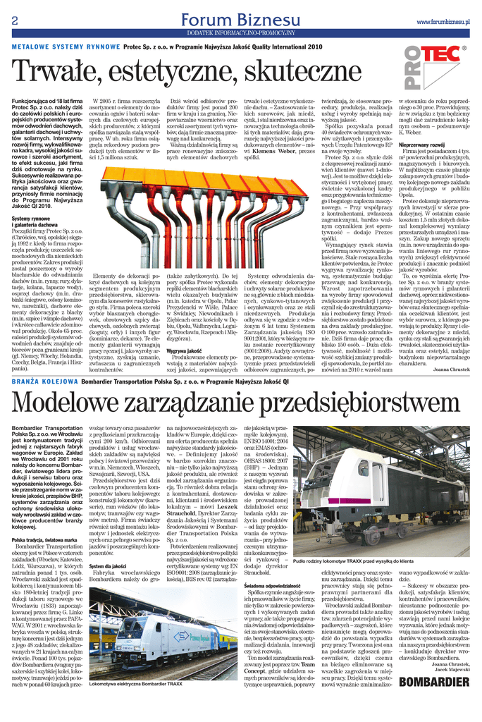 2 www.forumbiznesu.pl DODATEK INFORMACYJNO-PROMOCYJNY M E TA L O W E S Y S T E M Y R Y N N O W E Protec Sp. z o.o. w Programie Najwyższa Jakość Quality International 2010 Trwałe, estetyczne, skuteczne Funkcjonująca od 18 lat firma Protec Sp. z o.o. należy dziś do czołówki polskich i europejskich producentów systemów odwodnień dachowych, galanterii dachowej i uchwytów solarnych. Intensywny rozwój firmy, wykwalifikowana kadra, wysokiej jakości surowce i szeroki asortyment, to efekt sukcesu, jaki firma dziś odnotowuje na rynku. Sukcesywnie realizowana polityka jakościowa oraz gwarancja satysfakcji klientów, przyniosły firmie nominację do Programu Najwyższa Jakość QI 2010. Systemy rynnowe i galanteria dachowa Początki firmy Protec Sp. z o.o. (Chróścice, woj. opolskie) sięgają 1992 r. kiedy to firma rozpoczęła produkcję uszczelek samochodowych dla niemieckich producentów. Zakres produkcji został poszerzony o wyroby blacharskie do odwadniania dachów (m.in. rynny, rury, dylatacje, kolana, łapacze wody), osprzęt dachowy (m.in. drabinki śniegowe, osłony kominowe, narożniki), dachowe elementy dekoracyjne z blachy (m.in. szpice i wimple dachowe) i wkrótce całkowicie zdominował produkcję. Około 65 proc. całości produkcji systemów odwodnień dachów, znajduje odbiorców poza granicami kraju (gł. Niemcy, Włochy, Holandia, Czechy, Belgia, Francja i Hiszpania). W 2005 r. firma rozszerzyła asortyment o elementy do mocowania ogniw i baterii solarnych dla czołowych europejskich producentów, z którymi spółka nawiązała stałą współpracę. W ub. roku firma osiągnęła rekordowy poziom produkcji tych elementów w ilości 1,5 miliona sztuk. Dziś wśród odbiorców produktów firmy jest ponad 200 firm w kraju i za granicą. Niepowtarzalne wzornictwo oraz szeroki asortyment tych wyrobów, dają firmie znaczną przewagę nad konkurencją. Ważną działalnością firmy są prace renowacyjne zniszczonych elementów dachowych trwałe i estetyczne wykończenie dachu. – Zastosowanie takich surowców, jak miedź, cynk, i stal nierdzewna oraz innowacyjna technologia obróbki tych materiałów, dają gwarancję najwyższej jakości produkowanych elementów – mówi Klemens Weber, prezes spółki. Elementy do dekoracji pokryć dachowych są kolejnym segmentem produkcyjnym przedsiębiorstwa, skierowanym dla koneserów rustykalnego stylu. Firma poleca szeroki wybór blaszanych chorągiewek, obrotowych szpicy dachowych, ozdobnych zwierząt (koguty, orły) i innych figur (kominiarze, dekarze). Te elementy galanterii wymagają pracy ręcznej i, jako wyroby artystyczne, zyskują uznanie, zwłaszcza u zagranicznych kontrahentów. (także zabytkowych). Do tej pory spółka Protec wykonała repliki elementów blacharskich wielu okazałych budynków (m.in. katedra w Opolu, Pałac Prezydencki w Wiśle, Pałace w Świdnicy, Niewodnikach i Ziębicach oraz kościoły w Dębiu, Opolu, Wałbrzychu, Legnicy, Wrocławiu, Rzepcach i Międzygórzu). Systemy odwodnienia dachów, elementy dekoracyjne i uchwyty solarne produkowane są głównie z blach miedzianych, cynkowo-tytanowych i ocynkowanych oraz ze stali nierdzewnych. Produkcja odbywa się w zgodzie z wdrożonym 6 lat temu Systemem Zarządzania jakością ISO 9001:2001, który w bieżącym roku zostanie recertyfikowany (9001:2008). Audyty zewnętrzne, przeprowadzone systematycznie przez przedstawicieli odbiorców zagranicznych, po- Wygrywa jakość Produkowane elementy powstają z materiałów najwyższej jakości, zapewniających twierdzają, że stosowane procedury, produkcja, realizacja usług i wyroby spełniają najwyższą jakość. Spółka pozyskała ponad 40 świadectw ochronnych wzorów użytkowych i przemysłowych Urzędu Patentowego RP na swoje wyroby. Protec Sp. z o.o. słynie dziś z ekspresowej realizacji zamówień klientów (nawet 1-dniowej). Jest to możliwe dzięki elastyczności i wytężonej pracy, świetnie wyszkolonej kadry oraz przygotowania technicznego i bogatego zaplecza maszynowego. – Przy współpracy z kontrahentami, zwłaszcza zagranicznymi, bardzo ważnym czynnikiem jest operatywność – dodaje Prezes spółki. Wymagający rynek stawia przed firmą nowe wyzwania jakościowe. Stale rosnąca liczba klientów potwierdza, że Protec wygrywa rywalizację rynkową, systematycznie budując przewagę nad konkurencją. Wzrost zapotrzebowania na wyroby firmy spowodował zwiększenie produkcji i przyczynił się do zrestrukturyzowania i rozbudowy firmy. Przedsiębiorstwo zostało podzielone na dwa zakłady produkcyjne. O 100 proc. wzrosło zatrudnienie. Dziś firma daje pracę dla blisko 150 osób. – Duża efektywność, mobilność i możliwość szybkiej zmiany produkcji spowodowała, że portfel zamówień na 2010 r. wzrósł nam w stosunku do roku poprzedniego o 30 proc. Przewidujemy, że w związku z tym będziemy mogli dać zatrudnienie kolejnym osobom – podsumowuje K. Weber. Nieprzerwany rozwój Firma jest posiadaczem 4 tys. m² powierzchni produkcyjnych, magazynowych i biurowych. W najbliższym czasie planuje zakup nowych gruntów i budowę kolejnego nowego zakładu produkcyjnego w pobliżu Opola. Protec dokonuje nieprzerwanych inwestycji w sferze produkcyjnej. W ostatnim czasie kosztem 1,5 mln złotych dokonał kompleksowej wymiany przestarzałych urządzeń i maszyn. Zakup nowego sprzętu (m.in. nowe urządzenia do spawania liniowego rur rynnowych) zwiększył efektywność produkcji i znacznie podniósł jakość wyrobów. To, co wyróżnia ofertę Protec Sp. z o.o. w branży systemów rynnowych i galanterii dachowej, oprócz niekwestionowanej najwyższej jakości wyrobów oraz skutecznego spełniania oczekiwań klientów, jest wybór surowca, z którego powstają te produkty. Rynny i elementy dekoracyjne z miedzi, cynku czy stali są gwarancją ich trwałości, skuteczności użytkowania oraz estetyki, nadając budynkom niepowtarzalnego charakteru. Joanna Chrustek B R A N Ż A K O L