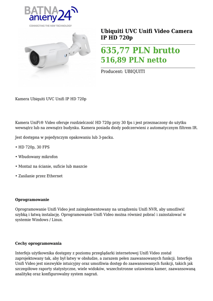 Ubiquiti UVC Unifi Video Camera IP HD 720p 635,77 PLN brutto 516,89 PLN netto Producent: UBIQUITI Kamera Ubiquiti UVC Unifi IP HD 720p Kamera UniFi® Video oferuje rozdzielczość HD 720p przy 30 fps i jest przeznaczony do użytku wewnątrz lub na zewnątrz budynku. Kamera posiada diody podczerwieni z automatycznym filtrem IR. Jest dostępna w pojedynczym opakowaniu lub 3-packu. • HD 720p, 30 FPS • Wbudowany mikrofon • Montaż na ścianie, suficie lub maszcie • Zasilanie przez Ethernet Oprogramowanie Oprogramowanie Unifi Video jest zaimplementowany na urządzeniu Unifi NVR, aby umożliwić szybką i łatwą instalację. Oprogramowanie Unifi Video można również pobrać i zainstalować w systemie Windows / Linux. Cechy oprogramowania Interfejs użytkownika dostępny z poziomu przeglądarki internetowej Unifi Video został zaprojektowany tak, aby był łatwy w obsłudze, a zarazem pełen zaawansowanych funkcji. Interfejs Unifi Video jest niezwykle intuicyjny oraz umożliwia dostęp do zaawansowanych funkcji, takich jak szczegółowe raporty statystyczne, wiele widoków, wszechstronne ustawienia kamer, zaawansowaną analitykę oraz konfigurowalny system nagrań. Instalacja Plug and Play Automatyczne wykrywanie kamer w oprogramowaniu Unifi video sprawia, że wdrożenie nowej kamery jest bardzo proste. Ustawienia kamer Unifi są zintegrowane z oprogramowaniem Unifi Video. Konfiguracja ustawień kamery, ponowne uruchomienie kamery lub aktualizacja oprogramowania możliwa jest z poziomu interfejsu Unifi Video. Aplikacja mobilna Interfejs sieciowy Unifi Video jest dostępny na iOS oraz telefony i tablety z systemem Android. Wbudowany czujnik ruchu Kamery UNIFI Video same dokonują detekcji ruchu, łagodzi to obciążenia na serwerze i zapewnia, że kompresja i szumy nie wpłyną na detekcję ruchu. Funkcje zarządzania dyskami Unifi Video posiada automatyczne zarządzanie nagrywania, aby zwalniać miejsce na dysku. Definiowane przez użytkownika miejsca na dysku i dacie pozwala użytkownikom zachować określoną ilość wolnego miejsca na dysku lub automatycznie usuwać nagrań po upływie określonej liczby dni. Inną cechą jest możliwość przechowywania nagrań na zewnętrznych dyskach, pamięci masowej USB, lub dyskach sieciowych. Opłacalne rozwiązanie Ubiquiti oferuje oprogramowanie Unifi Video bez dodatkowych kosztów. Brak kosztów początkowych, oraz bez miesięcznych opłat abonamentowych. UVC Specyfikacja Wymiary 225x75x75mm (8.85x 2.95 x2.95") Waga 373 g (13.1 oz) Porty (1) 10/100 Ethernet Port, (2) microSD Card Slot Czujnik Progressive Scan RGB ¼" CMOS Image Sensor Obiektyw 3.6 mm/F1.8 Dioda zasilania Bursztynowy Dioda aktywności Zielony Tryb nocny Diody i mechaniczny filtr podczerwieni Mikrofon Tak Przyciski Reset do ustawień fabrycznych Rodzaj zasilania Passive Power over Ethernet(12-24V ) Zasilacz 24V, 0.5A PoE w zestawie Maksymalny pobór mocy 4.5 W Certyfikaty CE, FCC, IC Montaż Uchwyt/Ściana/Sufit Dopuszczalna temperatura pracy -30 do 50° C (-22 do 122° F) Dopuszczalna wilgotność pracy 20 - 90% Nieskondensowana Wideo Kompresja wideo H.264 Rozdzielczość 720p HD (1280 x 720) Maksymalna ilośc klatek 30 FPS Ustawienia obrazu Jasność, Kontrast, Ostrość, Nasycenie, Redukcja szumów,50/60 Hz Ogólne parametry Procesor ARM 1136J-S, 528 MHz Pamięć 256 MB DDR3 Kąt widzenia 56.14° (H) 36.86° (V ) 64.33° (D) Roździelczość HD 720p 10/100 Ethernet Port Tak Micro SD Slot Tak