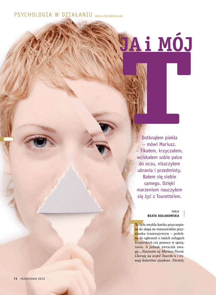 ps ychologi a w dz i ał aniu w w w.c har ak t e r y.e u T ja i mój Dotknąłem piekła – mówi Mariusz. – Tikałem, krzyczałem, wciskałem sobie palce do oczu, niszczyłem ubrania i przedmioty. Bałem się siebie samego. Dzięki marzeniom nauczyłem się żyć z Tourette’em. T tekst BEATA KOŁAKOWSKA To była zwykła kartka przyczepiona do słupa na warszawskim przystanku tramwajowym – podobna do ogłoszeń o tanich usługach fryzjerskich czy pomocy w sprzątaniu. A jednak zwracała uwagę: „Nazywam się Mariusz Nocoń. Choruję na zespół Tourette’a i trenuję kolarstwo zjazdowe. Niestety, 72 pa źdz ier nik 2012 ZD ROWIE po ostatnich zawodach mój rower jest w rozsypce. Być może ktoś wesprze mnie finansowo, bo chcę złożyć nowy, lżejszy rower (może taki, jaki ma Steve Peat) i znowu startować w zawodach”. Oni są wśród nas Jak się zachować, gdy spotkasz osobę z zespołem Tourette’a? Oto kilka rad: •Nie udawaj, że nie dostrzegasz jej tików. •Nie zwracaj uwagi na tiki, które ci osobiście nie przeszkadzają; wy mowne spojrzenia lub głośne ko mentarze tylko pogorszą sytuację i prawdopodobnie nasilą tiki. •Reaguj na zachowania, które są dla ciebie uciążliwe lub naruszają twoją przestrzeń osobistą; powiedz, że nie czujesz się z tym komfortowo, ale nie unikaj tej osoby. • Jeśli rozmawiasz z daną osobą, a u niej nagle ujawniają się tiki wo kalne, po prostu poczekaj, aż miną. Mariusz ma 32 lata, ciało odmawia mu posłuszeństwa od siedemnastu lat. − Miałem wszystkie książkowe objawy zespołu Toure tte’a – tiki wokalne i ruchowe. Dotknąłem piekła. Gorsze niż tiki były tylko zachowania obsesyjno-kompulsywne towarzyszące chorobie – wciskałem sobie palce do oczu, wystawiałem język, aż do powstawania krwotoków, niszczyłem ubrania i przedmioty. Choroba nieraz strącała mnie na dno. Nie wiedziałem, kim jestem, bałem się reakcji ludzi na moje objawy, bałem się siebie samego. Przy życiu trzymały mnie marzenia... Mariusz jest sportowcem, jeździ na rowerze. Nie męczy się szybko i ma większą odporność na ból i zimno. Jego idolem jest Steve Peat, mistrz świata w downhillu, ekstremalnym kolarstwie górskim. Mariusz naśladuje jego styl jazdy i sposób ubierania się. − Mam też inne zdolności: jestem kreatywny, robię oryginalne meble, umiem haftować i tworzyć wzorki-naklejki na rowery. Tourette daje i odbiera. Ja zyskałem talenty, ale jest mi trudno zarabiać pieniądze, problemem są też relacje z ludźmi. Polskie Stowarzyszenie Syndrom Tourette’a (PSST) przeprowadziło ankietę wśród 34 osób dotkniętych tą chorobą, czyli jak sami o sobie mówią: turetyków. – Wielu z nich potrafi kontrolować tiki, gdy są w pracy lub w szkole, ale muszą później ten wysiłek, wzrost napięcia po prostu wytikać. Największym problemem jest jednak (na podstawie materiałów Polskiego Stowarzyszenia Syndrom Tourette’a i publikacji Anity Bryńskiej i Tomasza Wolańczyka pt. „One są wśród nas”) znalezienie pracy, bo jej podjęcie zależy od natężenia objawów, obecności zaburzeń współtowarzyszących oraz podejścia ewentualnego pracodawcy – mówi Katarzyna Wróbel z PSST. www.pampa.com.pl NERWONAL BEZ REC EPTY W DOBR YCH APTEKA CH Produkt z∏o˝ony, krople doustne: Tradycyjnie jako Êrodek wspomagajàcy czynnoÊç serca i uk∏adu krà˝enia, w szczególnoÊci w stanach wzmo˝onego napi´cia nerwowego. Wzmo˝one napi´cie nerwowe mo˝e objawiaç si´ nadmiernà aktywnoÊcià psychoruchowà, dolegliwoÊciami ze strony przewodu pokarmowego, trudnoÊciami z zasypianiem oraz rozdra˝nieniem. Dla doros∏ych i dzieci powy˝ej 12 roku ˝ycia. Przeciwwskazania: Nie stosowaç u pacjentów z alkoholizmem. Ze wzgl´du na zawartoÊç etanolu nie zaleca si´ stosowania u kobiet ci´˝arnych, karmiàcych piersià, dzieci i u osób z wysokiego ryzyka, takich jak pacjenci z chorobà wàtroby lub padaczkà. Lek zawiera aspartam, który stanowi êród∏o fenyloalaniny. Nie stosowaç u pacjentów z fenyloketonurià. reklama FOTO shutterstock.com Być jak Steve Zdarza się, że niektórym osobom z zespołem Tourette’a tiki i natręctwa obsesyjno-kompulsywne uniemożliwiają adaptację w środowisku pracy. Mariusz pracował kiedyś jako stolarz. – Choć pracowałem lepiej, solidniej i szybciej niż inni, to zarabiałem najniższą krajową. Teraz jestem na rencie, ponieważ choroba postępuje. Tourette i te wszystkie natręctwa odebrały mi prawo do normalnego życia, założenia i utrzymania rodziny – wzdycha. Bywa, że nie może zrobić zakupów, bo jego zachowanie i gwałtowne ruchy budzą podejrzenie pracowników ochrony, że Mariusz chce coś ukraść. Gdy zaczyna tikać w miejscach publicznych, niektórzy ludzie uciekają na jego widok. Mariusz nauczył się już nie zwracać na to uwagi, zaakceptował swoją chorobę: – Całkowicie pochłonęło mnie kolarstwo zjazdowe, startuję w mistrzostwach Polski. Zjazdy to najszczęśliwsze minuty w moim życiu! Downhill jest tak trudnym technicznie sportem, że przez tę krótką, pełną skupienia chwilę zapominam całkowicie o chorobie. Podmiot odpowiedzialny: Laboratorium Farmaceutyczno-Kosmetyczne 05-500 Piaseczno, ul. KoÊciuszki 24, tel. / fax (022) 756 76 21 2012 pa źdz ier nik 73 Przed u˝yciem zapoznaj si´ z ulotkà, która zawiera wskazania, przeciwwskazania, dane dotyczàce dzia∏aƒ niepo˝àdanych i dawkowanie oraz informacje dotyczàce stosowania produktu leczniczego, bàdê skonsultuj si´ z lekarzem lub farmaceutà, gdy˝ ka˝dy lek niew∏aÊciwie stosowany zagra˝a Twojemu ˝yciu lub zdrowiu. PSYCHOLOGIA W D ZIAŁANIU w w w. c h a ra k t e r y. e u Katarzyna Honko rok temu wyszła za mąż. − A mąż nie wyobraża sobie życia z kimś innym niż ja. Tiki są, ale dla nas jakby nie istnieją. Do pełni szczęścia brakuje mi jedynie pracy i spełniania się w tym, co chcę robić – zapewnia Katarzyna. Pierwsze tiki poja