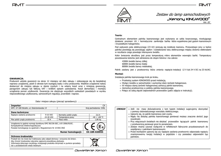 - Zestaw do lamp samochodowych „Xenon Xenony Xenony KINGWOOD” KINGWOOD Ver. 02 Teoria: Centralnym elementem palnika ksenonowego jest wykonana ze szkła kwarcowego, niwelującego działanie promieni UV i hermetycznie zamknięta bańka która wypełniona jest gazem ksenonowym i kryształkami halogenków. Pod wpływem pola elektrycznego (23 kV) jonizują się molekuły ksenonu. Przewodzące jony w bańce palnika powielają się powodując zapłon i wyładowanie łuku elektrycznego między dwiema elektrodami w rezultacie czego powstaje intensywne światło. Kolor świecenia określony jest przez temperaturę mikro elementów wewnątrz bańki. Temperatury powstawania kolorów jest odniesiona do stopni Kelvina i ma zakres: 4300K światło barwy Ŝółtej 6000K światło barwy białej 8000K światło barwy niebieskiej. Palnik zasilany jest z przetwornicy która zmienia napięcie instalacji 12 V lub 24 V DC na 23 kV/AC. MontaŜ: GWARANCJA. Producent udziela gwarancji na okres 12 miesięcy od daty zakupu i zobowiązuje się do bezpłatnej naprawy urządzenia, jeŜeli w okresie tym wystąpią wady z winy producenta. Wadliwe urządzenie naleŜy dostarczyć do miejsca zakupu w stanie czystym i na własny koszt wraz z niniejszą gwarancją, paragonem zakupu lub fakturą VAT i krótkim opisem uszkodzenia. Koszt demontaŜu i montaŜu urządzenia ponosi uŜytkownik. Gwarancja nie obejmuje wszystkich uszkodzeń powstałych w wyniku nieprawidłowego uŜytkowania, samowolnych regulacji, przeróbek i napraw. Instalacja palnika ksenonowego krok po kroku. • • • • • Przetestuj system KINGWOOD przed instalacją. Wyłącz światła w samochodzie i wymontuj stare Ŝarówki halogenowe. W miejsce starej Ŝarówki halogenowej zamocuj palnik ksenonowy. Zamontuj przetwornicę w pobliŜu palnika ksenonowego. Połącz ze sobą złączki odpowiednich przewodów (patrz zdjęcia w instrukcji). Data i miejsce zakupu (pieczęć sprzedawcy): …………………………………………. C4 Importer: AMT, 57-100 Strzelin, ul. DzierŜoniowska 14 Kraj pochodzenia: ChRL Dane techniczne: Napięcie zasilania przetwornic Max pobór prądu przetwornic 9-16 VDC 24-30 VDC 10 A Normalny pobór prądu Temperatura pracy Masa netto 3,6 A -40 ÷ +85 oC 1,86 kg Urządzenie to spełnia wymogi dyrektywy EMC 89/336 EEC, LVD 2006/95/EC. Kompatybilność Elektromagnetyczna Posiada homologację na zgodność z Regulaminem Nr 10 EKG ONZ Numer homologacji: E4-10R-020955 Ochrona środowiska UWAGA! • Jeśli nie masz doświadczenia z tym typem instalacji sugerujemy skorzystać z pomocy doświadczonego warsztatu elektrycznego. • Upewnij się, Ŝe palnik ksenonowy jest czysty. • Nigdy nie dotykaj palnika ksenonowego poniewaŜ moŜesz znacznie skrócić jego Ŝywotność. • Przy włączonych światłach nie dotykać przewodów łączących palnik ksenonowy z przetwornicą poniewaŜ grozi to poraŜeniem. • Zestaw moŜna uŜywać wyłącznie w reflektorach fabrycznie przystosowanych do współpracy z palnikami ksenonowymi. • Przed montaŜem upewnij się czy napięcie zasilania przetwornic odpowiada napięciu znamionowemu twojej instalacji w pojeździe i czy posiadasz odpowiedni typ palników. Produkt ten nie moŜe być traktowany jako odpad domowy i wrzucony do śmieci. Aby chronić środowiska naturalne zapewnij prawidłową utylizacje. Informacje dotyczące recyklingu niniejszego produktu otrzymasz w punkcie sprzedaŜy lub u przedstawicieli władz lokalnych. Oswietlenie Xenon Oswietlenie Xenon Wskazówki • • • W niektórych wersjach samochodów montaŜu palnika ksenonowego i przetwornicy moŜe wymagać wymontowania przedniej lampy bądź ściągnięcie przedniego zderzaka. W niektórych modelach samochodu montaŜ palnika ksenonowego moŜe wymagać zrobienia niewielkiego otworu w tylnej osłonie lampy przedniej w celu przeprowadzenia przez niego przewodów. Po wykonaniu takiego otworu i przeciągnięciu przewodów naleŜy uszczelnić otwór silikonem. Upewnij się, Ŝe wszystko jest odpowiednio połączone, a przewody nie są uszkodzone przed pierwszym uruchomieniem świateł. Eksploatacja: • Po pierwszym uruchomieniu wymagane jest prawidłowe ustawienie reflektorów! • Układ sterujący w przetwornicy jest w stanie się szybko dostosowywać do nowego trybu pracy, jednak jeśli to nie jest konieczne nie wyłączaj i nie włączaj lamp zbyt często. Takie przełączanie ma wpływ na skrócenie Ŝywotności palników i przetwornic. • Piszczenie po załączeniu świateł jest wywołane przez przetwornicę i jest to normalnym zjawiskiem. Piszczenie powinno zniknąć po około 2 sekundach. • Prąd wzbudzenia palnika ksenonowego jest większy od prądu jego normalnej pracy i moŜe wynieść 10 A, jest to normalne zjawisko, Jeśli akumulator jest uszkodzony lub nadmiernie rozładowany światła po włączeniu nie zaświecą się. NaleŜy je wyłączyć, naładować akumulator lub uruchomić pojazd i wówczas włączyć światła. • JeŜeli komputer twojego samochodu analizuje stan pracy Ŝarówek to po uruchomieniu systemu moŜe się okazać Ŝe komputer zgłosi uszkodzone Ŝarówki w reflektorach. W takim wypadku naleŜy zastosować moduł obciąŜenia wpięty przed zasilaniem przetwornicy. MoŜesz go zakupić u dystrybutora KINGWOOD w Polsce AMT. Oswietlenie Xenon Oswietlenie Xenon