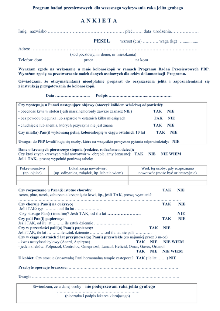 Program badań przesiewowych dla wczesnego wykrywania raka jelita grubego ANKIETA Imię, nazwisko ………………………………………….… płeć……. data urodzenia………………. PESEL wzrost (cm) ….……. waga (kg) ….............. Adres: ……………………………………………………………………………….……….………… (kod pocztowy, nr domu, nr mieszkania) Telefon: dom. ………………..…. praca ……..………………. nr kom.. ………….………………. Wyrażam zgodę na wykonanie u mnie kolonoskopii w ramach Programu Badań Przesiewowych PBP. Wyrażam zgodę na przetwarzanie moich danych osobowych dla celów dokumentacji Programu. Oświadczam, że otrzymałem(am) nieodpłatnie preparat do oczyszczenia jelita i zapoznałem(am) się z instrukcją przygotowania do kolonoskopii. Data …………………….. Podpis ………………………..……………… Czy występują u Pana/i następujące objawy (otoczyć kółkiem właściwą odpowiedź): - obecność krwi w stolcu (jeśli masz hemoroidy zawsze zaznacz NIE) TAK NIE - bez powodu biegunka lub zaparcie w ostatnich kilku miesiącach TAK NIE - chudnięcie lub anemia, których przyczyna nie jest znana TAK NIE Czy miał(a) Pan(i) wykonaną pełną kolonoskopię w ciągu ostatnich 10 lat TAK NIE Uwaga: do PBP kwalifikują się osoby, które na wszystkie powyższe pytania odpowiedziały: NIE Dane o krewnych pierwszego stopnia (rodzice, rodzeństwo, dzieci): Czy ktoś z tych krewnych miał nowotwór w obrębie jamy brzusznej: TAK Jeśli TAK, proszę wypełnić poniższą tabelę: Pokrewieństwo (np. ojciec) Lokalizacja nowotworu (np. odbytnica, żołądek, itp. lub nie wiem) NIE NIE WIEM Wiek tej osoby, gdy rozpoznano nowotwór (może być orientacyjnie) Czy rozpoznano u Pana(i) istotne choroby: TAK NIE serca, płuc, nerek, zaburzenia krzepnięcia krwi, itp., jeśli TAK, proszę wymienić: ………………………………………………………………………………………………………… Czy choruje Pan(i) na cukrzycę TAK NIE Jeśli TAK: typ ……….. od ilu lat ……………….. Czy stosuje Pan(i) insulinę? Jeśli TAK, od ilu lat ………………….. NIE Czy pali Pan(i) papierosy: TAK NIE Jeśli TAK, od ilu lat ………ile sztuk dziennie ………………………. Czy w przeszłości palił(a) Pan(i) papierosy: TAK NIE Jeśli TAK, ile lat ……….ile sztuk dziennie …………od ilu lat nie pali ………… Czy w ciągu ostatnich 5 lat przyjmował(a) Pan(i) przewlekle (co najmniej przez 3 m-ce): - kwas acetylosalicylowy (Acard, Aspiryna) TAK NIE NIE WIEM - jeden z leków: Polprazol, Controloc, Omeprazol, Lanzul, Helicid, Omar, Gasec, Ortanol TAK NIE NIE WIEM U kobiet: Czy stosuje (stosowała) Pani hormonalną terapię zastępczą? TAK (ile lat …….) NIE Przebyte operacje brzuszne: ……………………………………………………………………… Uwagi: ………………………………………………………………………………………………. Stwierdzam, że u danej osoby nie podejrzewam raka jelita grubego ……………………………………………………. (pieczątka i podpis lekarza kierującego) Program badań przesiewowych dla wczesnego wykrywania raka jelita grubego Edycja 2015 ANKIETA Dot. możliwości przeprowadzenia kolonoskopii w ramach Programu Badań Przesiewowych, mogących wykryć ewentualne polipy lub nowotwory jelita grubego osób bez objawów chorobowych Kolonoskopia to obejrzenie „od środka” całego jelita grubego za pomocą giętkiego instrumentu wprowadzonego przez odbyt. Do badania trzeba odpowiednio oczyścić jelito – dokłada instrukcja będzie udzielona po ustaleniu terminu badania. Badania wykonywane są przez bardzo doświadczonych lekarzy w: SALVE ZOZ sp. z o.o. 90-420 Łódź, ul. Andrzeja Struga 3 91-211 Łódź, ul. Szparagowa 10 Program finansowy jest przez Ministerstwo Zdrowia w ramach ogólnokrajowej akcji profilaktycznej. Kolonoskopia jest bezpłatna zarówno dla osób poddających się badaniu jak i lekarzy na nie kierujących. Do badań kwalifikują się: - wszystkie osoby w wieku 50-65 lat, bez objawów raka jelita grubego, - osoby w wieku 40-65 lat, bez objawów raka jelita grubego, które miały w rodzinie przynajmniej jednego krewnego pierwszego stopnia (rodzice, rodzeństwo, dzieci) z rakiem jelita grubego, - osoby w wieku 25-65 lat, pochodzące z rodziny HNPCC lub FAP. W tym przypadku konieczne jest skierowanie (potwierdzenie) z Poradni Genetycznej. Do badań nie kwalifikujemy osób, które miały badanie (kolonoskopię) w ciągu ostatnich 10 lat. Skierowaniem na badanie jest ankieta wypełniona przez osoby gotowe poddać się kolonoskopii, podpisana przez lekarza kierującego. Ankieta powinna trafić do Ośrodka realizującego program: SALVE ZOZ sp. z o.o. W razie pytań i wątpliwości proszę dzwonić w godzinach: pon – pt: 7.00-20.00, sob. 8.00-12.00 nr telefonu: 42 633 56 61, 42 633 78 01 2