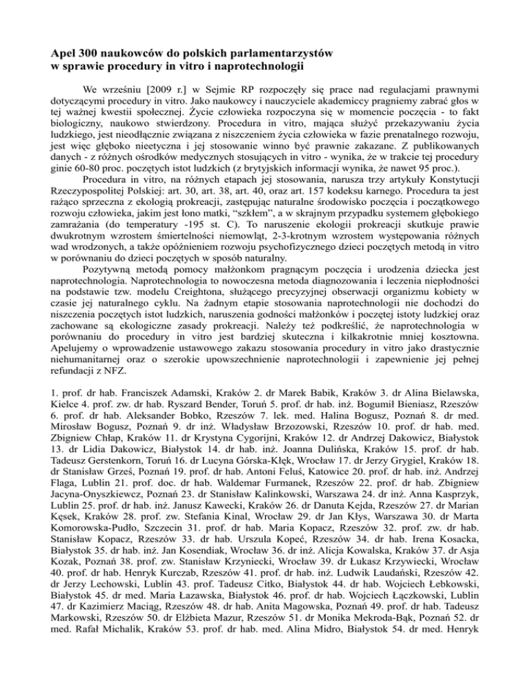 Apel 300 naukowców do polskich parlamentarzystów w sprawie procedury in vitro i naprotechnologii We wrześniu [2009 r.] w Sejmie RP rozpoczęły się prace nad regulacjami prawnymi dotyczącymi procedury in vitro. Jako naukowcy i nauczyciele akademiccy pragniemy zabrać głos w tej ważnej kwestii społecznej. Życie człowieka rozpoczyna się w momencie poczęcia - to fakt biologiczny, naukowo stwierdzony. Procedura in vitro, mająca służyć przekazywaniu życia ludzkiego, jest nieodłącznie związana z niszczeniem życia człowieka w fazie prenatalnego rozwoju, jest więc głęboko nieetyczna i jej stosowanie winno być prawnie zakazane. Z publikowanych danych - z różnych ośrodków medycznych stosujących in vitro - wynika, że w trakcie tej procedury ginie 60-80 proc. poczętych istot ludzkich (z brytyjskich informacji wynika, że nawet 95 proc.). Procedura in vitro, na różnych etapach jej stosowania, narusza trzy artykuły Konstytucji Rzeczypospolitej Polskiej: art. 30, art. 38, art. 40, oraz art. 157 kodeksu karnego. Procedura ta jest rażąco sprzeczna z ekologią prokreacji, zastępując naturalne środowisko poczęcia i początkowego rozwoju człowieka, jakim jest łono matki, “szkłem”, a w skrajnym przypadku systemem głębokiego zamrażania (do temperatury -195 st. C). To naruszenie ekologii prokreacji skutkuje prawie dwukrotnym wzrostem śmiertelności niemowląt, 2-3-krotnym wzrostem występowania różnych wad wrodzonych, a także opóźnieniem rozwoju psychofizycznego dzieci poczętych metodą in vitro w porównaniu do dzieci poczętych w sposób naturalny. Pozytywną metodą pomocy małżonkom pragnącym poczęcia i urodzenia dziecka jest naprotechnologia. Naprotechnologia to nowoczesna metoda diagnozowania i leczenia niepłodności na podstawie tzw. modelu Creightona, służącego precyzyjnej obserwacji organizmu kobiety w czasie jej naturalnego cyklu. Na żadnym etapie stosowania naprotechnologii nie dochodzi do niszczenia poczętych istot ludzkich, naruszenia godności małżonków i poczętej istoty ludzkiej oraz zachowane są ekologiczne zasady prokreacji. Należy też podkreślić, że naprotechnologia w porównaniu do procedury in vitro jest bardziej skuteczna i kilkakrotnie mniej kosztowna. Apelujemy o wprowadzenie ustawowego zakazu stosowania procedury in vitro jako drastycznie niehumanitarnej oraz o szerokie upowszechnienie naprotechnologii i zapewnienie jej pełnej refundacji z NFZ. 1. prof. dr hab. Franciszek Adamski, Kraków 2. dr Marek Babik, Kraków 3. dr Alina Bielawska, Kielce 4. prof. zw. dr hab. Ryszard Bender, Toruń 5. prof. dr hab. inż. Bogumił Bieniasz, Rzeszów 6. prof. dr hab. Aleksander Bobko, Rzeszów 7. lek. med. Halina Bogusz, Poznań 8. dr med. Mirosław Bogusz, Poznań 9. dr inż. Władysław Brzozowski, Rzeszów 10. prof. dr hab. med. Zbigniew Chłap, Kraków 11. dr Krystyna Cygorijni, Kraków 12. dr Andrzej Dakowicz, Białystok 13. dr Lidia Dakowicz, Białystok 14. dr hab. inż. Joanna Dulińska, Kraków 15. prof. dr hab. Tadeusz Gerstenkorn, Toruń 16. dr Lucyna Górska-Kłęk, Wrocław 17. dr Jerzy Grygiel, Kraków 18. dr Stanisław Grześ, Poznań 19. prof. dr hab. Antoni Feluś, Katowice 20. prof. dr hab. inż. Andrzej Flaga, Lublin 21. prof. doc. dr hab. Waldemar Furmanek, Rzeszów 22. prof. dr hab. Zbigniew Jacyna-Onyszkiewcz, Poznań 23. dr Stanisław Kalinkowski, Warszawa 24. dr inż. Anna Kasprzyk, Lublin 25. prof. dr hab. inż. Janusz Kawecki, Kraków 26. dr Danuta Kejda, Rzeszów 27. dr Marian Kęsek, Kraków 28. prof. zw. Stefania Kinal, Wrocław 29. dr Jan Kłys, Warszawa 30. dr Marta Komorowska-Pudło, Szczecin 31. prof. dr hab. Maria Kopacz, Rzeszów 32. prof. zw. dr hab. Stanisław Kopacz, Rzeszów 33. dr hab. Urszula Kopeć, Rzeszów 34. dr hab. Irena Kosacka, Białystok 35. dr hab. inż. Jan Kosendiak, Wrocław 36. dr inż. Alicja Kowalska, Kraków 37. dr Asja Kozak, Poznań 38. prof. zw. Stanisław Krzyniecki, Wrocław 39. dr Łukasz Krzywiecki, Wrocław 40. prof. dr hab. Henryk Kurczab, Rzeszów 41. prof. dr hab. inż. Ludwik Laudański, Rzeszów 42. dr Jerzy Lechowski, Lublin 43. prof. Tadeusz Citko, Białystok 44. dr hab. Wojciech Łebkowski, Białystok 45. dr med. Maria Łazawska, Białystok 46. prof. dr hab. Wojciech Łączkowski, Lublin 47. dr Kazimierz Maciąg, Rzeszów 48. dr hab. Anita Magowska, Poznań 49. prof. dr hab. Tadeusz Markowski, Rzeszów 50. dr Elżbieta Mazur, Rzeszów 51. dr Monika Mekroda-Bąk, Poznań 52. dr med. Rafał Michalik, Kraków 53. prof. dr hab. med. Alina Midro, Białystok 54. dr med. Henryk Midro, Białystok 55. dr hab. Grzegorz Musiał, Poznań 56. dr Barbara Muśnicka, Poznań 57. prof. dr hab. Czesław Muśnicki, Poznań 58. prof. dr hab. Edward Nieznański, Warszawa 59. dr Lucyna Nowak, Kraków 60. dr Józef Nowicki, Wrocław 61. dr hab. Andrzej Ochocki, Warszawa 62. dr hab. Teresa Olearczyk, Kraków 63. prof. zw. dr hab. Gustaw Ostasz, Rzeszów 64. prof. dr hab. Edward Ozimek, Poznań 65. dr Janusz Pasterski, Rzeszów 66. dr Stanisław Paszkowski, Wrocław 67. prof. dr hab. Maria Piskornik, Kraków 68. prof. dr hab. Zdzisław Piskornik, Kraków 69. dr med. dr h.c. Wanda Półtawska, Kraków 70. dr Barbara Półtorak, Rzeszów 71. dr hab. Michał Pryszmont, Białystok 72. dr hab. med. Teresa Reduta, Białystok 73. dr hab. Mieczysław Ryba, Toruń 74. prof. dr hab. Maria Ryś, Warszawa 75. prof. dr hab. med. Maria Sobaniec-Łotowska, Białystok 76. prof. dr hab. Marek Stanisz, Rzeszów 77. prof. dr hab. Anna Stankowska, Poznań 78. prof. zw. dr hab. Wojciech Stankowski, Poznań 79. dr Rafał Staszewski, Poznań 80. dr Wiesława Stefan, Wrocław 81. dr inż. Stanisław Szela, Rzeszów 82. prof. zw. dr hab. Kazimierz Stępczak, Poznań 83. dr Anna Szuba-Trznadel, Wrocław 84. prof. dr hab. Agnieszka Szyszkowska, Wrocław 85. dr Krystyna Śmietało, Białystok 86. dr med. Wanda Terlecka, Częstochowa 87. dr hab. Piotr Tomaszek, Poznań 88. dr Marek Mariusz Tytko, Krakó