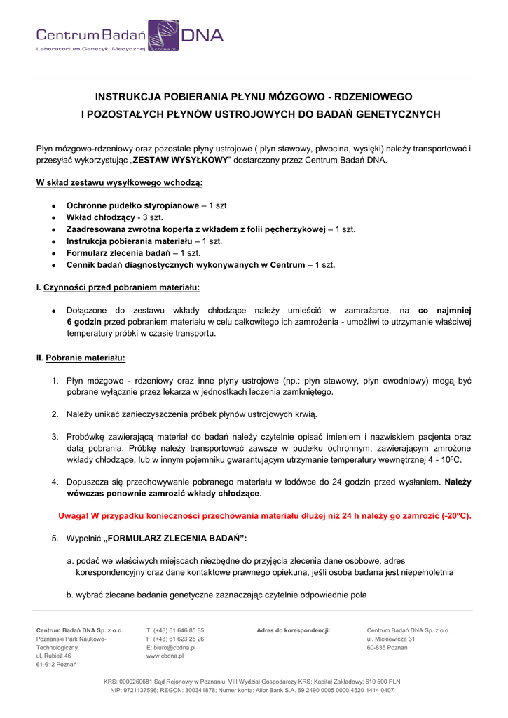 INSTRUKCJA POBIERANIA PŁYNU MÓZGOWO - RDZENIOWEGO I POZOSTAŁYCH PŁYNÓW USTROJOWYCH DO BADAŃ GENETYCZNYCH Płyn mózgowo-rdzeniowy oraz pozostałe płyny ustrojowe ( płyn stawowy, plwocina, wysięki) należy transportować i przesyłać wykorzystując „ZESTAW WYSYŁKOWY” dostarczony przez Centrum Badań DNA. W skład zestawu wysyłkowego wchodzą: Ochronne pudełko styropianowe – 1 szt Wkład chłodzący - 3 szt. Zaadresowana zwrotna koperta z wkładem z folii pęcherzykowej – 1 szt. Instrukcja pobierania materiału – 1 szt. Formularz zlecenia badań – 1 szt. Cennik badań diagnostycznych wykonywanych w Centrum – 1 szt. I. Czynności przed pobraniem materiału: Dołączone do zestawu wkłady chłodzące należy umieścić w zamrażarce, na co najmniej 6 godzin przed pobraniem materiału w celu całkowitego ich zamrożenia - umożliwi to utrzymanie właściwej temperatury próbki w czasie transportu. II. Pobranie materiału: 1. Płyn mózgowo - rdzeniowy oraz inne płyny ustrojowe (np.: płyn stawowy, płyn owodniowy) mogą być pobrane wyłącznie przez lekarza w jednostkach leczenia zamkniętego. 2. Należy unikać zanieczyszczenia próbek płynów ustrojowych krwią. 3. Probówkę zawierającą materiał do badań należy czytelnie opisać imieniem i nazwiskiem pacjenta oraz datą pobrania. Próbkę należy transportować zawsze w pudełku ochronnym, zawierającym zmrożone wkłady chłodzące, lub w innym pojemniku gwarantującym utrzymanie temperatury wewnętrznej 4 - 10ºC. 4. Dopuszcza się przechowywanie pobranego materiału w lodówce do 24 godzin przed wysłaniem. Należy wówczas ponownie zamrozić wkłady chłodzące. Uwaga! W przypadku konieczności przechowania materiału dłużej niż 24 h należy go zamrozić (-20ºC). 5. Wypełnić „FORMULARZ ZLECENIA BADAŃ”: a. podać we właściwych miejscach niezbędne do przyjęcia zlecenia dane osobowe, adres korespondencyjny oraz dane kontaktowe prawnego opiekuna, jeśli osoba badana jest niepełnoletnia b. wybrać zlecane badania genetyczne zaznaczając czytelnie odpowiednie pola Centrum Badań DNA Sp. z o.o. Poznański Park NaukowoTechnologiczny ul. Rubież 46 61-612 Poznań T: (+48) 61 646 85 85 F: (+48) 61 623 25 26 E: [email protected] www.cbdna.pl Adres do korespondencji: Centrum Badań DNA Sp. z o.o. ul. Mickiewicza 31 60-835 Poznań KRS: 0000260681 Sąd Rejonowy w Poznaniu, VIII Wydział Gospodarczy KRS; Kapitał Zakładowy: 610 500 PLN NIP: 9721137596; REGON: 300341878; Numer konta: Alior Bank S.A. 69 2490 0005 0000 4520 1414 0407 c. UWAGA! podpis osoby zlecającej (pacjenta) jest niezbędny do przyjęcia zlecenia na wykonanie badań. 6. Pudełko zawierające próbkę do badań umieścić w kopercie z wkładem pęcherzykowym wraz z wypełnionym formularzem zlecenia (opatrzonym podpisem osoby poddanej badaniu). Uwaga! Podpis osoby zlecającej (pacjenta) jest niezbędny do przyjęcia zlecenia na wykonanie badań. 7. Dokonać opłaty za zlecane badania zgodnie z cennikiem. Opłaty można dokonać w dowolnym Urzędzie Pocztowym lub oddziale banku na nr konta 69 2490 0005 0000 4520 1414 0407 Honorujemy również wydruki potwierdzenia przelewu wykonanego przez kanał internetowy przesłane pocztą, faksem lub pocztą elektroniczną III. Wysyłka próbek do badania: Pobrany materiał należy wysłać pocztą kurierską DHL na koszt odbiorcy na adres: NZOZ Laboratorium Genetyki Medycznej Centrum Badań DNA, ul. Mickiewicza 31, 60-835 Poznań W tym celu należy telefonicznie zgłosić odbiór przesyłki kurierskiej z materiałem biologicznym bezpośrednio do działu przesyłek medycznych pod numerem telefonu 42 6 345 345 oraz uzgodnić czas i miejsce odbioru przesyłki przez kuriera. Podczas zgłoszenia telefonicznego należy powołać się na numer klienta Centrum Badań DNA: 2361973, co jest warunkiem dostarczenia przesyłki na koszt odbiorcy. UWAGA! Prosimy o nadawanie przesyłek kurierskich wyłącznie w wersji DHL materiał biologiczny. Centrum nie pokrywa kosztów innych typów przesyłek (np. DHL Domestic 12:00 Express, DHL Domestic 9:00 Express), w takich przypadkach koszt ponosi NADAWCA. Przesyłki należy nadawać od poniedziałku do czwartku. Centrum Badań DNA Sp. z o.o. Poznański Park NaukowoTechnologiczny ul. Rubież 46 61-612 Poznań T: (+48) 61 646 85 85 F: (+48) 61 623 25 26 E: [email protected] www.cbdna.pl Adres do korespondencji: Centrum Badań DNA Sp. z o.o. ul. Mickiewicza 31 60-835 Poznań KRS: 0000260681 Sąd Rejonowy w Poznaniu, VIII Wydział Gospodarczy KRS; Kapitał Zakładowy: 610 500 PLN NIP: 9721137596; REGON: 300341878; Numer konta: Alior Bank S.A. 69 2490 0005 0000 4520 1414 0407
