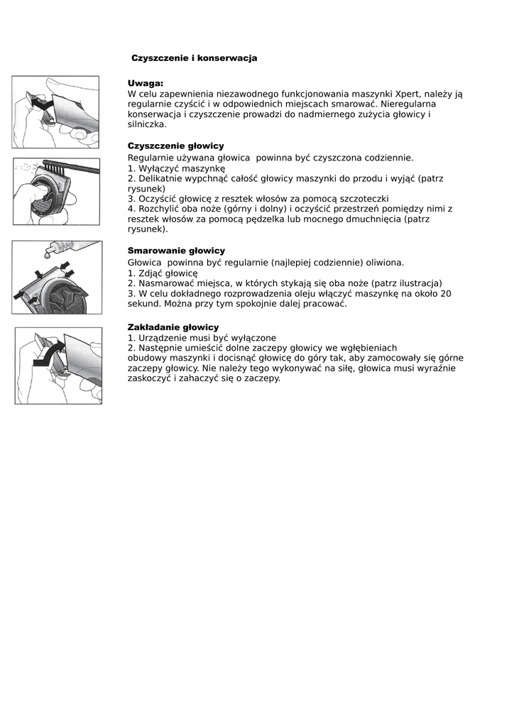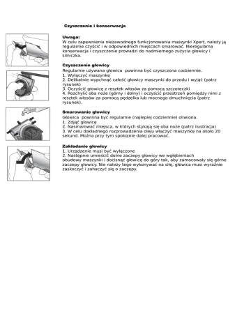 Czyszczenie i konserwacja Uwaga: W celu zapewnienia niezawodnego funkcjonowania maszynki Xpert, należy ją regularnie czyścić i w odpowiednich miejscach smarować. Nieregularna konserwacja i czyszczenie prowadzi do nadmiernego zużycia głowicy i silniczka. Czyszczenie głowicy Regularnie używana głowica powinna być czyszczona codziennie. 1. Wyłączyć maszynkę 2. Delikatnie wypchnąć całość głowicy maszynki do przodu i wyjąć (patrz rysunek) 3. Oczyścić głowicę z resztek włosów za pomocą szczoteczki 4. Rozchylić oba noże (górny i dolny) i oczyścić przestrzeń pomiędzy nimi z resztek włosów za pomocą pędzelka lub mocnego dmuchnięcia (patrz rysunek). Smarowanie głowicy Głowica powinna być regularnie (najlepiej codziennie) oliwiona. 1. Zdjąć głowicę 2. Nasmarować miejsca, w których stykają się oba noże (patrz ilustracja) 3. W celu dokładnego rozprowadzenia oleju włączyć maszynkę na około 20 sekund. Można przy tym spokojnie dalej pracować. Zakładanie głowicy 1. Urządzenie musi być wyłączone 2. Następnie umieścić dolne zaczepy głowicy we wgłębieniach obudowy maszynki i docisnąć głowicę do góry tak, aby zamocowały się górne zaczepy głowicy. Nie należy tego wykonywać na siłę, głowica musi wyraźnie zaskoczyć i zahaczyć się o zaczepy.