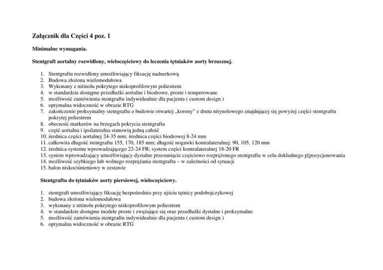 Załącznik dla Części 4 poz. 1 Minimalne wymagania. Stentgraft aortalny rozwidlony, wieloczęściowy do leczenia tętniaków aorty brzusznej. 1. 2. 3. 4. 5. 6. 7. Stentgraftu rozwidlony umożliwiający fiksację nadnerkową Budowa złożona wielomodułowa Wykonany z nitinolu pokrytego niskoprofilowym poliestrem w standardzie dostępne przedłużki aortalne i biodrowe, proste i temperowane możliwość zamówienia stentgraftu indywidualnie dla pacjenta ( custom design ) optymalna widoczność w obrazie RTG zakończenie proksymalny stentgraftu o budowie otwartej „korony” z drutu nitynolowego znajdującej się powyżej części stentgraftu pokrytej poliestrem 8. obecność markerów na brzegach pokrycia stentgraftu 9. część aortalna i ipsilateralna stanowią jedną całość 10. średnica części aortalnej 24-35 mm; średnica części biodrowej 8-24 mm 11. całkowita długość stentgraftu 155, 170, 185 mm; długość nogawki kontralateralnej: 90, 105, 120 mm 12. średnica systemu wprowadzającego 22-24 FR; system części kontralateralnej 18-20 FR 13. system wprowadzający umożliwiający dystalne przesunięcie częściowo rozprężonego stentgraftu w celu dokładnego p[pozycjonowania 14. możliwość szybkiego lub wolnego rozprężania stentgraftu – w zależności od sytuacji 15. balon niskociśnieniowy w zestawie Stentgraftu do tętniaków aorty piersiowej, wieloczęściowy. 1. 2. 3. 4. 5. 6. stentgraft umożliwiający fiksację bezpośrednio przy ujściu tętnicy podobojczykowej budowa złożona wielomodułowa wykonany z nitinolu pokrytego niskoprofilowym poliestrem w standardzie dostępne modele proste i zwężające się oraz przedłużki dystalne i proksymalne możliwość zamówienia stentgraftu indywidualnie dla pacjenta ( custom design ) optymalna widoczność w obrazie RTG 7. zakończenie proksymalny stentgraftu o budowie otwartej „korony” z drutu nitynolowego znajdującej się powyżej części stentgraftu pokrytej poliestrem 8. obecność markerów na brzegach pokrycia stentgraftu 9. średnica stentgraftu 22-46 mm ( części proste); 26-46 ( części zwężające się); 10. system wprowadzający umożliwiający bezpieczne dostarczanie stentgraftu do worka tętniaka oraz kontrolę szybkości uwalniania stentgraftu, średnica systemu wprowadzającego 22-25 FR 11. system wprowadzający umożliwiający dystalne przesunięcie częściowo rozprężonego stentgraftu w celu dokładnego pozycjonowania 12. możliwość szybkiego lub wolnego rozprężania stentgraftu – w zależności od sytuacji 13. balon niskociśnieniowy w zestawie …………………………………………………………………………………………. ( podpis i imienna pieczęć upoważnionego przedstawiciela Wykonawcy Załącznik dla Części 4 poz. 2 Minimalne wymagania. 1. stent-graft z pokryciem poliestrowym z tkanki stosowanej do produkcji protez naczyniowych Vasku-tek. Stent zbudowany jest na bazie Z-stentu stalowego dającego poszczególnym segmentom optymalną siłę rozprężania przy dużej wytrzymałości radialnej 2. segmenty stentu zespolone tkaniną pokrywającą stanowią całość przy ogólnym założeniu, że pokrycie znajduje się wewnątrz konstrukcji graftu, poza miejscami fiksacji w odcinku Dystalny i proksymalnym, gdzie powleczone od zewnątrz segmenty uszczelniają całą konstrukcję 3. stent składa się z trzech części: body – główna część graftu, nogawki kontralateralne – przedłużającej krótszą nogawkę body i ipsilateralnej – przedłużającą dłuższą nogawkę body lub możliwość dostawy w wersji uniiliac lub prostej z fiksacją nadnerkową 4. stent posiada fiksację nadnerkową za pomocą wolnego Z-et segmentu o długości 35mm wyposażonego w haki zapewniające trwałe umiejscowienie stent-graftu w szyi tętniaka 5. stent- graft oferowany jest w rozmiarach: rozmiar szyi 22, 24, 26, 30, 36 mm (większe w wersji custom-made), rozmiar nogawek 8, 10, 12, 14, 16, 18, 20, 22, 24mm przy długościach 37, 54, 71, 88, 105, 122 mm 6. dostarczony jest w formie załadowanej do systemu wprowadzającego o średnicy 18-21 F (body) i 14-16F (nogawki) 7. introducer wyposażony jest w dilatator i koszulkę naczyniową integralna czescia zestawu 8. w skład zestawu wchodzi: trzyczęściowy stent-graft (body i dwie nogawki) zapakowane w system wprowadzający z koszulkami w 9. komplecie. Stentgraft do aorty piersiowej jedno lub wieloczęściowy z kompletnym zestawem do implantacji o następującej charakterystyce: 1. posiada pokrycie poliestrowe z tkaniny stosowanej do produkcji protez naczyniowych.Stent zbudowany jest na bazie stalowego Z-stentu dającego poszczególnym segmentom optymalną siłę rozprężania przy dużej wytrzymałości radialnej . 2. posiada kolce fiksujące na proksymalnej części uszczelniającej . 3. część dystalna posiada wolny , nie pokryty koniec z kolcami fiksującymi 4. dostępne wymiary 22, 24, 26, 28, 30, 32, 34, 36, 38, 40, 42 mm średnicy 5. długości 75 do 225 mm . (maksymalna długość uzyskana z dwóch części to 380 mm 6. stent może być dostarczony w wersji segmentowej i jednoczęściowej . 7. system posiada introducer z możliwością kontrolowanego uwalniania części dystalnej jak i proksymalnej (uwalniane części proksymalnej za pomocą oddzielnego cięgna podczas pozycjonowania proksymalnej części graftu ) , zbrojoną pokrytą hydrofilnie koszulkę z zastawką redukcyjną pracującą w zakresie średnic ,035 cala do 22F . …………………………………………………………………………………………. ( podpis i imienna pieczęć upoważnionego przedstawiciela Wykonawcy Załącznik dla Części 4 poz. 3 Minimalne wymagania. 1. 2. 3. 4. 5. 6. 7. 8. część aortalna i biodrowa wykonane są z drutu nitinolowego pokryte od wewnątrz materiałem PTFE sposób łączenia szkieletu /drutu/ z materiałem pokrywającym – spoiny laminowane /brak szwów/ system podnerkowy, wieloczęśc