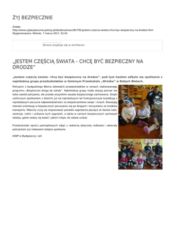 ŻYJ BEZPIECZNIE Źródło: http://www.zyjbezpiecznie.policja.pl/zb/aktualnosci/81705,Jestem-czescia-swiata-chce-byc-bezpieczny-na-drodze.html Wygenerowano: Wtorek, 7 marca 2017, 01:01 Strona znajduje się w archiwum. „JESTEM CZĘŚCIĄ ŚWIATA - CHCĘ BYĆ BEZPIECZNY NA DRODZE” „Jestem częścią świata- chcę być bezpieczny na drodze”- pod tym hasłem odbyło się spotkanie z najmłodszą grupa przedszkolaków w Gminnym Przedszkolu „Wróżka” w Białych Błotach. Policjanci z bydgoskiego Błonia odwiedzili przedszkolaków w ramach realizowanego programu „Bezpieczna droga do szkoły”. Najmłodsze grupy miały okazję poznać nie tylko zawód policjanta, ale przede wszystkim zasady bezpiecznego zachowania. Dzięki cyklicznym spotkaniom z dziećmi już od najmłodszych lat funkcjonariusze kształtują u najmłodszych poczucie odpowiedzialności za bezpieczeństwo swoje i innych. Rozwijają również orientację w bezpiecznym poruszaniu się po drogach i korzystaniu ze środków transportu. Maluchy uczą się rozpoznawać ponadto zagrożenia płynące ze świata ludzi, zwierząt, roślin i unikania tych zagrożeń, a także w ramach bezpiecznych zachowań wiedzą, gdzie należy się bawić i jakich miejsc do zabaw unikać. Przedszkolaki oprócz pamiątkowych zdjęć z radością obejrzały radiowóz i obiecały policjantom już niebawem kolejne spotkanie. (KWP w Bydgoszczy / pt) Ocena: 5/5 (1) Tweetnij
