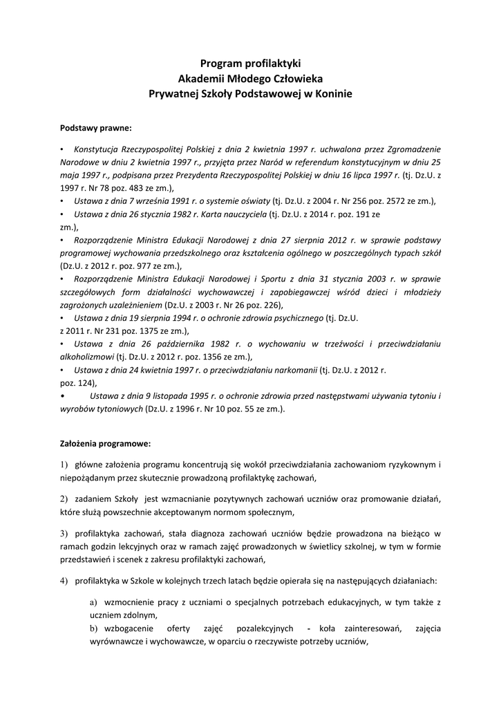 Program profilaktyki Akademii Młodego Człowieka Prywatnej Szkoły Podstawowej w Koninie Podstawy prawne: • Konstytucja Rzeczypospolitej Polskiej z dnia 2 kwietnia 1997 r. uchwalona przez Zgromadzenie Narodowe w dniu 2 kwietnia 1997 r., przyjęta przez Naród w referendum konstytucyjnym w dniu 25 maja 1997 r., podpisana przez Prezydenta Rzeczypospolitej Polskiej w dniu 16 lipca 1997 r. (tj. Dz.U. z 1997 r. Nr 78 poz. 483 ze zm.), • Ustawa z dnia 7 września 1991 r. o systemie oświaty (tj. Dz.U. z 2004 r. Nr 256 poz. 2572 ze zm.), • Ustawa z dnia 26 stycznia 1982 r. Karta nauczyciela (tj. Dz.U. z 2014 r. poz. 191 ze zm.), • Rozporządzenie Ministra Edukacji Narodowej z dnia 27 sierpnia 2012 r. w sprawie podstawy programowej wychowania przedszkolnego oraz kształcenia ogólnego w poszczególnych typach szkół (Dz.U. z 2012 r. poz. 977 ze zm.), • Rozporządzenie Ministra Edukacji Narodowej i Sportu z dnia 31 stycznia 2003 r. w sprawie szczegółowych form działalności wychowawczej i zapobiegawczej wśród dzieci i młodzieży zagrożonych uzależnieniem (Dz.U. z 2003 r. Nr 26 poz. 226), • Ustawa z dnia 19 sierpnia 1994 r. o ochronie zdrowia psychicznego (tj. Dz.U. z 2011 r. Nr 231 poz. 1375 ze zm.), • Ustawa z dnia 26 października 1982 r. o wychowaniu w trzeźwości i przeciwdziałaniu alkoholizmowi (tj. Dz.U. z 2012 r. poz. 1356 ze zm.), • Ustawa z dnia 24 kwietnia 1997 r. o przeciwdziałaniu narkomanii (tj. Dz.U. z 2012 r. poz. 124), • Ustawa z dnia 9 listopada 1995 r. o ochronie zdrowia przed następstwami używania tytoniu i wyrobów tytoniowych (Dz.U. z 1996 r. Nr 10 poz. 55 ze zm.). Założenia programowe: 1) główne założenia programu koncentrują się wokół przeciwdziałania zachowaniom ryzykownym i niepożądanym przez skutecznie prowadzoną profilaktykę zachowań, 2) zadaniem Szkoły jest wzmacnianie pozytywnych zachowań uczniów oraz promowanie działań, które służą powszechnie akceptowanym normom społecznym, 3) profilaktyka zachowań, stała diagnoza zachowań uczniów będzie prowadzona na bieżąco w ramach godzin lekcyjnych oraz w ramach zajęć prowadzonych w świetlicy szkolnej, w tym w formie przedstawień i scenek z zakresu profilaktyki zachowań, 4) profilaktyka w Szkole w kolejnych trzech latach będzie opierała się na następujących działaniach: a) wzmocnienie pracy z uczniami o specjalnych potrzebach edukacyjnych, w tym także z uczniem zdolnym, b) wzbogacenie oferty zajęć pozalekcyjnych - koła zainteresowań, zajęcia wyrównawcze i wychowawcze, w oparciu o rzeczywiste potrzeby uczniów, 5) c) wspomaganie rozwoju moralnego uczniów (poszanowanie norm, wartości i autorytetów), d) stwarzanie uczniom warunków do rozwijania własnych zainteresowań i zagospodarowanie wolnego czasu uczniów zajęciami pozalekcyjnymi, e) wspomaganie rodziców w prawidłowym pełnieniu przez nich funkcji wychowawczych; Szkoła podejmie współpracę z następującymi instytucjami: a) placówki kulturalno-oświatowe (ośrodki kultury, biblioteka publiczna, kino, teatr, muzea i inne): • uczestnictwo w spektaklach teatralnych o charakterze profilaktycznym, • udział w spotkaniach poświęconych problemom zdrowotnym, • udział w konkursach organizowanych przez placówki kulturalno-oświatowe, b) poradnia psychologiczno-pedagogiczna: • pomoc uczniom przejawiającym trudności w zachowaniu i nauce, • udzielanie pomocy rodzinom znajdującym się, w szeroko rozumianej, trudnej sytuacji życiowej ( oczekujących pomocy ) • udział w spotkaniach organizowanych przez psychologów, pedagogów, lekarzy specjalistów, policję, strażaków, ratowników medycznych; Cele programu: 1) dbałość o zapewnienie uczniom bezpiecznych warunków nauki, 2) systematyczne diagnozowanie zachowań uczniów, w szczególności zachowań ryzykownych, 3) wzmacnianie pozytywnych zachowań uczniów, dostarczanie przykładów właściwych postaw, 4) zwracanie uwagi na kulturalne zachowania, 5) zapobieganie i prowadzenie profilaktyki uzależnień , 6) zapobieganie nadmiernemu spędzaniu czasu przy komputerze, przestrzeganie przed cyberprzemocą, 7) promowanie zdrowego trybu życia, 8) promowanie zdrowej żywności, 9) utrwalenie postaw i zachowań społecznych warunkujących prawidłowy rozwój. Cele szczegółowe: 1) wypracowanie szkolnego kodeksu dobrego zachowania, 2) poznawanie zasad savoir-vivre'u w praktyce, 3) systematyczne uświadamianie uczniom szkodliwości używania wulgaryzmów, 4) promowanie szacunku do języka ojczystego, 5) przeprowadzenie cyklu lekcji wychowawczych poświęconych szkodliwości zachowań ryzykownych, w tym wszelkim przejawom przemocy i agresji, 6) realizacja zajęć poświęconych szkodliwości używek, 7) zorganizowanie zajęć pozalekcyjnych, rozwijających zainteresowania i pasje uczniowskie, przeprowadzenie diagnozy potrzeb, 2 8) przeprowadzenie zajęć dotyczących cyberprzemocy, szkodliwości nadmiernego spędzania czasu przy komputerze, 9) kształtowanie postaw tolerancji wobec inności, zasad demokracji, sprawiedliwości społecznej i zasad moralnych, 10) doskonalenie umiejętność efektywnej komunikacji, podejmowania decyzji oraz radzenia sobie ze stresem, 11) budowanie własnego wizerunku i wiary we własne możliwości, 12) zdobywanie wiedzy o zdrowym trybie życia, 13) rozwijanie umiejętności interpersonalnych, asertywności, empatii, rozładowania negatywnych emocji, 14) kształcenie umiejętności radzenia sobie w sytuacjach konfliktowych, 15) wspieranie rodziców w procesie wychowania uczniów, przeprowadzenie pogadanek, szkoleń, warsztatów, w szczególności dotyczących trudnych zachowań dzieci i młodzieży. Metody i formy pracy: 1) metody aktywizujące: drzewko decyzyjne, rybi szkielet, mapa mentalna, scenki dramowe, debaty, dyskusje, panele dyskusyjne, wykorzystanie literatury, filmów i spektakli profilaktycznych, plakaty, gry dydaktyczne, symulacje, 2) praca w grupach, zespołach, parach, praca indywidualna, 