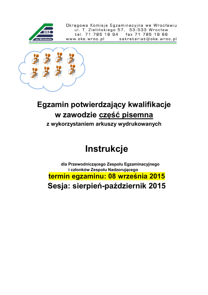 Egzamin potwierdzający kwalifikacje w zawodzie część pisemna z wykorzystaniem arkuszy wydrukowanych Instrukcje dla Przewodniczącego Zespołu Egzaminacyjnego i członków Zespołu Nadzorującego termin egzaminu: 08 września 2015 Sesja: sierpień-październik 2015 OKE we Wrocławiu Egzamin potwierdzający kwalifikacje w zawodzie – CZĘŚĆ PISEMNA sierpień-październik 2015 SPIS TREŚCI: 1. 2. Oznakowanie materiałów egzaminacyjnych ................................................ Dystrybucja materiałów egzaminacyjnych.................................................. 3 3 3. Zadania Przewodniczącego Zespołu Egzaminacyjnego ........................... 4 4. Zadania Przewodniczącego i członków Zespołu Nadzorującego ………. 8 5. Wzory opisu kopert z dokumentacją egzaminacyjną ................................. 12 6. Przekazanie materiałów egzaminacyjnych do OKE ................................... 12 7. Postępowanie w sytuacjach szczególnych ................................................. 13 8. Wyniki ............................................................................................................. 14 9. Kodowanie kart odpowiedzi .......................................................................... 15 10. Przykładowy zestaw kodów kreskowych dla zdającego ............................ 17 Instrukcje zostały opracowane na podstawie Rozporządzenia Ministra Edukacji Narodowej z dnia 27 kwietnia 2015 r. w sprawie szczegółowych warunków i sposobu przeprowadzania egzaminu potwierdzającego kwalifikacje w zawodzie (Dz.U. z 14 maja 2015 r. Nr 673.) oraz „Informacji o sposobie organizacji i przeprowadzania egzaminu potwierdzającego kwalifikacje w zawodzie obowiązująca w roku szkolnym 2015/2016”. Obowiązują druki dokumentacji znajdujące się w załącznikach do Informacji o sposobie.... – dostępne na stronie www.oke.wroc.pl zakładka Nowy Egzamin zawodowy/Organizacja Telefony kontaktowe do OKE: Wydział Egzaminów Zawodowych: 71/785-18- 67; -75; - 81; fax:71/785-18-81 Wydział Badań i Analiz: 71/785-18-91; - 71 (dostosowania, dystrybucja, dokumentacja, przekazanie materiałów egzaminacyjnych do OKE) 2 OKE we Wrocławiu Egzamin potwierdzający kwalifikacje w zawodzie – CZĘŚĆ PISEMNA sierpień-październik 2015 1. OZNAKOWANIE MATERIAŁÓW EGZAMINACYJNYCH Oznaczenie kwalifikacji – wersja arkusza – rok. miesiąc rozpoczęcia egzaminów rok Z.05 miesiąc – X – 15.08 oznaczenie kwalifikacji wersja arkusza 2. DYSTRYBUCJA MATERIAŁÓW EGZAMINACYJNYCH 1. Pakiety materiałów egzaminacyjnych zostaną dostarczone do szkoły w dniu egzaminu 08 września 2015 w godz. 6.30 - 9.00 przez firmę kurierską. 2. Dyrektor szkoły (PZE) odbiera osobiście przesyłkę od kuriera (lub poprzez upoważnioną pisemnie osobę – zastępcę przewodniczącego ZE lub członka zespołu egzaminacyjnego). PZE może odebrać przesyłkę w obecności innego członka tego zespołu. 3. Dystrybutor będzie wymagał od dyrektora (upoważnionej osoby) potwierdzenia otrzymania pakietu. UWAGA, nie wolno otwierać kopert bezpiecznych z materiałami egzaminacyjnymi do czasu egzaminu. 4. W przesyłce znajdzie się specyfikacja jej zawartości. Należy niezwłocznie sprawdzić, czy jest zgodna z zapotrzebowaniem szkoły oraz czy dostarczono do szkoły odpowiednią liczbę zestawów egzaminacyjnych (arkuszy egzaminacyjnych z kartami odpowiedzi) i bezpiecznych kopert. Kopię specyfikacji dostawy należy po egzaminie dołączyć do dokumentacji egzaminacyjnej dla OKE. 5. W przypadku stwierdzenia, że przesyłka: została naruszona w sposób umożliwiający nieuprawniony dostęp do materiałów egzaminacyjnych, przewodniczący ZE lub upoważniony przez niego zastępca/członek ZE niezwłocznie powiadamia o tym dyrektora OKE, który informuje go o dalszym postępowaniu, nie zawiera wszystkich materiałów niezbędnych do przeprowadzenia części pisemnej egzaminu, przewodniczący ZE lub upoważniony przez niego zastępca/członek ZE niezwłocznie informuje o tym dystrybutora i powiadamia OKE. Dystrybutor informuje PZE, czy brakujące materiały zostaną dostarczone w trybie awaryjnym przez dystrybutora. W przypadku braku takiej możliwości OKE przekazuje szkole brakujące materiały w sposób uzgodniony ze szkołą. Na odwrocie specyfikacji (i w Protokole zbiorczym z egzaminu) PZE opisuje stwierdzone braki i sposób załatwienia reklamacji. Dane kontaktowe do dystrybutora będą znajdować się na zbiorczym opakowaniu, w którym zostaną dostarczone pakiety. Dane do kontaktu z OKE we Wrocławiu: telefonicznie 71/ 785-18-67, - 81, - 91, -71 faks 71/ 785-18-66, - 81 6. Przewodniczący ZE zabezpiecza materiały przed nieuprawnionym ujawnieniem do czasu egzaminu. Uwaga, Brak telefonu do OKE w sprawie przesyłki w dniu dystrybucji do godziny 9.00 będzie oznaczał, że szkoła otrzymała przesyłkę z kompletnymi materiałami egzaminacyjnymi. 3 OKE we Wrocławiu Egzamin potwierdzający kwalifikacje w zawodzie – CZĘŚĆ PISEMNA sierpień-październik 2015 3. ZADANIA PRZEWODNICZĄCEGO ZESPOŁU EGZAMINACYJNEGO Za organizację i przebieg egzaminu potwierdzającego kwalifikacje w zawodzie w danej szkole, placówce u danego pracodawcy lub w danym podmiocie prowadzącym kwalifikacyjny kurs zawodowy odpowiada dyrektor tej szkoły, placówki, pracodawca lub upoważniony przez niego pracownik lub podmiot prowadzący kwalifikacyjny kurs zawodowy, lub upoważniony przez niego pracownik. Osoba ta pełni funkcję przewodniczącego zespołu egzaminacyjnego. przygotowanie do egzaminu 1. Podejmuje decyzję dotyczącą sal, w których będzie odbywać się część pisemna egzaminu, przy czym: liczba sal powinna być dostosowana do liczby zdających część pisemną w szkole/placówce, jeżeli w grupie zdających są osoby korzystające z prawa do dostosowania egzaminu powinien zaplanować dla nich dostosowane miejsce. 2. Jeśli zdający zdaje daną część egzaminu w innej szkole/placówce/u 