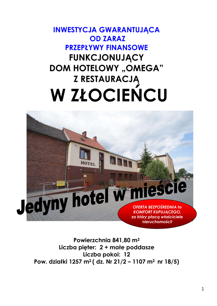 INWESTYCJA GWARANTUJĄCA OD ZARAZ PRZEPŁYWY FINANSOWE FUNKCJONUJĄCY DOM HOTELOWY „OMEGA” Z RESTAURACJĄ W ZŁOCIEŃCU OFERTA BEZPOŚREDNIA to KOMFORT KUPUJĄCEGO, za który płacą właściciele nieruchomości! Powierzchnia 841,80 m2 Liczba pięter: 2 + małe poddasze Liczba pokoi: 12 Pow. działki 1257 m2 ( dz. Nr 21/2 – 1107 m2 nr 18/5) 1 Przedsiębiorcy odnoszący największe sukcesy na świecie to tacy, którzy wiedzą jak zwracać uwagę na szczegóły. Nie mamy na myśli szczegółów związanych z Twoim biznesem, takich jak: koszty, trendy sprzedażowe czy to, kto wśród pracowników się wyróżnia (a kto nie) itp. Te szczegóły są ważne i nie odniesiesz sukcesu jako przedsiębiorca bez należytego skupienia się na nich. Szczegóły związane z tą ofertą nie są widoczne dla niewprawnego oka. Dlatego ważne jest osobiste zwizytowanie obiektu. Każdy, kto prowadzi biznes, musi mieć na uwadze te szczegóły, bo w przeciwnym razie wypadnie z biznesu. Czy odróżniasz dobry biznes od złego? Jeśli tak – to życiowe drobiazgi oraz okazje z nimi związane będą dla Ciebie czytelne. Jedną z rzeczy, którą naprawdę uwielbiamy w naszym świecie, to fakt, że jest on pełen okazji. Rzecz w tym, że większość ludzi ich nie zauważa. Zauważają jedynie to, czego im brakuje lub co jest nie tak. Ale różnica pomiędzy tymi, którzy odnoszą sukcesy w życiu i tymi, którzy ich nie odnoszą nie polega na zauważaniu tego, czego nie ma lub tego, co jest niewłaściwe. Polega ona na dostrzeganiu okazji w tych zjawiskach. Masz niesamowitą okazję przejąć dobrze prosperujący biznes i jeszcze zwiększyć jego potencjał biznesowy. Przedsiębiorca odnoszący sukcesy dostrzega drobiazgi, które mają znaczenie dla rozwoju biznesu (a tych związanych z domem hotelowym jest wiele). Aby odnosić sukcesy jako przedsiębiorca, musisz dostrzegać drobiazgi, które mają znaczenie i wiedzieć, co Jego firma może zdziałać, a czego nikt inny nie robi. Następnie musi sprawić, że wszyscy się o tym dowiedzą. Zatem umów się z na oględziny nieruchomości na żywo. Spróbuj dostrzec te małe drobiazgi, które mogą stać się okazjami dla Ciebie i Twojego biznesu. Zacznij myśleć, co w związku z tą okazją może zrobić Twój biznes, czego nie zrobi żaden inny. Jeśli potrafisz znaleźć i wykorzystać takie okazje, zapewniamy Cię, że osiągniesz sukces. 2 I. Lokalizacja Nieruchomość położona jest w miejscowości Złocieniec w środkowo-wschodniej części województwa zachodniopomorskiego. Złocieniec jest to jedno z większych miast Pojezierza Drawskiego leżący w południowo - wschodniej części województwa zachodniopomorskiego, pomiędzy trzema dużymi jeziorami: Drawsko, Siecino, Lubie. Centralne położenie miasta na Pojezierzu Drawskim wpływa na atrakcyjność komunikacyjną w połączeniach drogowych i kolejowych w kierunku: II. Szczecina - 114 km., Poznania - 180 km., Berlina - 250 km, do morza 100 km. Charakterystyka regionu Położenie wśród lasów i jezior sprawia, że teren ten jest niezwykle atrakcyjny pod wieloma względami. Gmina leży w obrębie Drawskiego Parku Krajobrazowego. Urozmaicona rzeźba terenu, wzgórza morenowe, liczne jeziora, doliny rzek Drawy i Wąsawy, szata roślinna lasów, łąk i bagien stanowią bogactwo gminy i decydują o jej niezwykłej atrakcyjności. Jeziora obfitują w sandacze, okonie, węgorze i sielawy. W lasach grzybiarze znajdą prawdziwki, rydze, podgrzybki i koźlaki. Ponadto napotkać można orły, nietoperze, czaple, bociany czarne, żurawie, kormorany i bobry. Dzięki swemu położeniu wśród lasów (36% całego obszaru gminy) i jezior (16% całego obszaru gminy) oraz walorom krajobrazowym Gmina Złocieniec jest doskonałym miejscem do wypoczynku i uprawiania turystyki. Nad licznymi jeziorami i rzeką Drawą zlokalizowane są ośrodki wypoczynkowe i pola biwakowe. Zróżnicowany krajobraz naszej gminy zachęca do uprawiania sportów wodnych i wędkowania, turystyki pieszej, rowerowej. Dla zainteresowanych istnieje możliwość wypożyczenia rowerów i sprzętu wodnego, a także skorzystania z przejażdżek konnych. Na turystów czeka wiele miejsc noclegowych w licznych ośrodkach wypoczynkowych, gospodarstwach agroturystycznych, pensjonatach, polach biwakowych, położonych nad jeziorami: Lubie, Siecino, Wąsosze, Dłusko. 3 Na ternie Gminy Złocieniec: - oznakowano ciekawe miejsca takie jak: rynek miasta, wzgórze zamkowe nad rzeką Drawą, Ośrodek Edukacji Ekologicznej Pojezierza Drawskiego, Pałac w Bobrowie, Pałac w Darskowie, Pałac w Cieszynie, Kościół w Lubieszewie, Kościół w Warniłegu oraz Szpital MSWiA w Kańsku. W miejscach tych ustawiono tablice informacyjne w języku polskim i niemieckim; - oznakowano 5 tras rowerowych, które zasięgiem otaczają całą gminę, a miejscami przecinają się ze szlakami sąsiednich gmin umożliwiając w ten sposób turystom zapoznanie się z całym terenem Pojezierza Drawskiego. Ponadto, trasy szlaków rowerowych wiodą przez malownicze tereny o szczególnych wartościach przyrodniczych i krajoznawczych. Daje to doskonałe warunki do uprawiania turystyki kwalifikowanej; - wykonano 2 tablice informacyjne z mapką gminy wraz ze wszystkimi szlakami rowerowymi. Jedna tablica postawiona jest na rynku miasta i w Budowie; na wszystkich ścieżkach rowerowych postawiono drewniane ławeczki z zadaszeniem, stoliki, kosze na śmieci jako miejsca postoju i odpoczynku dla rowerzystów. Przez cały rok proponuje się mieszkańcom i turystom wiele atrakcji. Stałe masowe imprezy to: Dni Złocieńca, Ogólnopolskie Regaty o Puchar Ziemi Złocienieckiej, Zachodniopomorskie Targi Wystawiennicze, Jarmark Kultury Mieszkańców Pojezierza Drawskiego. Dużym zainteresowaniem cieszą się regaty żeglarskie, turnieje sportowe, rajdy. W gminie działa wielu lokalnych twórców, których prace stanowią „małe” dzieła sztuki, będące efektem wyjątkowej wrażliwości, s