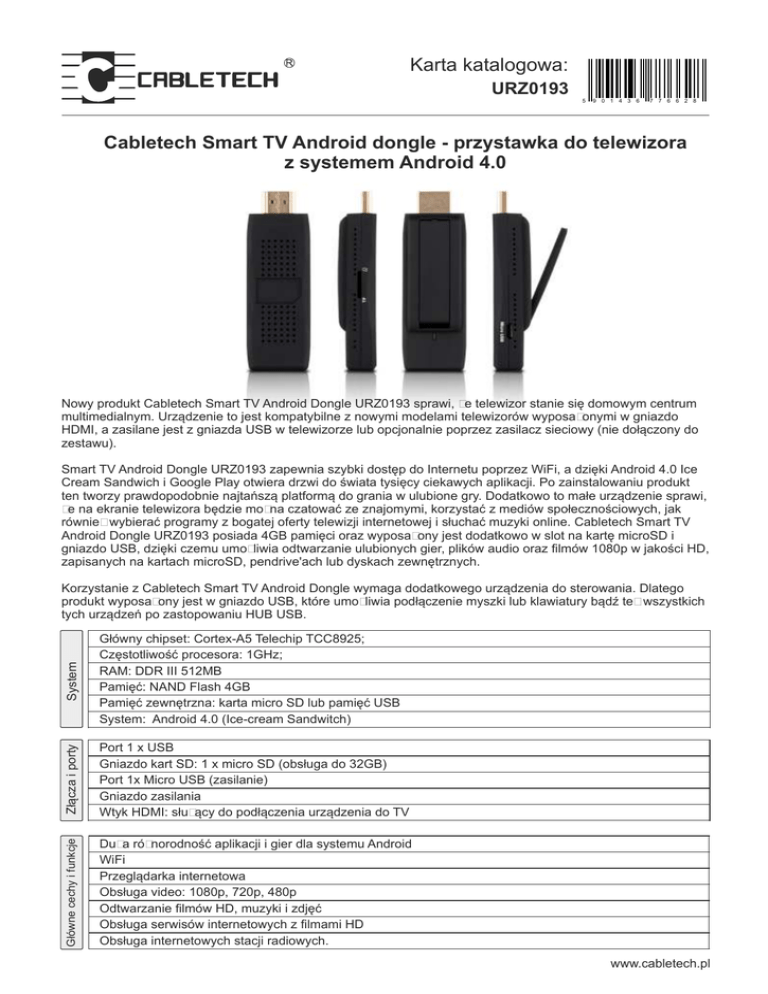 Karta katalogowa: URZ0193 5 9 0 1 4 3 6 7 7 6 6 2 8 Cabletech Smart TV Android dongle - przystawka do telewizora z systemem Android 4.0 Nowy produkt Cabletech Smart TV Android Dongle URZ0193 sprawi, że telewizor stanie się domowym centrum multimedialnym. Urządzenie to jest kompatybilne z nowymi modelami telewizorów wyposażonymi w gniazdo HDMI, a zasilane jest z gniazda USB w telewizorze lub opcjonalnie poprzez zasilacz sieciowy (nie dołączony do zestawu). Smart TV Android Dongle URZ0193 zapewnia szybki dostęp do Internetu poprzez WiFi, a dzięki Android 4.0 Ice Cream Sandwich i Google Play otwiera drzwi do świata tysięcy ciekawych aplikacji. Po zainstalowaniu produkt ten tworzy prawdopodobnie najtańszą platformą do grania w ulubione gry. Dodatkowo to małe urządzenie sprawi, że na ekranie telewizora będzie można czatować ze znajomymi, korzystać z mediów społecznościowych, jak również wybierać programy z bogatej oferty telewizji internetowej i słuchać muzyki online. Cabletech Smart TV Android Dongle URZ0193 posiada 4GB pamięci oraz wyposażony jest dodatkowo w slot na kartę microSD i gniazdo USB, dzięki czemu umożliwia odtwarzanie ulubionych gier, plików audio oraz filmów 1080p w jakości HD, zapisanych na kartach microSD, pendrive'ach lub dyskach zewnętrznych. System Główny chipset: Cortex-A5 Telechip TCC8925; Częstotliwość procesora: 1GHz; RAM: DDR III 512MB Pamięć: NAND Flash 4GB Pamięć zewnętrzna: karta micro SD lub pamięć USB System: Android 4.0 (Ice-cream Sandwitch) Złącza i porty Port 1 x USB Gniazdo kart SD: 1 x micro SD (obsługa do 32GB) Port 1x Micro USB (zasilanie) Gniazdo zasilania Wtyk HDMI: służący do podłączenia urządzenia do TV Główne cechy i funkcje Korzystanie z Cabletech Smart TV Android Dongle wymaga dodatkowego urządzenia do sterowania. Dlatego produkt wyposażony jest w gniazdo USB, które umożliwia podłączenie myszki lub klawiatury bądź też wszystkich tych urządzeń po zastopowaniu HUB USB. Duża różnorodność aplikacji i gier dla systemu Android WiFi Przeglądarka internetowa Obsługa video: 1080p, 720p, 480p Odtwarzanie filmów HD, muzyki i zdjęć Obsługa serwisów internetowych z filmami HD Obsługa internetowych stacji radiowych. www.cabletech.pl