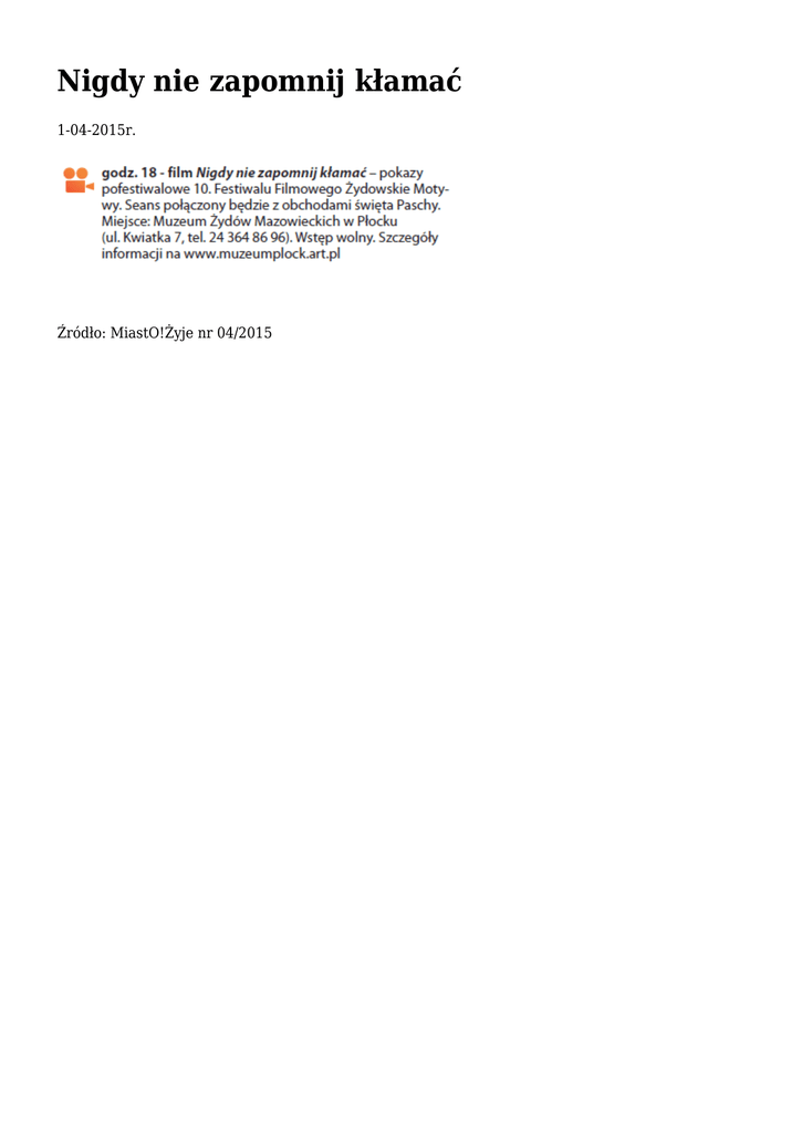 Nigdy nie zapomnij kłamać 1-04-2015r. Źródło: MiastO!Żyje nr 04/2015