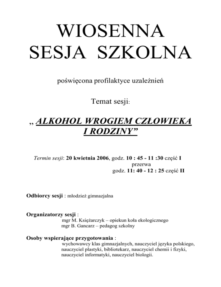 WIOSENNA SESJA SZKOLNA poświęcona profilaktyce uzależnień Temat sesji: „ ALKOHOL WROGIEM CZŁOWIEKA I RODZINY” Termin sesji: 20 kwietnia 2006, godz. 10 : 45 - 11 :30 część I przerwa godz. 11: 40 - 12 : 25 część II Odbiorcy sesji : młodzież gimnazjalna Organizatorzy sesji : mgr M. Księżarczyk – opiekun koła ekologicznego mgr B. Gancarz – pedagog szkolny Osoby wspierające przygotowania : wychowawcy klas gimnazjalnych, nauczyciel języka polskiego, nauczyciel plastyki, bibliotekarz, nauczyciel chemii i fizyki, nauczyciel informatyki, nauczyciel biologii. UZASADNIENIE WYBORU TEMATU SESJI Do wyboru tematu sesji skłonił nas narastający na coraz szerszą skalę problem, dotyczący alkoholu. Tysiące sytuacji, w których kufle piwa, lampki wina lub kieliszki wódki wywołują różne nastroje: wzruszenie, rozluźnienie, gniew, rozpacz, wstręt, lęk, obserwujemy na co dzień. Są wśród tych sytuacji noworoczne toasty, przyjęcia, celebrowanie poważnych świąt. Ale są także domowe noce pełne grozy i płaczu dzieci, śmiertelne wypadki samochodowe, poranny kac, samobójstwa i wątroby nie do uratowania. Od kilku lat obserwujemy również coraz bardziej niepokojące zjawisko związane z inwazją biznesu alkoholowego i działaniami zaadresowanymi do młodych Polaków. Na ulicach, salach sportowych, w kinach, w programach radiowych i telewizyjnych, na łamach gazet pojawia się coraz więcej reklam – „zaproszeń” do picia napojów alkoholowych. Polskie prawo zabrania sprzedaży alkoholu osobom poniżej 18 roku życia. Codzienne obserwacje dowodzą jednak, że sprzedawcy nie zawsze zwracają uwagę na wiek swoich klientów, a inni dorośli będący świadkami takich sytuacji, najczęściej nie interweniują. Stoi za tym nie tylko niechęć w angażowanie się w sytuacje mogące owocować konfliktami, ale również opinie na temat wieku, w którym picie alkoholu może być dopuszczalne oraz odmienne poglądy i niewiedza na temat szkodliwości picia napojów alkoholowych. Posiadana przez młodzież ( i nie tylko ) wiedza na temat działania alkoholu to raczej „ niewiedza”, bowiem informacje docierające do młodzieży pomijają rzeczywiste skutki picia. Młodzież nie dostrzega ogromu szkód społecznych, ekonomicznych i biologicznych, problemów rodzin alkoholików, czy ofiar przestępstw popełnianych przez pijanych kierowców. Dlatego warto zapoznać młodych ludzi z tajemnicami substancji o potężnym działaniu, z problemami pojawiającymi się, gdy substancja ta staje się zbyt ważna dla człowieka. Mamy nadzieję, że proponowana przez nas sesja będzie pomocna młodzieży w zrozumieniu problemu skutków uzależnienia, a dla pedagogów stanowić będzie wsparcie w procesie edukacyjno – wychowawczym. CELE SESJI: - dostarczenie podstawowych wiadomości o alkoholu - wskazanie konsekwencji nadużywania alkoholu - dostarczenie podstawowej wiedzy na temat powstawania uzależnienia - ukazanie zgubnego wpływu alkoholu na funkcjonowanie rodziny - wskazanie na społeczne skutki alkoholizmu - zdrowie, jako najwyższa wartość w życiu człowieka – zdrowy styl życia - kształtowanie właściwych postaw społecznych i szacunku wobec problemów innych ludzi - zmiana stereotypów na temat alkoholizmu TEMATYKA WYSTĄPIEŃ UCZNIÓW KLASA III A – wych. mgr J. Skórski „ Alkohol- tajemnicza substancja”. / Co to jest alkohol? Jakie ma właściwości fizyczne i chemiczne? W jaki sposób powstaje alkohol etylowy? Obecność alkoholu we krwi. Stan nietrzeźwości ./ KLASA III B – wych. mgr T. Listowska „ Jak alkohol wpływa na organizm?” / Zmiany chorobowe, powstające na skutek długotrwałego używania alkoholu. Wpływ alkoholu na układ nerwowy, pokarmowy, krwionośny, oddechowy. Ciąża i płód. Zaburzenia psychiczne./ KLASA II A – wych. mgr D. Mazurkiewicz „ Alkoholizm, czyli uzależnienie od alkoholu”. / Alkoholizm to choroba. Jak się zaczyna i rozwija? Objawy tej choroby. Sygnały ostrzegawcze./ KLASA I – wych. mgr B. Cichocka „ Społeczne skutki alkoholizmu”. / Obszary życia rodzinnego szczególnie zagrożone. Zachowania alkoholika w życiu rodzinnym. Dziecko w rodzinie z problemami alkoholowymi. Wpływ nadużywania alkoholu na pracę zawodową. Stosunek alkoholika do spraw publicznych. Relacje z przyjaciółmi. Wszystkie klasy przygotują plakaty i hasła ilustrujące treść referatów. Klasa I przygotuje przedstawienie pt. „ Mały Książę na planecie Pijaka”. PRZEBIEG WIOSENNEJ SESJI SZKOLNEJ Część I ( 10: 45 – 11: 30 ) 1. Powitanie uczestników sesji i gości ( wyjaśnienie pojęcia „sesja”). 2. Określenie tematu sesji : „ Alkohol wrogiem człowieka i rodziny”. 3. Uzasadnienie wyboru tematu sesji. 4. Przedstawienie ekspertów związanych z problematyką tematu: pracownik poradni antyalkoholowej, policjant, pedagog, psycholog, nauczyciel chemii i fizyki, nauczyciel biologii, pielęgniarka. 5. Analiza ankiet diagnozujących uczniów w formie prezentacji multimedialnej. 6. Podsumowanie wyników ankiet ( określenie stopnia znajomości problemu uzależnienia od alkoholu). 7.Tęcza szczęścia ( wartości : zdrowie, rodzina, miłość, praca, przyjaźń, pieniądze). - uczniowie określają, co jest w życiu najważniejsze - układanie kolorowych etykiet na tablicy 8. Wspólna ocena, czy alkohol wpływa na szczęście człowieka – wypowiedzi uczniów w odniesieniu do „ tęczy szczęścia”. 9. Aby sprawdzić przedstawione opinie i rozwiać wątpliwości, uczniowie przedstawiają przygotowane referaty: a) klasa III a – „ Alkohol – tajemnicza substancja” * wskazanie przez uczniów ( z sali ) plakatu ilustrującego temat * komentarz ekspertów – nauczyciel chemii, policjant * pytania uczniów do ekspertów ( wyjaśnianie wątpliwych kwestii). b) klasa III b – „ Jak alkohol wpływa na organizm?” * wskazanie przez uczniów plakatu ilustrującego temat * komentarz ekspertów – nauczyciel biologii, 