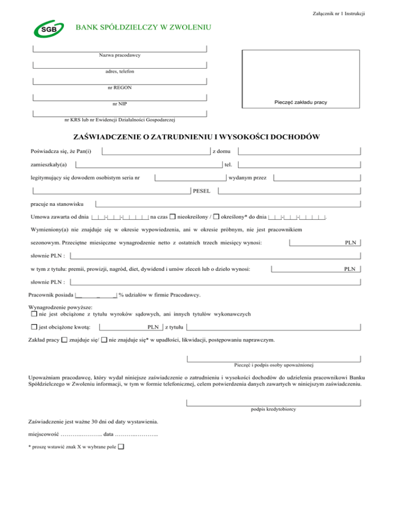 Załącznik nr 1 Instrukcji BANK SPÓŁDZIELCZY W ZWOLENIU Nazwa pracodawcy adres, telefon nr REGON Pieczęć zakładu pracy nr NIP nr KRS lub nr Ewidencji Działalności Gospodarczej ZAŚWIADCZENIE O ZATRUDNIENIU I WYSOKOŚCI DOCHODÓW Poświadcza się, że Pan(i) z domu zamieszkały(a) tel. legitymujący się dowodem osobistym seria nr wydanym przez PESEL pracuje na stanowisku Umowa zawarta od dnia | | |-| | |-| | | | | na czas nieokreślony / określony* do dnia | | |-| | |-| | | | |. Wymieniony(a) nie znajduje się w okresie wypowiedzenia, ani w okresie próbnym, nie jest pracownikiem sezonowym. Przeciętne miesięczne wynagrodzenie netto z ostatnich trzech miesięcy wynosi: PLN słownie PLN : w tym z tytułu: premii, prowizji, nagród, diet, dywidend i umów zleceń lub o dzieło wynosi: PLN słownie PLN : Pracownik posiada |__ _ _| % udziałów w firmie Pracodawcy. Wynagrodzenie powyższe: nie jest obciążone z tytułu wyroków sądowych, ani innych tytułów wykonawczych jest obciążone kwotą: Zakład pracy znajduje się/ PLN z tytułu nie znajduje się* w upadłości, likwidacji, postępowaniu naprawczym. Pieczęć i podpis osoby upoważnionej Upoważniam pracodawcę, który wydał niniejsze zaświadczenie o zatrudnieniu i wysokości dochodów do udzielenia pracownikowi Banku Spółdzielczego w Zwoleniu informacji, w tym w formie telefonicznej, celem potwierdzenia danych zawartych w niniejszym zaświadczeniu. podpis kredytobiorcy Zaświadczenie jest ważne 30 dni od daty wystawienia. miejscowość ………..……….. data ………..………... * proszę wstawić znak X w wybrane pole