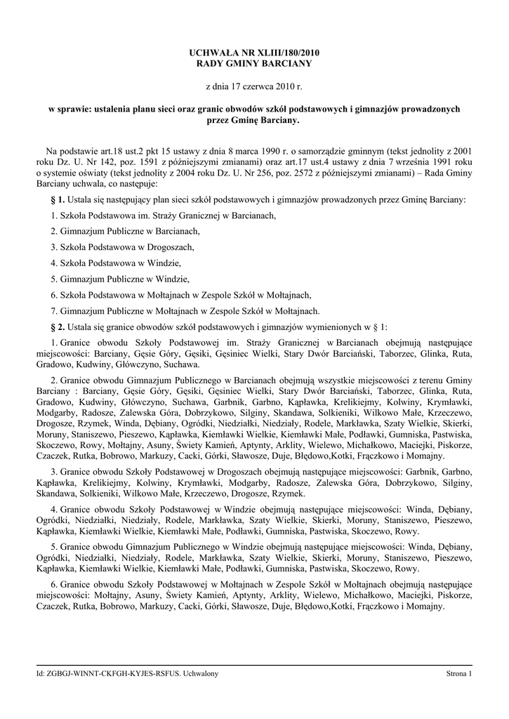 UCHWAŁA NR XLIII/180/2010 RADY GMINY BARCIANY z dnia 17 czerwca 2010 r. w sprawie: ustalenia planu sieci oraz granic obwodów szkół podstawowych i gimnazjów prowadzonych przez Gminę Barciany. Na podstawie art.18 ust.2 pkt 15 ustawy z dnia 8 marca 1990 r. o samorządzie gminnym (tekst jednolity z 2001 roku Dz. U. Nr 142, poz. 1591 z późniejszymi zmianami) oraz art.17 ust.4 ustawy z dnia 7 września 1991 roku o systemie oświaty (tekst jednolity z 2004 roku Dz. U. Nr 256, poz. 2572 z późniejszymi zmianami) – Rada Gminy Barciany uchwala, co następuje: § 1. Ustala się następujący plan sieci szkół podstawowych i gimnazjów prowadzonych przez Gminę Barciany: 1. Szkoła Podstawowa im. Straży Granicznej w Barcianach, 2. Gimnazjum Publiczne w Barcianach, 3. Szkoła Podstawowa w Drogoszach, 4. Szkoła Podstawowa w Windzie, 5. Gimnazjum Publiczne w Windzie, 6. Szkoła Podstawowa w Mołtajnach w Zespole Szkół w Mołtajnach, 7. Gimnazjum Publiczne w Mołtajnach w Zespole Szkół w Mołtajnach. § 2. Ustala się granice obwodów szkół podstawowych i gimnazjów wymienionych w § 1: 1. Granice obwodu Szkoły Podstawowej im. Straży Granicznej w Barcianach obejmują następujące miejscowości: Barciany, Gęsie Góry, Gęsiki, Gęsiniec Wielki, Stary Dwór Barciański, Taborzec, Glinka, Ruta, Gradowo, Kudwiny, Główczyno, Suchawa. 2. Granice obwodu Gimnazjum Publicznego w Barcianach obejmują wszystkie miejscowości z terenu Gminy Barciany : Barciany, Gęsie Góry, Gęsiki, Gęsiniec Wielki, Stary Dwór Barciański, Taborzec, Glinka, Ruta, Gradowo, Kudwiny, Główczyno, Suchawa, Garbnik, Garbno, Kąpławka, Krelikiejmy, Kolwiny, Krymławki, Modgarby, Radosze, Zalewska Góra, Dobrzykowo, Silginy, Skandawa, Solkieniki, Wilkowo Małe, Krzeczewo, Drogosze, Rzymek, Winda, Dębiany, Ogródki, Niedziałki, Niedziały, Rodele, Markławka, Szaty Wielkie, Skierki, Moruny, Staniszewo, Pieszewo, Kąpławka, Kiemławki Wielkie, Kiemławki Małe, Podławki, Gumniska, Pastwiska, Skoczewo, Rowy, Mołtajny, Asuny, Świety Kamień, Aptynty, Arklity, Wielewo, Michałkowo, Maciejki, Piskorze, Czaczek, Rutka, Bobrowo, Markuzy, Cacki, Górki, Sławosze, Duje, Błędowo,Kotki, Frączkowo i Momajny. 3. Granice obwodu Szkoły Podstawowej w Drogoszach obejmują następujące miejscowości: Garbnik, Garbno, Kąpławka, Krelikiejmy, Kolwiny, Krymławki, Modgarby, Radosze, Zalewska Góra, Dobrzykowo, Silginy, Skandawa, Solkieniki, Wilkowo Małe, Krzeczewo, Drogosze, Rzymek. 4. Granice obwodu Szkoły Podstawowej w Windzie obejmują następujące miejscowości: Winda, Dębiany, Ogródki, Niedziałki, Niedziały, Rodele, Markławka, Szaty Wielkie, Skierki, Moruny, Staniszewo, Pieszewo, Kąpławka, Kiemławki Wielkie, Kiemławki Małe, Podławki, Gumniska, Pastwiska, Skoczewo, Rowy. 5. Granice obwodu Gimnazjum Publicznego w Windzie obejmują następujące miejscowości: Winda, Dębiany, Ogródki, Niedziałki, Niedziały, Rodele, Markławka, Szaty Wielkie, Skierki, Moruny, Staniszewo, Pieszewo, Kąpławka, Kiemławki Wielkie, Kiemławki Małe, Podławki, Gumniska, Pastwiska, Skoczewo, Rowy. 6. Granice obwodu Szkoły Podstawowej w Mołtajnach w Zespole Szkół w Mołtajnach obejmują następujące miejscowości: Mołtajny, Asuny, Świety Kamień, Aptynty, Arklity, Wielewo, Michałkowo, Maciejki, Piskorze, Czaczek, Rutka, Bobrowo, Markuzy, Cacki, Górki, Sławosze, Duje, Błędowo,Kotki, Frączkowo i Momajny. Id: ZGBGJ-WINNT-CKFGH-KYJES-RSFUS. Uchwalony Strona 1 7. Granice obwodu Gimnazjum Publicznego w Mołtajnach w Zespole Szkół w Mołtajnach obejmują następujące miejscowości: Mołtajny, Asuny, Świety Kamień, Aptynty, Arklity, Wielewo, Michałkowo, Maciejki, Piskorze, Czaczek, Rutka, Bobrowo, Markuzy, Cacki, Górki, Sławosze, Duje, Błędowo,Kotki, Frączkowo i Momajny. § 3. 1. Od 1 września 2010 roku uczniowie klas II i III Gimnazjum Publicznego w Barcianach z miejscowości wymienionych w § 2 pkt 5 oraz pkt 7 będą realizować obowiązek nauki w Gimnazjum Publicznym w Barcianach natomiast uczniowie klas I nowoutworzonych gimnazjów realizować będą obowiązek nauki w Gimnazjum Publicznym w Windzie i w Gimnazjum w Mołtajnach. 2. Od 1 września 2011 roku uczniowie klas III Gimnazjum Publicznego w Barcianach z miejscowości wymienionych w § 2 pkt 5 oraz pkt 7 będą realizować obowiązek nauki w Gimnazjum Publicznym w Barcianach natomiast uczniowie klas I i II z tych miejscowości realizować będą obowiązek nauki w Gimnazjum Publicznym w Windzie i Gimnazjum Publicznym w Mołtajnach. § 4. Wykonanie uchwały powierza się Wójtowi Gminy Barciany. § 5. Tracą moc następujące Uchwały Rady Gminy: 1. Uchwała Nr XXXVIII/236/98 Rady Gminy Barciany z dnia 26 marca 1998 roku w sprawie zmiany granic obwodów szkół podstawowych; 2. Uchwała Nr XVII/100/2000 Rady Gminy Barciany z dnia 25 lutego 2000 roku w sprawie zmiany granic obwodów szkół podstawowych w Gminie Barciany; 3. Uchwała Nr XIX/110/2000 Rady Gminy Barciany z dnia 26 maja 2000 roku w sprawie zmiany uchwały Nr XVII/100/2000 Rady Gminy Barciany; 4. Uchwała Nr XXII/120/2000 Rady Gminy Barciany z dnia 25 sierpnia 2000 roku w sprawie zmiany uchwały Nr XVII/100/2000 Rady Gminy Barciany. § 6. Uchwała wchodzi w życie z dniem podjęcia i podlega ogłoszeniu w Dzienniku Urzędowym Województwa Warmińsko – Mazurskiego. Przewodniczący Rady Gminy Henryk Florian Nosek Id: ZGBGJ-WINNT-CKFGH-KYJES-RSFUS. Uchwalony Strona 2