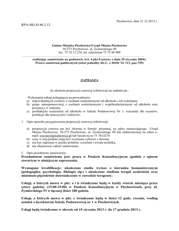Piechowice, dnia 31.12.2012 r. RPA.MG.8140.2.12 Gmina Miejska Piechowice/Urząd Miasta Piechowice 58-573 Piechowice, ul. Żymierskiego 49 fax. 75 76 12 274, tel. sekretariat 75 75 48 900 ………………………………………………………………………………………………… realizując zamówienie na podstawie Art. 4 pkt 8 ustawy z dnia 29 stycznia 2004r. Prawo zamówień publicznych (tekst jednolity Dz.U. z 2010r Nr 113, poz.759) ZAPRASZA do złożenia propozycji cenowej (ofertowej) na zadanie pn.: Wykonania usługi polegającej na prowadzeniu: a) indywidualnych rozmów z osobami uzależnionymi od alkoholu i ich rodzinami, b) grupy samopomocowej z osobami uzależnionymi i współuzależnionymi od alkoholu oraz przemocy w rodzinie, c) profilaktyki uzależnień od alkoholu w Szkole Podstawowej Nr 1: warsztaty dla uczniów, prelekcje dla nauczycieli i rodziców. 1. Opis sposobu przygotowania propozycji cenowej (ofertowej): a) propozycja cenowa ma być złożona w formie: pisemnej, na adres zamawiającego Urząd Miasta Piechowice, 58-573 Piechowice, ul. Żymierskiego 49 lub elektronicznej na adres email: [email protected] lub faxem na nr 75 7612274 b) ceny w niej podane mają być wyrażone cyfrowo i słownie, c) ma być napisana w języku polskim, czytelnie i trwałą techniką, d) ma obejmować całość zamówienia. 2. Opis przedmiotu zamówienia : Przedmiotem zamówienia jest: praca w Punkcie Konsultacyjnym zgodnie z opisem zawartym w niniejszym zaproszeniu. Wymagane kwalifikacje: ukończone studia wyższe o kierunku humanistycznym (pedagogika, psychologia. filologia itp.) i ukończone studium terapii uzależnień oraz minimum pięcioletnie doświadczenie w zawodzie terapeuty. Usługi, o których mowa w pkt. a i b świadczone będą w każdy wtorek miesiąca przez cztery godziny (15.00-19.00) w Punkcie Konsultacyjnym w Piechowicach, przy ul. Żymierskiego 53 w łącznej ilości 180 godzin. Usługi, o których mowa w pkt. c świadczone będą w ilości 12 godz. rocznie, według ustaleń z dyrektorem Szkoły Podstawowej nr 1 w Piechowicach. Usługi będą świadczone w okresie od 15 stycznia 2013 r. do 17 grudnia 2013 r. Na złożenie oferty oczekujemy do 10.01.2013 r. do godz.12.00 3. Wymagany termin realizacji zamówienia: 12 miesięcy 4. Propozycja cenowa (ofertowa) ma być sporządzona na Formularzu propozycji cenowej (ofertowej) wg załączonego wzoru Załącznik nr 1. 5. Opis sposobu obliczania ceny w składanej propozycji cenowej (ofertowej): Zaproponowana przez Oferenta cena ma zawierać: • wartość netto stawki godzinowej oraz całości zamówienia (bez podatku VAT) • obowiązujący podatek od towarów i usług od proponowanej stawki godzinowej i od całości usługi • cenę (wartość brutto stawki godzinowej oraz całości zamówienia wraz z podatkiem VAT) usługi stanowiącej przedmiot zamówienia. Cena ofert (brutto wraz z podatkiem VAT) jest ceną łączną za wykonanie zamówienia zgodnie z załączonym opisem przedmiotu zamówienia oraz projektem umowy. Cenę należy podać w złotych polskich. 6. Propozycje cenowe (ofertowe) będą oceniane wg. następującego kryterium oceny ofert: 6.1. a) b) Przy wyborze najkorzystniejszej oferty, zamawiający będzie się kierował jednym kryterium: CENA – 100% Cena – A(X): przyjmuje się, że najwyższą ilość punktów otrzyma cena najniższa wśród cen zawartych w propozycjach cenowych (ofertowych) na wykonanie zamówienia objętego nn. zaproszeniem. ceny w pozostałych ofertach punktowane będą w oparciu o następujący wzór: C min A(x) = ------------- x 100 C (x) gdzie: A(x) – ilość punktów przyznana ofercie „x” za kryterium ceny C min – cena najniższa wśród cen zawartych w ofertach na zadanie objęte zaproszeniem do złożenia oferty, C(x) – cena zawarta w ofercie „x” Zamawiający udzieli zamówienia oferentowi, którego propozycja cenowa (ofertowa) odpowiada wszystkim wymaganiom przedstawionym w nn. zaproszeniu oraz zostanie oceniona, jako najkorzystniejsza w oparciu o podane kryterium wyboru, tj. otrzyma najwyższą ilość punktów – najniższa cena oferty. 6.2. 7. Miejsce i termin złożenia propozycji cenowej (ofertowej): Propozycję cenową (ofertową) należy złożyć w terminie do dnia 10.01.2013 r. godz.12.00 w formie zgodnej ze wskazaniem zamawiającego w pkt 1 lit. a, w siedzibie zamawiającego: Urząd Miasta Piechowice 58-573 Piechowice, ul. Żymierskiego 49 lub w formie elektronicznej na adres e-mail: [email protected] lub faxem na nr 75 7612274. 8.Osobami uprawnionymi do kontaktów z wykonawcami z ramienia zamawiającego są: Marta Głowala – zastępca pełnomocnika burmistrza ds. rozwiązywania problemów alkoholowych i przeciwdziałania narkomanii tel. 75/75-48-909, fax757612274, email: [email protected]. 9. O wyborze najkorzystniejszej propozycji ofertowej (cenowej) oferenci, którzy złożyli ofertę zostaną powiadomieni faksem lub e-mailem. 10. Informacje dotyczące zawierania umowy: W terminie wyznaczonym przez zamawiającego w powiadomieniu o wyborze najkorzystniejszej oferty, wybrany oferent zobowiązany jest podpisać umowę. Przed podpisaniem umowy zwycięski oferent jest zobowiązany przedłożyć zamawiającemu odpis lub kopię dokumentu potwierdzoną „za zgodność”, w oparciu, o który prowadzona jest działalność gospodarcza (stosownie do formy prowadzonej działalności gospodarczej np. odpis z Krajowego Rejestru Sądowego, odpis z ewidencji działalności gospodarczej) i z którego wynika kto w imieniu oferenta jest upoważniony do reprezentowania i zaciągania zobowiązań. Jeżeli w/w dokument jest wystawiony wcześniej niż sześć miesięcy przed datą przedłożenia go zamawiającemu to wymagane jest złożenie oświadczenia dot. aktualności danych zawartych w dokumencie. 11. Załączniki: 1) Załącznik nr 1 - Wzór propozycji cenowej. 2) Załącznik nr 2 – Projekt umowy ............................................. Spra
