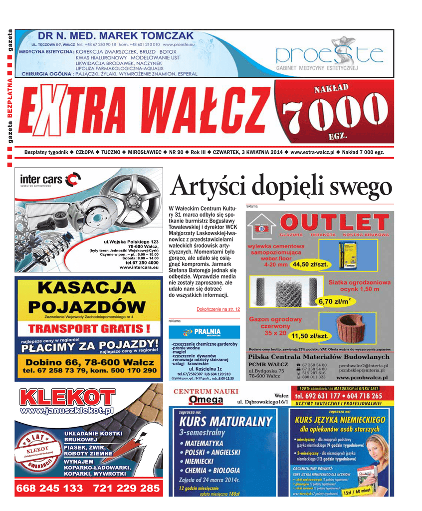 gazeta BEZPŁATNA gazeta Bezpłatny tygodnik CZŁOPA TUCZNO MIROSŁAWIEC NR 90 Rok III CZWARTEK, 3 KWIATNIA 2014 www.extra-walcz.pl Nakład 7 000 egz. Artyści dopięli swego W Wałeckim Centrum Kultury 31 marca odbyło się spotkanie burmistrz Bogusławy Towalewskiej i dyrektor WCK Małgorzaty Laskowskiej-Iwanowicz z przedstawicielami wałeckich środowisk artystycznych. Momentami było gorąco, ale udało się osiągnąć kompromis. Jarmark Stefana Batorego jednak się odbędzie. Wprawdzie media nie zostały zaproszone, ale udało nam się dotrzeć do wszystkich informacji. Dokończenie na str. 12 reklama reklama CZWARTEK, 3 KWIETNIA 2014 2 List do redakcji Zastaw się, a postaw się. Refleksje po spotkaniu wałeckich artystów z Panią Burmistrz Okazuje się, że mam na swoim koncie swój mały sukces, ponieważ Burmistrz Miasta Wałcza Pani Bogusława Towalewska przystała na propozycję artystów z Wałcza. Drodzy mieszkańcy! Podczas poniedziałkowego spotkania artystów z Panią Burmistrz złożono nam obietnicę, że nasza zdolna młodzież, zespoły zWałcza już wlipcu zaprezentują się w pełnej krasie. Udało się przeforsować temat Jarmarku Batorego. Kupcy, rzemieślnicy, kolekcjonerzy, czy twórcy ludowi wystawią swoje prace, a wałeccy artyści zaśpiewają! Co prawda, nasze miasto zatwierdziło już budżet 160.000 zł na organizację Lata z Radiem, więc jeśli Jarmark Batorego się odbędzie, to wałeccy artyści zaśpiewają za darmo, bo dla nich pieniędzy już nie ma! Jakby to była jakaś nowość! Zawsze tak było, jest i nic się – póki co – w tym względzie nie zmienia. Mimo wszystko, bardzo mnie cieszy, że już dziś dział promocji Wałcza dzięki nam dostał wykaz wałeckich artystów, Dom Kultury nasze oferty i numery telefonów, bo do tej pory (nadmienię, że znacie nas Państwo myślę od wielu lat) twierdzą, że takiej wiedzy nie posiadali! Wałcz może więc być dumny z naszych artystów i cieszyć się niezmiernie, ponieważ mimo iż wydamy pieniądze na gwiazdy polskiej estrady, my wystąpimy! Na spotkaniu artystów z Panią Burmistrz padło również Jej zapewnienie, iż organizując dziś koncert, czy darmowy spektakl dla Wałcza, artysta nie będzie musiał płacić za wynajem sali. Dziś już możemy bez problemów składać swoje propozycje wspólnie spędzonego czasu wDomu Kultury, drodzy wałczanie, i cieszyć się pełną salą na widowni. Szkoda tylko, że nie pomyślano trochę wcześniej, bo przecież można było mieć i gwiazdę polskiej estrady i pokaz naszych talentów na jednej imprezie, za dużo mniej- sze pieniądze. Niech będzie, że ciężko nam sie wyzbyć narodowej cechy „zastaw się, a postaw się”, nie zapominając przy tym o: „cudze chwalicie, swego nie znacie” …. Na marginesie, odnosząc się do odpowiedzi na mój list Pana radnego Józefa Kiziuka, pragnę zaznaczyć, iż nie jestem specjalistką od finansów i niespecjalnie zna]m się na wskaźnikach. Wiedzę na temat zadłużenia naszego miasta czerpię z najbliższych źródeł, czyli z wywiadów, konferencji i rozmów między innymi zPanią Burmistrz Miasta Wałcza. Mogę jeszcze delikatnie nadmienić, iż ta wiedza jest poparta faktami udokumentowanymi na przykład w Gazecie Prawnej w artykule pt. „Samorządy są nadmiernie zadłużone”, więc zapewniam Pana, Panie Józefie, że nie zmyślam, a jeśli nie zna Pan sytuacji finansowej miasta, to będzie to dla Pana pouczająca ESTERA NACZK lektura. List do redakcji Siostra Irena od ortez Jak się okazuje, nie jest łatwo kupić sprzęt ortopedyczny w Wałczu. W celu nabycia kortezy potrzebnej do rehabilitacji udałem się do sklepu ortopedycznego na ul. Zdobywców Wału Pomorskiego. Zastałem tam pracowników/właścicieli sklepu lekko znudzonych, wręcz zniechęconych do udzielania jakichkolwiek informacji. Dowiedziałem się, że mogę dokonać zakupu, ale tylko za gotówkę, ponieważ jako pacjent jestem zarejestrowany w wielkopolskim oddziale NFZ. Dziwne to, ponieważ NFZ jest organizacją ogólnopolską, wiec logicznie myśląc, realizacja refundacji powinna być dostępna w każdym miejscu w Polsce. Ale do sedna sprawy. Sklep z Wałcza mógł zamówić odpowiedni sprzęt rehabili- tacyjny, dostawa miała trwać ok. 7 dni. Towar – jak wspomniano – mogłem tylko kupić za gotówkę (ok. 350 zł), mimo że posiadałem dokument potwierdzający przyznaną mi refundację w wysokości 90% wartości sprzętu. Takie podejście wskazuje wyraźnie, że sklep ten nastawiony jest tylko nazysk, nie ma nic w pracownikach/właścicielach sklepu chęci pomocy drugiemu – potrzebującemu człowiekowi. Reasumując – kupiłem potrzebny mi sprzęt w sklepie w Szczecinie, gdzie z refundacją nie było żadnego problemu. Na marginesie całej tej sprawy chciałbym jeszcze dodać, że mój przypadek nie jest odosobniony. Moja znajoma miała problem z zakupem w tym samym sklepie tzw. balkoniku dla osoby niepełnosprawnej. Zaproponowano jej zakup sprzętu używanego w cenie nowego. Jedyny słuszny wniosek jaki nasuwa się po tej sytuacji to chyba taki, że Państwo z wspomnianego sklepu minęli się z powołaniem, a zarabianie na cudzym nieszczęściu jest bardzo nieetyczne. PS Ja w całej tej sytuacji jakoś sobie poradziłem. Strach pomyśleć w jaki sposób w podobnej sytuacji poradzi sobie osoba starsza, bez możliwości zakupu sprzętu PIOTR P. GEMBICKI w innym mieście… STOWARZYSZENIE PROJEKT AKTYWNI + Na gorącym uczynku Czujności wałczanina pomogła w zatrzymaniu mężczyzny, który usiłował ukraść rower górski na ulicy Tysiąclecia. W piwnicy sprawcy policjanci znaleźli też inny pochodzący z kradzieży rower. Tuż po godzinie 22.00 postronna osoba powiadomiła dyżurnego komendy o tym, że przy ulicy Tysiąclecia w Wałczu mężczyzna prawdopodobnie chce ukraść rower górski. – Gdy na miejsce przybył patrol policjantów, zauważył siedzącego na ławce mężczyznę. Przy znajdującym s
