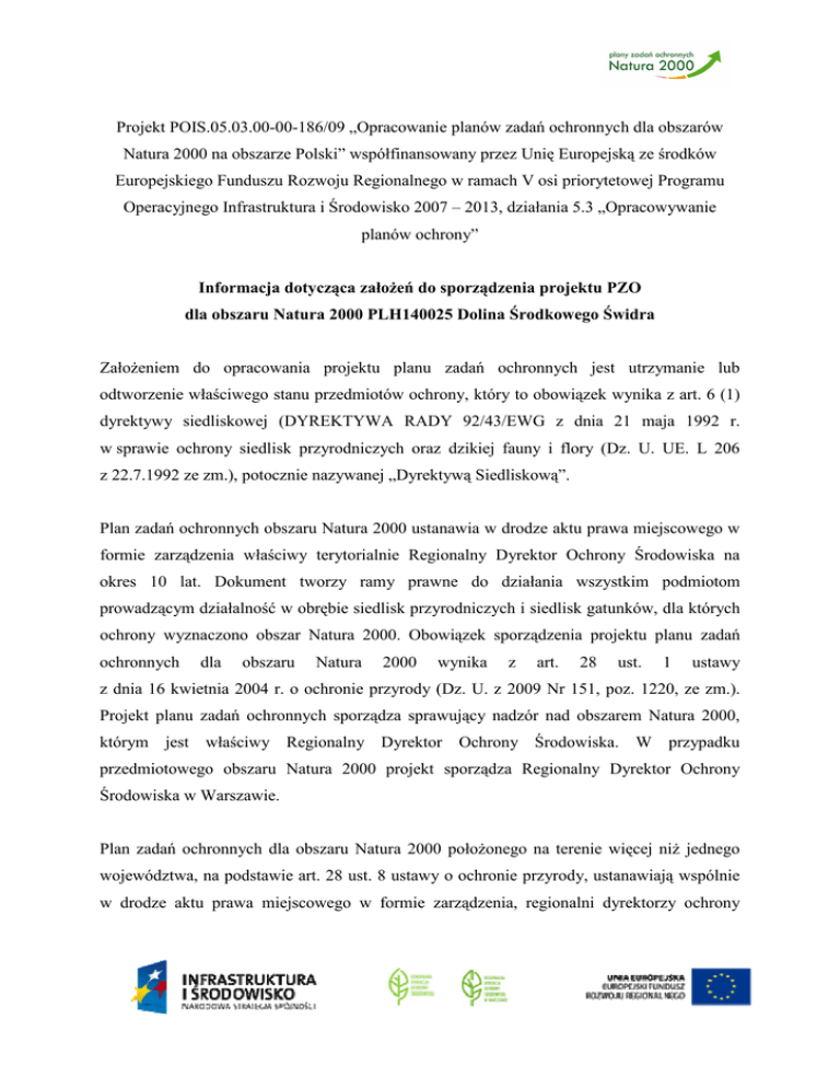 Projekt POIS.05.03.00-00-186/09 „Opracowanie planów zadań ochronnych dla obszarów Natura 2000 na obszarze Polski” współfinansowany przez Unię Europejską ze środków Europejskiego Funduszu Rozwoju Regionalnego w ramach V osi priorytetowej Programu Operacyjnego Infrastruktura i Środowisko 2007 – 2013, działania 5.3 „Opracowywanie planów ochrony” Informacja dotycząca załoŜeń do sporządzenia projektu PZO dla obszaru Natura 2000 PLH140025 Dolina Środkowego Świdra ZałoŜeniem do opracowania projektu planu zadań ochronnych jest utrzymanie lub odtworzenie właściwego stanu przedmiotów ochrony, który to obowiązek wynika z art. 6 (1) dyrektywy siedliskowej (DYREKTYWA RADY 92/43/EWG z dnia 21 maja 1992 r. w sprawie ochrony siedlisk przyrodniczych oraz dzikiej fauny i flory (Dz. U. UE. L 206 z 22.7.1992 ze zm.), potocznie nazywanej „Dyrektywą Siedliskową”. Plan zadań ochronnych obszaru Natura 2000 ustanawia w drodze aktu prawa miejscowego w formie zarządzenia właściwy terytorialnie Regionalny Dyrektor Ochrony Środowiska na okres 10 lat. Dokument tworzy ramy prawne do działania wszystkim podmiotom prowadzącym działalność w obrębie siedlisk przyrodniczych i siedlisk gatunków, dla których ochrony wyznaczono obszar Natura 2000. Obowiązek sporządzenia projektu planu zadań ochronnych dla obszaru Natura 2000 wynika z art. 28 ust. 1 ustawy z dnia 16 kwietnia 2004 r. o ochronie przyrody (Dz. U. z 2009 Nr 151, poz. 1220, ze zm.). Projekt planu zadań ochronnych sporządza sprawujący nadzór nad obszarem Natura 2000, którym jest właściwy Regionalny Dyrektor Ochrony Środowiska. W przypadku przedmiotowego obszaru Natura 2000 projekt sporządza Regionalny Dyrektor Ochrony Środowiska w Warszawie. Plan zadań ochronnych dla obszaru Natura 2000 połoŜonego na terenie więcej niŜ jednego województwa, na podstawie art. 28 ust. 8 ustawy o ochronie przyrody, ustanawiają wspólnie w drodze aktu prawa miejscowego w formie zarządzenia, regionalni dyrektorzy ochrony środowiska, na których obszarze działania znajdują się części tego obszaru kierując się koniecznością utrzymania i przywracania do właściwego stanu ochrony siedlisk przyrodniczych oraz gatunków roślin i zwierząt, dla których ochrony wyznaczono obszar Natura 2000. Obszar Natura 2000 PLH140025 Dolina Środkowego Świdra (zwany dalej „obszarem Natura 2000”) o powierzchni 1475,69 ha, został po raz pierwszy zatwierdzony Decyzją Komisji Europejskiej z dnia 10.01.2011 r. w sprawie przyjęcia na mocy dyrektywy Rady 92/43/EWG czwartego zaktualizowanego wykazu terenów mających znaczenie dla Wspólnoty składającego się na kontynentalny region biogeograficzny (nr aktu normatywnego C(2010) 9669), opublikowaną w Dzienniku Urzędowym Unii Europejskiej w dniu 8 lutego 2011 r. Rzeka Świder, będąca prawym dopływem Wisły, przepływa przez Niziny - Środkowomazowiecką i Południowopdlaską. Maksymalna rozpiętość stanu wody Świdra wynosi 2,3 m. Nazwa rzeki pochodzi prawdopodobnie od prasłowiańskiego wyrazu swid lub świd (praindoeuropejski rdzeń sweld), który oznacza woda, wilgotny, błyszczeć. MoŜe równieŜ wynikać z krętego charakteru rzeki, jak równieŜ powstających w jej nurcie wirów wodnych - świdrów. Rzeka na terenie Obszaru płynie na znacznym odcinku naturalnym, meandrującym korytem. Interesującym elementem Obszaru w okolicy SłuŜewa jest pojedynczy oz o wysokości bezwzględnej 154,27 m n.p.m. Jego wysokość względna w stosunku do poziomu doliny Świdra wynosi 26,5 m. Długość ozu wynosi ok. 350 m, z czego 130 m przypada na jego grzbiet. Szerokość tego utworu wynosi 120 m. Oz objęty jest ochroną rezerwatową (rezerwat Wólczańska Góra). Przedmiotem ochrony na obszarze są następujące siedliska przyrodnicze oraz gatunki zwierząt: • 3150 - Starorzecza i naturalne eutroficzne zbiorniki wodne • 6120 - Ciepłolubne śródlądowe murawy napiaskowe • 6410 - Zmiennowilgotne łąki trzęślicowe • 6430 - Ziołorośla górskie i nadrzeczne • 6510 - NiŜowe i górskie świeŜe łąki uŜytkowane ekstensywnie • 7230 - Górskie i nizinne torfowiska zasadowe o charakterze młak, turzycowisk i mechowisk • 91E0 - Łęgi wierzbowe, topolowe, olszowe i jesionowe • 91F0 - Łęgowe lasy dębowo-wiązowo-jesionowe • 1337 - Bóbr europejski • 1355 - Wydra europejska • 1188 - Kumak nizinny • 1098 - Minóg ukraiński • 1134 - RóŜanka • 1145 - Piskorz • 1149 - Koza • 1037 - Trzepla zielona • 1060 - Czerwończyk nieparek • 1014 - Poczwarówka zwęŜona • 1015 - Poczwarówka zmienna Lista przedmiotów ochrony moŜe ulec weryfikacji w toku prac. Projekt planu zadań ochronnych, sporządzony zgodnie z Rozporządzeniem Ministra Środowiska z dnia 17 lutego 2010 r. w sprawie sporządzania projektu planu zadań ochronnych dla obszaru Natura 2000 zawierał będzie: opis granic obszaru, ocenę stanu ochrony przedmiotów ochrony, identyfikację istniejących i potencjalnych zagroŜeń dla zachowania właściwego stanu ochrony siedlisk przyrodniczych i gatunków, dla których wyznaczono obszar, cele działań ochronnych – konieczność zachowania lub odtworzenia właściwego stanu ochrony przedmiotów ochrony, wykaz działań ochronnych wraz z podaniem obszarów ich wdraŜania oraz określeniem podmiotu odpowiedzialnego za ich wykonanie, wskazania do istniejących studiów uwarunkowań i kierunków zagospodarowania przestrzennego gmin, miejscowych planów zagospodarowania przestrzennego oraz planów zagospodarowania przestrzennego województw. W celu umoŜliwienia zainteresowanym osobom i podmiotom prowadzącym działalność w obrębie siedlisk przyrodniczych oraz siedlisk gatunków, dla których wyznaczono obszar udziału w pracach nad projektem planu zadań ochronnych, zorganizowane będą warsztaty lokalne dotyczące przedmiotowego obszaru. Z dniem ogłoszenia o przystąpieniu do sporządzenia projektu planu zdań ochronnych podan