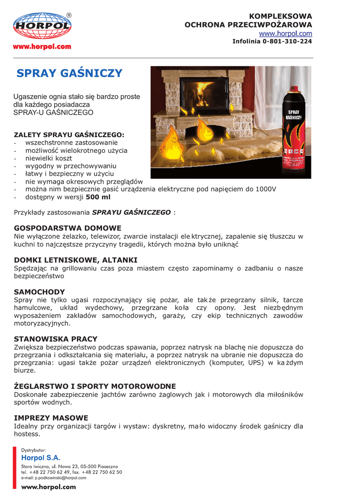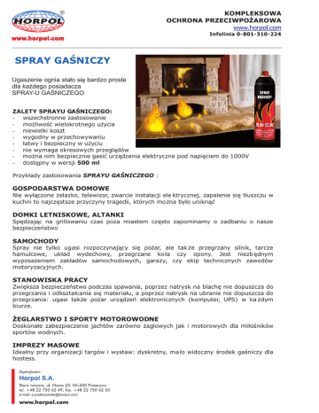 ® SPRAY GAŒNICZY Ugaszenie ognia sta³o siê bardzo proste dla ka¿dego posiadacza SPRAY-U GAŒNICZEGO ZALETY SPRAYU GAŒNICZEGO: - wszechstronne zastosowanie - mo¿liwoœæ wielokrotnego u¿ycia - niewielki koszt - wygodny w przechowywaniu - ³atwy i bezpieczny w u¿yciu - nie wymaga okresowych przegl¹dów - mo¿na nim bezpiecznie gasiæ urz¹dzenia elektryczne pod napiêciem do 1000V - dostêpny w wersji 500 ml Przyk³ady zastosowania SPRAYU GAŒNICZEGO : GOSPODARSTWA DOMOWE Nie wy³¹czone ¿elazko, telewizor, zwarcie instalacji ele ktrycznej, zapalenie siê t³uszczu w kuchni to najczêstsze przyczyny tragedii, których mo¿na by³o unikn¹æ DOMKI LETNISKOWE, ALTANKI Spêdzaj¹c na grillowaniu czas poza miastem czêsto zapominamy o zadbaniu o nasze bezpieczeñstwo SAMOCHODY Spray nie tylko ugasi rozpoczynaj¹cy siê po¿ar, ale tak ¿e przegrzany silnik, tarcze hamulcowe, uk³ad wydechowy, przegrzane ko ³a czy opony. Jest niezb êdnym wyposa¿eniem zak³adów samochodowych, gara¿y, czy ekip technicznych zawodów motoryzacyjnych. STANOWISKA PRACY Zwiêksza bezpieczeñstwo podczas spawania, poprzez natrysk na blachê nie dopuszcza do przegrzania i odkszta³cania siê materia³u, a poprzez natrysk na ubranie nie dopuszcza do przegrzania: ugasi tak¿e po¿ar urz¹dzeñ elektronicznych (komputer, UPS) w ka ¿dym biurze. ¯EGLARSTWO I SPORTY MOTOROWODNE Doskona³e zabezpieczenie jachtów zarówno ¿aglowych jak i motorowych dla mi³oœników sportów wodnych. IMPREZY MASOWE Idealny przy organizacji targów i wystaw: dyskretny, ma ³o widoczny œrodek gaœniczy dla hostess. S.A. e-mail: [email protected]