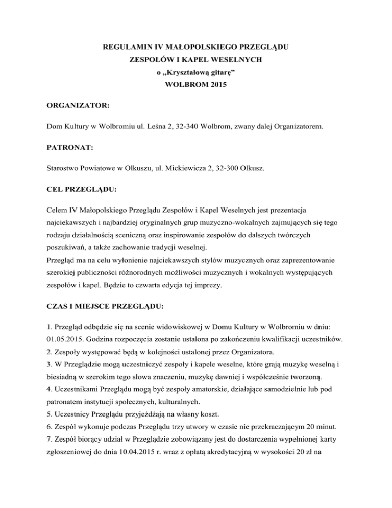 REGULAMIN IV MAŁOPOLSKIEGO PRZEGLĄDU ZESPOŁÓW I KAPEL WESELNYCH o „Kryształową gitarę” WOLBROM 2015 ORGANIZATOR: Dom Kultury w Wolbromiu ul. Leśna 2, 32-340 Wolbrom, zwany dalej Organizatorem. PATRONAT: Starostwo Powiatowe w Olkuszu, ul. Mickiewicza 2, 32-300 Olkusz. CEL PRZEGLĄDU: Celem IV Małopolskiego Przeglądu Zespołów i Kapel Weselnych jest prezentacja najciekawszych i najbardziej oryginalnych grup muzyczno-wokalnych zajmujących się tego rodzaju działalnością sceniczną oraz inspirowanie zespołów do dalszych twórczych poszukiwań, a także zachowanie tradycji weselnej. Przegląd ma na celu wyłonienie najciekawszych stylów muzycznych oraz zaprezentowanie szerokiej publiczności różnorodnych możliwości muzycznych i wokalnych występujących zespołów i kapel. Będzie to czwarta edycja tej imprezy. CZAS I MIEJSCE PRZEGLĄDU: 1. Przegląd odbędzie się na scenie widowiskowej w Domu Kultury w Wolbromiu w dniu: 01.05.2015. Godzina rozpoczęcia zostanie ustalona po zakończeniu kwalifikacji uczestników. 2. Zespoły występować będą w kolejności ustalonej przez Organizatora. 3. W Przeglądzie mogą uczestniczyć zespoły i kapele weselne, które grają muzykę weselną i biesiadną w szerokim tego słowa znaczeniu, muzykę dawniej i współcześnie tworzoną. 4. Uczestnikami Przeglądu mogą być zespoły amatorskie, działające samodzielnie lub pod patronatem instytucji społecznych, kulturalnych. 5. Uczestnicy Przeglądu przyjeżdżają na własny koszt. 6. Zespół wykonuje podczas Przeglądu trzy utwory w czasie nie przekraczającym 20 minut. 7. Zespół biorący udział w Przeglądzie zobowiązany jest do dostarczenia wypełnionej karty zgłoszeniowej do dnia 10.04.2015 r. wraz z opłatą akredytacyjną w wysokości 20 zł na podane konto bankowe lub osobiście w Domu Kultury w Wolbromiu oraz wysłanie drogą mailową nagrania DEMO. Bank Spółdzielczy w Wolbromiu 80 845 00005 0000 0000 5210 0002 (z dopiskiem: Wpisowe – IV MAŁOPOLSKI PRZEGLĄD ZESPOŁÓW I KAPEL WESELNYCH ). adres Organizatora: Dom Kultury w Wolbromiu ul. Leśna 2, 32-340 Wolbrom tel.: 32 706 53 74 / 606 721 082 fax: 32 647 24 00 e-mail: [email protected] OCENA: 1. Wykonawców uczestniczących w Przeglądzie oceniać będzie Jury składające się z profesjonalnych muzyków i ludzi z branży muzycznej. 2. Jury oceni m.in. 1 poziom wykonawczy 2 prezentowany repertuar 3 brzmienie 4 aranżację i ogólne wrażenie artystyczne 5 spostrzeżenia z reakcji odbiorców-publiczności 6 umiejętności wodzirejskie NAGRODY: 1. Zwycięzca otrzyma tytuł „NAJLEPSZY ZESPÓŁ WESELNY – WOLBROM 2015” oraz nagrody: umieszczenie informacji reklamowej na ekranie kinowym przed każdym seansem w kinie Radość oraz na stronie internetowej www.dk.wolbrom.pl do końca 2015 roku. KRYTERIA TECHNICZNE: Organizatorzy zapewniają profesjonalną scenę z nagłośnieniem i oświetleniem oraz obsługę akustyczną. UWAGI: 1. Organizator zastrzegają sobie prawo do ostatecznej interpretacji Regulaminu. 2. Szczegółowe informacje: Dom Kultury w Wolbromiu tel.: 32 706 53 74, strona internetowa www.dk.wolbrom.pl.