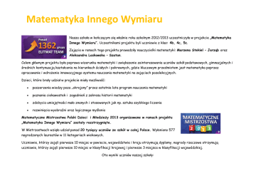 Matematyka Innego Wymiaru Nasza szkoła w kończącym się właśnie roku szkolnym 2012/2013 uczestniczyła w projekcie „Matematyka Innego Wymiaru”. Uczestnikami projektu byli uczniowie z klas: 4b, 4c, 5c. Zajęcia w ramach tego projektu prowadziły nauczycielki matematyki: Marzena Stekiel – Jarząb oraz Aleksandra Laskowska – Szatan. Celem głównym projektu była poprawa wizerunku matematyki i zwiększenie zainteresowania uczniów szkół podstawowych, gimnazjalnych i średnich kontynuacją kształcenia na kierunkach ścisłych i pokrewnych, gdzie kluczowym przedmiotem jest matematyka poprzez opracowanie i wdrożenie innowacyjnego systemu nauczania matematyki na zajęciach pozalekcyjnych. Dzieci, które brały udział w projekcie miały możliwość: poszerzenia wiedzy poza „okrojony” przez ostatnie lata program nauczania matematyki poznania ciekawostek i zagadnień z zakresu historii matematyki zdobycia umiejętności mało znanych i stosowanych jak np. sztuka szybkiego liczenia rozwinięcia wyobraźni oraz logicznego myślenia Matematyczne Mistrzostwa Polski Dzieci i Młodzieży 2013 organizowane w ramach projektu „Matematyka Innego Wymiaru” zostały rozstrzygnięte. W Mistrzostwach wzięło udział ponad 20 tysięcy uczniów ze szkół w całej Polsce. Wyłoniono 577 nagrodzonych laureatów w 11 kategoriach wiekowych. Uczniowie, którzy zajęli pierwsze 10 miejsc w powiecie, województwie i kraju otrzymują dyplomy, nagrody rzeczowe otrzymują uczniowie, którzy zajęli pierwsze 10 miejsc w klasyfikacji krajowej i pierwsze 3 miejsca w klasyfikacji wojewódzkiej. Oto wyniki uczniów naszej szkoły: WYNIKI MATEMATYCZNYCH MISTRZOSTW POLSKI DZIECI I MŁODZIEŻY Projekt „Matematyka innego wymiaru” l.p. Imię i nazwisko ucznia Typ szkoły Klasa Nr w dzienniku Liczba punktów C 12 Oddział miejsce dyplom nagroda 33 TAK Gra logiczna, książka „Kwadratolandia”, linijka 3D P W K 43 1 2 1 KONWANT BLAZEJ P 4 2 TARNAWSKA WERONIKA P 4 B 21 36 2 5 89 TAK 3 MARCEL DYBEK P 4 C 05 28 6 15 206 TAK 4 SOROBKA TOMASZ P 4 B 19 26 7 19 267 TAK 5 RADZISZEWSKA LIDIA P 4 B 16 24 9 28 342 TAK 6 KOCZAR ALEKSANDRA P 4 C 11 24 9 28 342 TAK 7 SIPA BARBARA P 4 C 23 22 12 33 429 NIE 8 RASZEJA FILIP P 4 C 22 21 14 38 497 NIE 9 MACIEJEWSKI LUKASZ P 4 C 17 19 15 43 596 NIE 10 ZALANOWSKI FILIP P 4 B 27 18 16 46 640 NIE 11 DYNIA BARTOSZ P 4 C 06 15 17 60 922 NIE 12 KUBERA WIKTORIA P 4 A 14 15 17 60 922 NIE 13 KRZYSZTON KAMILA P 4 C 14 14 19 65 989 NIE 14 OSTROWSKI MICHAL P 4 B 12 10 21 84 1398 NIE 15 LISZEWSKI ERYK P 4 C 16 8 23 96 1608 NIE 16 GROSZEK AGATA P 4 C 07 1 24 139 2410 NIE 17 LENARTOWICZ ADRIAN P 4 B 09 1 24 139 2410 NIE 18 STEC EMILIA P 5 C 22 41 3 8 131 TAK 19 KAMYK P 5 C 08 36 4 15 241 TAK 20 BOHDANOWLCZ KUBA P 5 C 02 21 11 67 1213 NIE 21 KISZ PAWEL P 5 C 09 18 13 88 1491 NIE 22 MISZTUR DOMINIK P 5 C 13 18 13 88 1491 NIE 23 PIASKOWSKI HUBERT P 5 C 18 16 16 108 1702 NIE MIKOLAJ