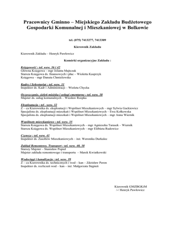 Pracownicy Gminno – Miejskiego Zakładu Budżetowego Gospodarki Komunalnej i Mieszkaniowej w Bolkowie tel. (075) 7413277, 7413309 Kierownik Zakładu Kierownik Zakładu – Henryk Pawłowicz Komórki organizacyjne Zakładu : Księgowość : tel. wew. 36 i 42 Główna Księgowa – mgr Jolanta Majtczak Starsza Księgowa ds. finansowych i płac – Wioletta Kasprzyk Księgowa – mgr Danuta Chmielewska Kadry i Sekretariat : tel. wew. 31 Inspektor ds. Kadr i Administracji – Wioleta Chycka Oczyszczanie, zieleń miejska i usługi cmentarne : tel. wew. 38 Majster ds. usług komunalnych – Wiesław Rzepka Eksploatacja : tel . wew. 32 Z – ca Kierownika ds. eksploatacji i Wspólnot Mieszkaniowych – mgr Sylwia Gackiewicz Specjalista ds. eksploatacji mieszkań i Wspólnot Mieszkaniowych – Ewa Kołkowska Specjalista ds. eksploatacji mieszkań i Wspólnot Mieszkaniowych – mgr Anna Wiernik Wspólnoty mieszkaniowe : tel. wew. 35 Starsza Księgowa ds. Wspólnot Mieszkaniowych – mgr Agnieszka Tarasek – Wiernik Starsza Księgowa ds. Wspólnot Mieszkaniowych – mgr Elżbieta Rudowicz Czynsze : tel. wew. 41 Inspektor ds. Zasobów Mieszkaniowych – inż. Weronika Durkalec Zakład Remontowy, Transport : tel. wew. 40, 38 Starszy Majster – Stanisław Popiel Majster zakładu remontowego i transportu – Marek Kwiatkowski Wodociągi i kanalizacja : tel. wew. 39 Z – ca Kierownika ds. technicznych i wod – kan – Zdzisław Peron Inspektor ds. rozliczeń wod – kan – inż. Małgorzata Stępień Kierownik GMZBGKiM /-/ Henryk Pawłowicz
