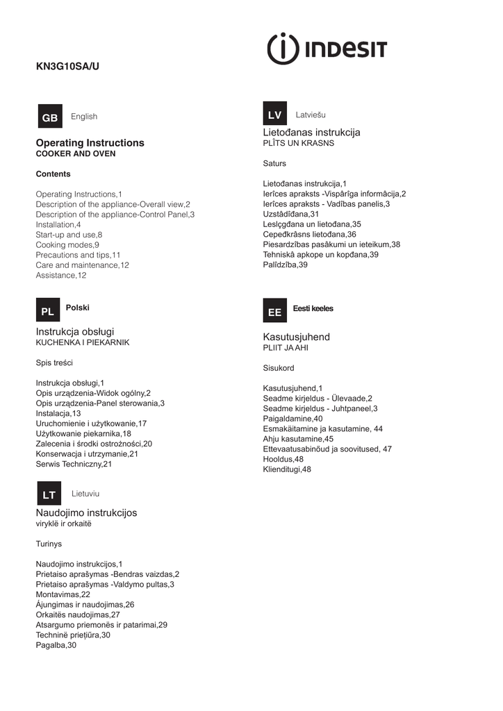 KN3G10SA/U English GB Operating Instructions Latviešu LV Lietođanas instrukcija PLÎTS UN KRASNS COOKER AND OVEN Saturs Contents Operating Instructions,1 Description of the appliance-Overall view,2 Description of the appliance-Control Panel,3 Installation,4 Start-up and use,8 Cooking modes,9 Precautions and tips,11 Care and maintenance,12 Assistance,12 PL Polski Instrukcja obsługi KUCHENKA I PIEKARNIK Spis treści Instrukcja obsługi,1 Opis urządzenia-Widok ogólny,2 Opis urządzenia-Panel sterowania,3 Instalacja,13 Uruchomienie i użytkowanie,17 Użytkowanie piekarnika,18 Zalecenia i środki ostrożności,20 Konserwacja i utrzymanie,21 Serwis Techniczny,21 LT Lietuviu Naudojimo instrukcijos viryklë ir orkaitë Turinys Naudojimo instrukcijos,1 Prietaiso aprašymas -Bendras vaizdas,2 Prietaiso aprašymas -Valdymo pultas,3 Montavimas,22 Ájungimas ir naudojimas,26 Orkaitës naudojimas,27 Atsargumo priemonës ir patarimai,29 Techninë prieţiűra,30 Pagalba,30 Lietođanas instrukcija,1 Ierîces apraksts -Vispârîga informâcija,2 Ierîces apraksts - Vadîbas panelis,3 Uzstâdîđana,31 Leslçgđana un lietođana,35 Cepeđkrâsns lietođana,36 Piesardzîbas pasâkumi un ieteikum,38 Tehniskâ apkope un kopđana,39 Palîdzîba,39 EE Eesti keeles Kasutusjuhend PLIIT JA AHI Sisukord Kasutusjuhend,1 Seadme kirjeldus - Ülevaade,2 Seadme kirjeldus - Juhtpaneel,3 Paigaldamine,40 Esmakäitamine ja kasutamine, 44 Ahju kasutamine,45 Ettevaatusabinőud ja soovitused, 47 Hooldus,48 Klienditugi,48 LT 1 7 2 8 3 9 10 11 12 13 4 5 6 6 Description of the appliance Overall view 1.Hob burner 2 Hob Grid 3.Control panel 4.Sliding grill rack 5.DRIPPING pan 6.Adjustable foot 7.Containment surface for spills 8.GUIDE RAILS for the sliding racks 9.position 5 10.position 4 11.position 3 12.position 2 13.position 1 PL Opis urządzenia Widok ogólny 1. Palnik gazowy 2.Ruszta płyty podpalnikowej 3.Panel kontrolny 4.Półka ruszt 5.Półka brytfanna 6.Nóżki regulowane 7. Płyta podpalnikowa 8.Prowadnice półek 9.pozycja 5 10.pozycja 4 11.pozycja 3 12.pozycja 2 13.pozycja 1 2 Bendras vaizdas 1.Dujų degiklis 2. Kaitlentès tinklelis 3.Valdymo pultas 4.KEPSNINÈ 5.SURINKIMO INDAS 6. Reguliuojamoji kojelè (Yra tik tam tikruose modeliuose) 7. TIškalų sulaikymo paviršius 8.Slankiųjų grotelių TAKELIAI 9. padètis 5 10.padètis 5 11.padètis 5 12. padètis 5 13. padètis 5 LV GB Prietaiso aprađymas Ierîces apraksts Vispariga informacija 1.Gćzes deglis 2.Plīts virsmas režģisģ 3.STIKLA KERAMIKAS VIRSMA 4.Vadības panelis 5.CEPE TAUKU PANNA 6.Regulējama kāja 7 Norobe˛ota virsma traipiem 8.VADOTNES slīdošo pamatņu ievietošanai un izņemšanai 9. pozīcija 5 10.pozīcija 4 11.pozīcija 3 12.pozīcija 2 13.pozīcija 1 EE Seadme kirjeldus Ülevaade 1.Gaasipõleti 2.Rest 3.Juhtpaneel 4.GRILL 5.TILGAPANN 6.Reguleerimisjalg 7.Tilgaalus 8.SIINID restide sisestamiseks 9. tasand 5 10. tasand 4 11.tasand 3 12.tasand 2 13.tasand 1 2 1 GB 4 3 5 GnB Description of the appliance Control panel 1.GAS BURNER IGNITION button 2.TIMER knob 3.THERMOSTAT knob 4.THERMOSTAT indicator light 5.SELECTOR knob 6.Hob BURNER control knob Opis urządzenia P L Panel kontrolny 1.ZAPALARKApalników płyty 2.Pokrętło MINUTNIKA 3.Pokrętło TERMOSTATU 4.Lampka kontrolna TERMOSTATU 5.Pokrętło PROGRAMÓW PIEKARNIKA 6.Pokrętło PALNIKÓW PŁYTY GRZEJNEJ LT 6 LV Ierîces apraksts Vispariga informacija 1.GĀZES DEGĻA iedegšanas poga 2.TAIMERA slēdzis 3.TERMOSTATA slēdzis 4.TERMOSTATA indikatora gaisma 5.SELEKTORA slēdzis 6.DEGĻA vadības slēdzi EE Seadme kirjeldus Juhtpaneel 1.GAASIPÕLETI süütenupp 2.TAIMERI nupp 3.TERMOSTAADI nupp 4.TERMOSTAADI näidikutuli 5.VALIKUlüliti 6.PÕLETITE reguleernupp Prietaiso aprađymas Valdymo pultas 1.Elektroninis kaitlentčs degikilř apšvietimas 2.LAIKMAČIO rankenčlč 3.TERMOSTATO rankenčlč 4.Indikacinč TERMOSTATO lemputč 5.PARINKIMO rankenčlč 6.Kaitlentčs dujř degikilř valdymo rankenčlčs 3 Installation GB ! Before operating your new appliance please read this instruction booklet carefully. It contains important information concerning the safe installation and operation of the appliance. ! Please keep these operating instructions for future reference. Make sure that the instructions are kept with the appliance if it is sold, given away or moved. Disposing of combustion fumes The disposal of combustion fumes should be guaranteed using a hood connected to a safe and efficient natural suction chimney, or using an electric fan that begins to operate automatically every time the appliance is switched on (see figure). ! The appliance must be installed by a qualified professional according to the instructions provided. ! Any necessary adjustment or maintenance must be performed after the cooker has been disconnected from the electricity supply. Fumes channelled straight outside Room ventilation The appliance may only be installed in permanentlyventilated rooms, according to current national legislation. The room in which the appliance is installed must be ventilated adequately so as to provide as much air as is needed by the normal gas combustion process (the flow of air must not be lower than 2 m3/h per kW of installed power). The air inlets, protected by grilles, should have a duct with an inner cross section of at least 100 cm2 and should be positioned so that they are not liable to even partial obstruction (see figure A). These inlets should be enlarged by 100% - with a minimum of 200 cm2 - whenever the surface of the hob is not equipped with a flame failure safety device. When the flow of air is provided in an indirect manner from adjacent rooms (see figure B), provided that these are not communal parts of a building, areas with increased fire hazards or bedrooms, the inlets should be fitted with a ventilation duct leading outside as described above. Adjacent room B A Room requiring ventilation A Ventilation opening for comburent air Increase in the gap between the door and the fl