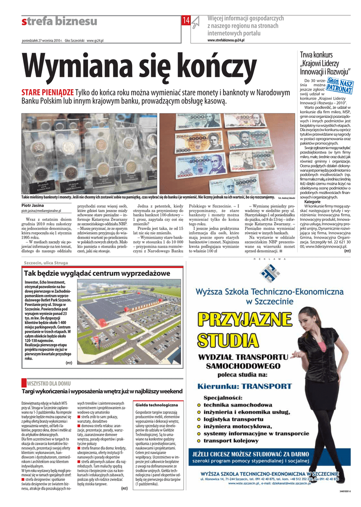 strefa biznesu 14 Więcej informacji gospodarczych z naszego regionu na stronach internetowych portalu www.strefabiznesu.gs24.pl poniedziałek 27 września 2010 r. Głos Szczeciński www.gs24.pl Trwa konkurs „Krajowi Liderzy Innowacji i Rozwoju” Wymiana się kończy STARE PIENIĄDZE Tylko do końca roku można wymieniać stare monety i banknoty w Narodowym Banku Polskim lub innym krajowym banku, prowadzącym obsługę kasową. Takie mieliśmy banknoty i monety. Jeśli nie chcemy ich zostawić sobie na pamiątkę, czas wybrać się do banku i je wymienić. Nie liczmy jednak na ich wartość, bo się rozczarujemy. Piotr Jasina [email protected] Wraz z ostatnim dniem grudnia 2010 roku zakończy się jednocześnie denominacja, która rozpoczęła się 1 stycznia 1995 roku. – W mediach zaczęły się pojawiać informacje na ten temat, dlatego do naszego oddziału przychodzi coraz więcej osób, które gdzieś tam jeszcze miały schowane stare pieniądze – informuje Katarzyna Zwarzany ze szczecińskiego oddziału NBP. – Muszę przyznać, że ze sporym zdziwieniem przyjmują do wiadomości wartość po przeliczeniu w polskich nowych złotych. Mało kto pamięta o stosunku przeliczeń, jaki się stosuje. Jedna z petentek, kiedy otrzymała za przyniesiony do banku banknot 100-złotowy – 1 grosz, zapytała czy coś się zmieniło? Prawda jest taka, że od 15 lat nic się nie zmieniło. – Wymieniamy stare banknoty w stosunku 1 do 10 000 – przypomina nasza rozmówczyni z Narodowego Banku Polskiego w Szczecinie. – I przypominamy, że stare banknoty i monety można wymieniać tylko do końca tego roku. I jeszcze jedna praktyczna informacja dla osób, które mają jeszcze sporo starych banknotów i monet. Najniższa kwota podlegająca wymianie to właśnie 100 zł Fot. Andrzej Szkocki – Wymianę pieniędzy prowadzimy w siedzibie przy ul. Starzyńskiego 1 od poniedziałku do piątku, od 8 do 13-tej – informuje Katarzyna Zwarzany. – Pieniądze można wymieniać również w innych bankach. Na wystawie w oddziale szczecińskim NBP prezentowane są wizerunki monet sprzed denominacji. R E K L A M Do 30 września można jeszcze zgłosić swój udział w konkursie „Krajowi Liderzy Innowacji i Rozwoju – 2010”. Warto podkreślić, że udział w konkursie dla firm mikro, MŚP, gmin oraz organizacji pozarządowych i innych podmiotów jest bezpłatny na wszystkich etapach. Dla zwycięzców konkursu oprócz tytułów przewidziane są nagrody w postaci oprogramowania oraz pakietów promocyjnych. Swojezgłoszeniamogąnadsyłać przedsiębiorstwa (w tym firmy mikro, małe, średnie oraz duże) jak również gminny i organizacje. Ocena podjętych działań dokonywana jest pomiędzy podmiotami o podobnych możliwościach (np. firmamałazmałą,aśredniazśrednią itd.) dzięki czemu można liczyć na obiektywną ocenę podmiotów o podobnych możliwościach finansowych i organizacyjnych. Kategorie W konkursie firmy mogą uzyskać następujące tytuły i wyróżnienia: Innowacyjna firma, Innowacyjny produkt, Innowacyjna usługa, Innowacyjny projekt unijny, Dynamicznie rozwijająca się firma, Innowacyjna Gmina, Innowacyjna Organizacja. Szczegóły tel. 22 621 30 00, www.liderzyinnowacji.pl. (PIT) A Szczecin, ulica Struga Tak będzie wyglądać centrum wyprzedażowe Inwestor, Echo Investment, otrzymał pozwolenie na budowę pierwszego w Zachodniopomorskiem centrum wyprzedażowego Outlet Park Szczecin. Powstanie przy ul. Struga w Szczecinie. Powierzchnia pod wynajem wyniesie ponad 23 tys. m kw. Do dyspozycji klientów będzie około 1 400 miejsc parkingowych. Centrum powstanie w trzech etapach. W całym obiekcie będzie około 120-130 najemców. Realizacja pierwszego etapu projektu rozpocznie się już w pierwszym kwartale przyszłego roku. (PIT) WSZYSTKO DLA DOMU Targi wykończenia i wyposażenia wnętrz już w najbliższy weekend Dziewiętnastą edycję w halach MTS przy ul. Struga w Szczecinie zaplanowano na 1-3 października. Na imprezie tradycyjnie będzie można zapoznać się z pełną ofertą branży wykończenia i wyposażenia wnętrz, od farb i lakierów, poprzez okna, drzwi i meble aż do artykułów dekoracyjnych. Dla firm uczestnictwo w targach to okazja do zawarcia kontaktów biznesowych, prezentacji swojej oferty klientom: wykonawcom, handlowcom i dystrybutorom, rzemieślnikom i architektom oraz klientom indywidualnym. W tym roku wystawcy będą mogli promować się w ramach specjalnych stref: d strefa designerów: spotkanie świata designerów ze światem biznesu, atrakcje dla poszukujących no- wych trendów i zainteresowanych wzornictwem i projektowaniem zawodowo czy amatorsko d strefa zrób to sam: pokazy, warsztaty, doradztwo d domowa strefa relaksu: aranżacje, prezentacje, porady, warsztaty, zaaranżowane domowe wnętrza, porady ekspertów i praktyczne pokazy d strefa finanse dla domu: kredyty, ubezpieczenia, oferty instytucji finansowych i porady ekspertów d strefa aktywnych zabaw: dla najmłodszych. Tam maluchy spędzą twórczo i bezpiecznie czas na konkursach i edukacyjnych zabawach, podczas gdy ich rodzice zwiedzać będą stoiska targowe. (PIT) Giełda technologiczna Gospodarze targów zapraszają producentów mebli, elementów wyposażenia i dekoracji wnętrz, salony sprzedaży oraz developerów do udziału w Giełdzie Technologicznej. Są to umawiane na konkretne godziny spotkania z przedsiębiorcami, naukowcami i projektantami. Celem jest nawiązanie współpracy. Uczestnictwo w imprezie jest całkowicie bezpłatne z uwagi na dofinansowanie ze środków unijnych. Giełda technologiczna i panel ekspertów odbędą się pierwszego dnia targów (1 października). 344010S01-A