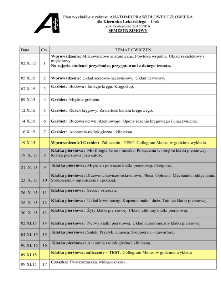 Plan wykładów z zakresu ANATOMII PRAWIDŁOWEJ CZŁOWIEKA dla Kierunku Lekarskiego – I rok rok akademicki 2015/2016 SEMESTR ZIMOWY Data Ćw. TEMAT ĆWICZEŃ Wprowadzenie: Mianownictwo anatomiczne. Powłoka wspólna. Układ szkieletowy i mięśniowy. Na zajęcia studenci przychodzą przygotowani z danego tematu. 02.X. 15 1 05.X.15 2 07.X.15 3 09.X.15 4 Grzbiet: Mięśnie grzbietu. 12.X.15 5 Grzbiet: Rdzeń kręgowy. Zawartość kanału kręgowego. 14.X.15 6 Grzbiet: Budowa nerwu rdzeniowego. Opony rdzenia kręgowego i unaczynienie. 16.X.15 7 Grzbiet: Anatomia radiologiczna i kliniczna. Wprowadzenie: Układ sercowo-naczyniowy. Układ nerwowy. Grzbiet: Budowa i funkcje kręgu. Kręgosłup. 19.X.15 Wprowadzenie i Grzbiet: Zaliczenie - TEST. Collegium Maius, w godzinie wykładu 19. X. 15 8 Klatka piersiowa: Morfologia żeber i mostka. Połączenia w obrębie klatki piersiowej. Klatka piersiowa jako całość. 21. X. 15 9 23. X. 15 Klatka piersiowa: Drzewo tchawiczo-oskrzelowe. Płuca. Opłucna. Mechanika oddychania. 10 Śródpiersie – ograniczenia i podział. 26. X. 15 11 28. X. 15 12 30. X. 15 13 02.XI.15 14 Klatka piersiowa: Nerwy klatki piersiowej. Układ autonomiczny klatki piersiowej. 04.XI. 15 15 06.XI. 15 16 Klatka piersiowa: Serce i osierdzie. Klatka piersiowa: Układ krwionośny. Krążenie małe i duże. Tętnice klatki piersiowej. Klatka piersiowa: Żyły klatki piersiowej. Układ chłonny klatki piersiowej. Klatka piersiowa: Sutek. Przełyk. Grasica. Śródpiersie – zawartość. Klatka piersiowa: Anatomia radiologiczna i kliniczna. Klatka piersiowa: zaliczenie – TEST. Collegium Maius, w godzinie wykładu 09.XI.15 09.XI.15 Klatka piersiowa: Mięśnie i powięzie klatki piersiowej. Przepona. 17 Czaszka: Twarzoczaszka. Mózgoczaszka.. 13.XI.15 18 16.XI.15 19 Czaszka: Powierzchnia zewnętrzna i wewnętrzna podstawy czaszki. Czaszka: Anatomia radiologiczna i kliniczna. Czaszka: Zaliczenie- TEST. Collegium Maius w godzinie wykładu 16.XI.15 18.XI.15 20 20.XI.15 21 23.XI.15 22 25.XI.15 23 27.XI.15 24 30.XI.15 25 02.XII.15 26 04.XII.15 27 07.XII.15 28 09.XII.15 29 11.XII.15 30 Głowa: Twarz skalp: mięśnie, nerwy skórne i naczynia powierzchowne. Głowa: Oczodół, gałka oczna i narządy pomocnicze. Głowa: Okolica przyuszna i skroniowa. Staw skroniowo-żuchwowy. Głowa: Okolica ustna. Głowa: Dół skrzydłowo-podniebienny i zawartość. Głowa: Ucho. Głowa: Nos. Głowa: Naczynia głowy. Głowa: Nerwy czaszkowe: I, II, II, IV, VI, V. Głowa: Nerwy czaszkowe: VII, VIII, IX, XI, XII. Głowa: Anatomia radiologiczna i kliniczna. Głowa. Zaliczenie- TEST. Collegium Maius w godzinie wykładu 14.XII.15 14.XII.15 31 16.XII.15 32 18.XII.15 33 Szyja: Okolice szyi. Mięśnie i powięzie szyi. Trójkąty szyi. Szyja: Układ naczyniowy szyi. Szyja: Krtań. Szyja: Gardło. IX i X para nerwów czaszkowych. Gruczoł tarczowy. Przytarczyce. Grasica. 21.XII.15 34 Tchawica. Przełyk. Szyja: Układ nerwowy szyi. 04.I.16 35 08.I.16 36 11.I.16 Szyja. Zaliczenie- TEST. Collegium Maius w godzinie wykładu Mózgowie i rdzeń kręgowy: Morfologia i podział ośrodkowego układu nerwowego. Półkule mózgu. Powierzchnia półkul mózgu. Lokalizacja czynnościowa w korze mózgu. 37 Układ limbiczny. Kresomózgowie środkowe. 11.I.16 Szyja: Anatomia radiologiczna i kliniczna. 13.I.16 Mózgowie i rdzeń kręgowy: Budowa wewnętrzna półkuli mózgu. Komora boczna. 38 Międzymózgowie. Komora III. 15.I.16 39 Mózgowie i rdzeń kręgowy: Pień mózgu – budowa zewnętrzna. Móżdżek. Komora IV. 18.I.16 Mózgowie i rdzeń kręgowy: Pień mózgu – budowa wewnętrzna. Jądra nerwów 40 czaszkowych. 20.I.16 Mózgowie i rdzeń kręgowy: Rdzeń kręgowy. Opony mózgowia i rdzenia kręgowego. 41 Płyn mózgowo- rdzeniowy. Unaczynienie centralnego układu nerwowego. 22.I.16 42 25.I.16 01.II.16 08.II.16 Mózgowie i rdzeń kręgowy: Anatomia radiologiczna i kliniczna. . Mózgowie i rdzeń kręgowy . Zaliczenie- TEST. Collegium Maius w godzinie wykładu Zaliczenie I poprawkowe Zaliczenie II poprawkowe
