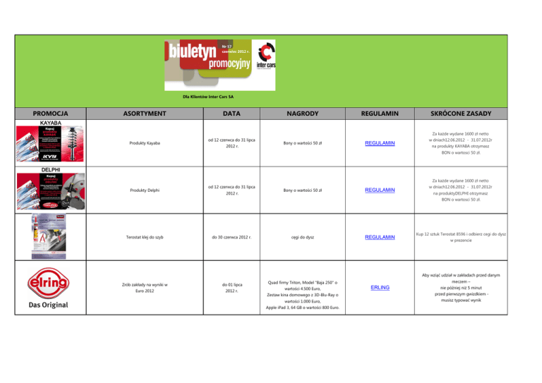 Nr 57 czerwiec 2012 r. Dla Klientów Inter Cars SA PROMOCJA ASORTYMENT DATA NAGRODY REGULAMIN SKRÓCONE ZASADY KAYABA Za każde wydane 1600 zł netto Produkty Kayaba od 12 czerwca do 31 lipca 2012 r. Bony o wartości 50 zł REGULAMIN w dniach12.06.2012 - 31.07.2012r na produkty KAYABA otrzymasz BON o wartosci 50 zł. DELPHI Za każde wydane 1600 zł netto Produkty Delphi od 12 czerwca do 31 lipca 2012 r. Bony o wartości 50 zł REGULAMIN w dniach12.06.2012 - 31.07.2012r na produktyDELPHI otrzymasz BON o wartosci 50 zł. Terostat klej do szyb do 30 czerwca 2012 r. cęgi do dysz REGULAMIN Kup 12 sztuk Terostat 8596 i odbierz cegi do dysz w prezencie Aby wziąć udział w zakładach przed danym Zrób zakłady na wyniki w do 01 lipca Euro 2012 2012 r. meczem – Quad firmy Triton, Model "Baja 250" o wartości 4.500 Euro, Zestaw kina domowego z 3D-Blu-Ray o wartości 1.000 Euro, Apple iPad 3, 64 GB o wartości 800 Euro. ERLING nie później niż 5 minut przed pierwszym gwizdkiem musisz typować wynik PROMOCJA ASORTYMENT DATA NAGRODY REGULAMIN SKRÓCONE ZASADY Castrol Moto Od 01 do 30 czerwca 2012 r. Bony paliwowe REGULAMIN ZOBACZ WIĘCEJ Rejs po Mazurach EXIDE Kupując amortyzatory EXIDE, zbierasz punkty FILTRON więcej na temat promocji na stronie: www.GMW.com.pl pokrowiec na wyciagarkę IC 4x4 więcej na stronie www.ic4x4.pl przykładowe narzędzie ZOBACZ WIĘCEJ więcej na www.ic premiaplus.pl Akumulatory Exide Filtry marki Filtron Zestaw wyciągarki DWM 12000 HD Wyposażenie warsztatu za punkty IC PREMIA PLUS od 15 maja do 25 sierpnia 2012 r. od 01 marca do 31 lipca 15 wycieczek do USA, 15 dwuosobowych 2012 r. pobytów na Majorce, bony Sodexo. promocja bez ograniczenia czasowego promocja bez ograniczenia czasowego PROMOCJA ASORTYMENT DATA Nagroda miesiąca czerwiec Sportowe filtry powietrza Pipercross II kwartał 2012 r. Atrakcyjne ceny i rabaty ZOBACZ WIĘCEJ! Tuning Kity 4GAS II II kwartał 2012 r. Atrakcyjne ceny i rabaty ZOBACZ WIĘCEJ! 4 GAS II Zbiorniki LPG II kwartał 2012 r. Atrakcyjne ceny i rabaty ZOBACZ WIĘCEJ! Zbiornik LPG 4MAX 1201-00-0014N +P = 200L NANO+ letni płyn do spryskiwaczy do wyczerpania zapasów NAGRODY za 30 000 ptk otrzymasz zestaw składający się z piłki i koszulki. Za każdy zakup płynu w beczce 200l. klient otrzymuje ręczną pompkę REGULAMIN ZOBACZ WIĘCEJ SKRÓCONE ZASADY za 30 000 ptk otrzymasz zestaw składający się z piłki i koszulki. Za każdy zakup letniego płynu do spryskiwaczy 4MAX w opakowaniu 200L klient otrzymuje ręczną pompkę. 4MAX 1201-00-0007E = 0,5 L. letni koncentrat do spryskiwaczy 1:10 1201-00-0008E = 5L Letni płyn do spryskiwaczy 1201-00-0011E = 2L. Letni płyn do spryskiwaczy 1201-00-0016E = 20L Letni płyn do spryskiwaczy do wyczerpania zapasów Letnie płyny do spryskiwaczy 4MAX - Taniej ZOBACZ WIĘCEJ 4MAX PROMOCJA ASORTYMENT DATA NAGRODY REGULAMIN SKRÓCONE ZASADY Oferta skierowana jest do wszystkich klientów, ZOBACZ WIĘCEJ TERMINALE PŁATNICZE Kompleksowe usługi na obsługę terminali płatniczych POS bez ograniczenia czasowego którzy chcieliby skorzystać z kompleksowej usługi TERMINAL VERIFONE VX 510 na obsługę terminali płatniczych POS. Dodatkowo dla klientów obecnie akceptujacych karty płatnicze ze średnim obrotem przez kartę powyżej 50 000 zł przewidziana jest specjalna oferta. Szczegóły u Przedstawicieli Handlowych we wszystkich oddziałach Inter Cars SA. Oferta skierowana jest do sieci serwisowych: Q-SERVICE, AUTO CREW, PERFECT SERVICE i Skoda Fabia, Ford Fiesta oraz Lancia Ypsilon, a także nowość Skoda Citigo oraz Nowy Fiat Panda jako auto zastępcze w MOTOINTEGRATOR i dotyczy leasingu wybranego Możliwość skorzystania z oferty leasingowej przez cały czas trwania oferty leasingu na 36 lub 48 miesięcy na preferencyjnych warunkach oraz refudacji AUTA ZASTĘPCZE jednym z wielu programów inwestycyinych IC auta poprzez jedną z firm leasingowych (do wyboru Raiffeisen Leasing lub EFL), okres trwania leasingu 36 lub 48 miesięcy. Szczegóły u Przedstawicieli Handlowych we wszystkich oddzialach Inter Cars SA. Nilfisk ADVANCE oraz Nilfisk Alto Myjki, Zamiatarki, Odkurzacze, Maszyny czyszczące Myjnie samochodowe PROMOCJE Z OFERTY WW CDIF Adapter CAN żółty do CDIF/2 KLIKNIJ Elektronarzędzia BOSCH - "80 LAT MŁOTÓW BOSCH" TEXA KONFORT 780R BI-GAS + GRATISY DELPHI ACTIVE + GRATISY Atrakcyjne ceny i rabaty ZOBACZ WIĘCEJ Ceny promocyjne, urządzenia z gwarancją