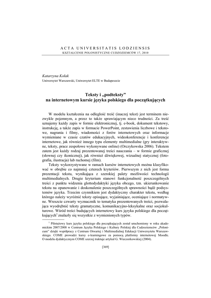 ACTA UNIVERSITATIS LODZIENSIS KSZTAŁCENIE POLONISTYCZNE CUDZOZIEMCÓW 17, 2010 Katarzyna Kołak Uniwersytet Warszawski, Uniwersytet ELTE w Budapeszcie Teksty i „podteksty” na internetowym kursie języka polskiego dla początkujących W modelu kształcenia na odległość treść (inaczej tekst) jest terminem niezwykle pojemnym, a przez to także sprawiającym nieco trudności. Za treść uznajemy każdy zapis w formie elektronicznej, tj. e-book, dokument tekstowy, instrukcję, a także zapis w formacie PowerPoint, zestawienia liczbowe i tekstowe, nagrania i filmy, wiadomości z forów internetowych oraz informacje wymieniane w czasie czatów edukacyjnych, wideokonferencje i konferencje internetowe, jak również innego typu elementy multimedialne (gry interaktywne, teksty, prace zespołowe wykonywane online) (Orczykowska 2006). Tekstem zatem jest każdy rodzaj prezentowanej treści nauczania – w formie graficznej (słownej czy ikonicznej), jak również dźwiękowej, wizualnej statycznej (fotografia, ilustracja) lub ruchomej (film). Teksty wykorzystywane w ramach kursów internetowych można klasyfikować w obrębie co najmniej czterech kryteriów. Pierwszym z nich jest forma prezentacji tekstu, wynikająca z szerokiej palety możliwości technologii multimedialnych. Drugie kryterium stanowi funkcjonalność poszczególnych treści z punktu widzenia glottodydaktyki języka obcego, tzn. ukierunkowanie tekstu na opanowanie i doskonalenie poszczególnych sprawności bądź podsystemów języka. Trzecim czynnikiem jest dydaktyczny charakter tekstu, według którego należy wyróżnić teksty opisujące, wyjaśniające, oceniające i normatywne. Wreszcie czwarty wyznacznik to tematyka prezentowanych treści, pozwalająca wyodrębnić teksty gramatyczne, komunikacyjno-leksykalne oraz socjokulturowe. Wśród treści budujących internetowy kurs języka polskiego dla początkujących1 znalazły się wszystkie z wymienionych typów. 1 Pilotażowy kurs języka polskiego dla początkujących został uruchomiony w roku akademickim 2007/2008 w Centrum Języka Polskiego i Kultury Polskiej dla Cudzoziemców „Polonicum” dzięki współpracy z Centrum Otwartej i Multimedialnej Edukacji Uniwersytetu Warszawskiego. COME prowadzi kursy e-learningowe za pomocą platformy internetowej Moodle. O modelu dydaktycznym COME szerzej traktuje artykuł G. Wieczorkowskiej (2004). [369] 370 Katarzyna Kołak Teksty wyjaśniające i opisowe, przeznaczone do analizy i prezentacji nowego materiału, miały postać plików tekstowych lub stron HTML, plików audio i wideo oraz linków do ogólnie dostępnych w sieci materiałów (stron www). Komentarze gramatyczne, sukcesywnie dodawane w kolejnych tygodniowych modułach, prezentowano w formie książki (słownik pojęć). Zaletą tego narzędzia jest możliwość strukturyzowania materiału poprzez wyodrębnianie mniejszych jednostek (rozdziałów) z zachowaniem jednolitej formy. Sprawdzeniu i ocenie opanowania wiadomości przez uczestników służą teksty w formie testu wyboru, testu uzupełnień, pytań otwartych, pytań do tekstu, pracy grupowej, uczestnictwa w forum, dialogu z innym studentem czy z prowadzącym. Ponadto taką funkcję mają również metody komunikacji między prowadzącym a uczestnikiem – synchroniczne (czaty i telefon internetowy) oraz asynchroniczne (forum i dialog). Większość tekstów, zarówno w nauczaniu stacjonarnym, jak i internetowym, odgrywa jednakowe role. Tekst w tradycyjnym podręczniku czy zamieszczony w ramach kursu internetowego w postaci strony HTML, mający na celu prezentację nowego materiału gramatyczno-leksykalnego, posłuży do rozwijania sprawności czytania ze zrozumieniem, do poszerzania zasobu słownictwa czy do analizowania struktur składniowych. Faktem jest jednak, że może dzięki elektronicznej formie zyskać dodatkową możliwość zastosowania i pełnić nową funkcję. Warunkiem tej wielofunkcyjności, wynikającym ze specyfiki edukacji online, w tym wykorzystania technologii informatycznych, jest odpowiednie i umiejętne dopasowanie komunikowanego tekstu do jego formy (Sokołowski, Skrzypniak 2005: 7). W przeważającej większości, zwłaszcza do wprowadzania nowych treści leksykalnych, posłużyły pliki tekstowe, wzbogacone o fotografie i ilustracje, które znacznie łatwiej prezentować na kursie internetowym niż na zajęciach stacjonarnych. W formie plików PDF czy stron HTML zamieszczono proste słowniczki tematyczne, oparte na leksemie i ilustracji, dotyczące produktów spożywczych, ubrań, kolorów, mebli, podstawowych czasowników opisujących codzienne czynności. Podobną funkcję spełniały autentyczne strony www, do których zostały podane linki. W czasie prowadzenia kursu posłużono się portalem z prognozą pogody, programem telewizyjnym oraz internetową mapą miejscowości. Różnica w pracy z takim tekstem, jakim jest strona serwisu informacyjnego (w porównaniu do tekstu „na papierze”), wynika z faktu aktualizowania ich treści. Wprowadzane modyfikacje wymuszały na studencie obserwację zaistniałych zmian i przyswajanie nowego słownictwa, przynajmniej w czasie pracy z określonym materiałem. Innym typem tekstu, zyskującego szersze zastosowanie podczas nauczania online, był zapis na forum, tworzony ad hoc przez uczestników. Na kursie dla Teksty i „podteskty” na internetowym kursie języka polskiego... 371 początkujących podstawowym (poza prowokowaniem do aktywności) celem tego zadania było sprawdzenie przyswojonych informacji oraz umiejętności generowania prostych wypowiedzi na postawione pytania, a także, w razie potrzeby, korygowanie przez prowadzącego popełnianych błędów. Forum jest narzędziem asynchronicznego kontaktu prowadzącego ze studentami oraz studentów między sobą. Może być moderowane przez dowolny czas, a umieszczane na nim informacje (posty) stanowią dodatkowy materiał dydaktyczny. Funkcjonalnie forum stanowi odpowiednik rozmow