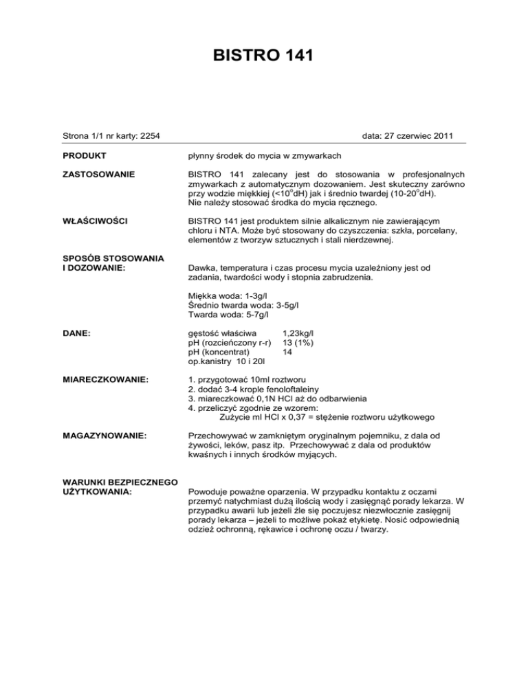 BISTRO 141 Strona 1/1 nr karty: 2254 data: 27 czerwiec 2011 PRODUKT płynny środek do mycia w zmywarkach ZASTOSOWANIE BISTRO 141 zalecany jest do stosowania w profesjonalnych zmywarkach z automatycznym dozowaniem. Jest skuteczny zarówno o o przy wodzie miękkiej (<10 dH) jak i średnio twardej (10-20 dH). Nie należy stosować środka do mycia ręcznego. WŁAŚCIWOŚCI BISTRO 141 jest produktem silnie alkalicznym nie zawierającym chloru i NTA. Może być stosowany do czyszczenia: szkła, porcelany, elementów z tworzyw sztucznych i stali nierdzewnej. SPOSÓB STOSOWANIA I DOZOWANIE: Dawka, temperatura i czas procesu mycia uzależniony jest od zadania, twardości wody i stopnia zabrudzenia. Miękka woda: 1-3g/l Średnio twarda woda: 3-5g/l Twarda woda: 5-7g/l DANE: gęstość właściwa pH (rozcieńczony r-r) pH (koncentrat) op.kanistry 10 i 20l MIARECZKOWANIE: 1. przygotować 10ml roztworu 2. dodać 3-4 krople fenoloftaleiny 3. miareczkować 0,1N HCl aż do odbarwienia 4. przeliczyć zgodnie ze wzorem: Zużycie ml HCl x 0,37 = stężenie roztworu użytkowego MAGAZYNOWANIE: Przechowywać w zamkniętym oryginalnym pojemniku, z dala od żywości, leków, pasz itp. Przechowywać z dala od produktów kwaśnych i innych środków myjących. WARUNKI BEZPIECZNEGO UŻYTKOWANIA: 1,23kg/l 13 (1%) 14 Powoduje poważne oparzenia. W przypadku kontaktu z oczami przemyć natychmiast dużą ilością wody i zasięgnąć porady lekarza. W przypadku awarii lub jeżeli źle się poczujesz niezwłocznie zasięgnij porady lekarza – jeżeli to możliwe pokaż etykietę. Nosić odpowiednią odzież ochronną, rękawice i ochronę oczu / twarzy.