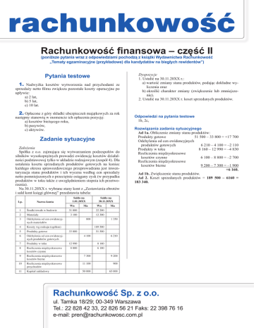 Rachunkowość finansowa – część II (poniższe pytania wraz z odpowiedziami pochodzą z książki Wydawnictwa Rachunkowość „Tematy egzaminacyjne (przykładowe) dla kandydatów na biegłych rewidentów”) Pytania testowe 1. Nadwyżka kosztów wytworzenia nad przychodami ze sprzedaży netto filmu zwiększa pozostałe koszty operacyjne po upływie: a) 2 lat, b) 5 lat, c) 10 lat. 2. Opłacone z góry składki ubezpieczeń majątkowych za rok następny stanowią w momencie ich opłacenia pozycję: a) kosztów bieżącego roku, b) pasywów, c) aktywów. Zadanie sytuacyjne Założenia Spółka z o.o. zajmująca się wytwarzaniem podzespołów do silników wysokoprężnych prowadzi ewidencję kosztów działalności podstawowej tylko w układzie rodzajowym (zespół 4). Dla ustalenia kosztu sprzedanych produktów gotowych na koniec każdego okresu sprawozdawczego przeprowadzana jest inwentaryzacja stanu produktów i ich wycena według cen sprzedaży netto pomniejszonych o przeciętnie osiągany zysk (w przypadku produktów w toku także z uwzględnieniem stopnia ich przetworzenia). Na 30.11.20XX r. wybrane stany kont z „Zestawienia obrotów i sald kont księgi głównej” przedstawia tabela: Lp. Nazwa konta 1 Środki trwałe w budowie 3 Odchylenia od cen ewidencyjnych materiałów 2 4 5 6 7 8 9 10 11 Materiały Koszty wg rodzaju (ogółem) Saldo na 1.01.20XX Wn 31 800 3 100 Produkty gotowe 33 800 Produkty w toku 12 990 Odchylenia od cen ewidencyjnych produktów gotowych Rozliczenia międzyokresowe kosztów czynne Rozliczenia międzyokresowe kosztów bierne Rozliczenia międzyokresowe przychodów Kapitał zakładowy Ma 800 Dyspozycje 1. Ustalić na 30.11.20XX r.: a) wartość zmiany stanu produktów, podając dokładne wyliczenia oraz b) określić charakter zmiany (zwiększenie lub zmniejszenie). 2. Ustalić na 30.11.20XX r. koszt sprzedanych produktów. Odpowiedzi na pytania testowe 1b, 2c, Rozwiązania zadania sytuacyjnego Ad 1a. Obliczenie zmiany stanu produktów: Produkty gotowe 51 500 – 33 800 = +17 700 Odchylenia od cen ewidencyjnych produktów gotowych 6 210 – 4 100 = –2 110 Produkty w toku 8 160 – 12 990 = –4 830 Rozliczenia międzyokresowe kosztów czynne 6 100 – 8 800 = –2 700 Rozliczenia międzyokresowe kosztów bierne 9 200 – 7 300 = –1 900 +6 160. Ad 1b. Zwiększenie stanu produktów. Ad 2. Koszt sprzedanych produktów = 189 500 – 6160 = 183 340. Saldo na 30.11.20XX Wn 22 200 12 300 Ma 1 350 189 500 4 100 51 500 6 210 8 160 8 800 6 100 7 300 9 200 11 100 900 50 000 65 000 Rachunkowość Sp. z o.o. ul. Tamka 18/29; 00-349 Warszawa Tel.: 22 828 42 33, 22 826 56 21 Faks: 22 398 76 16 e-mail: [email protected]