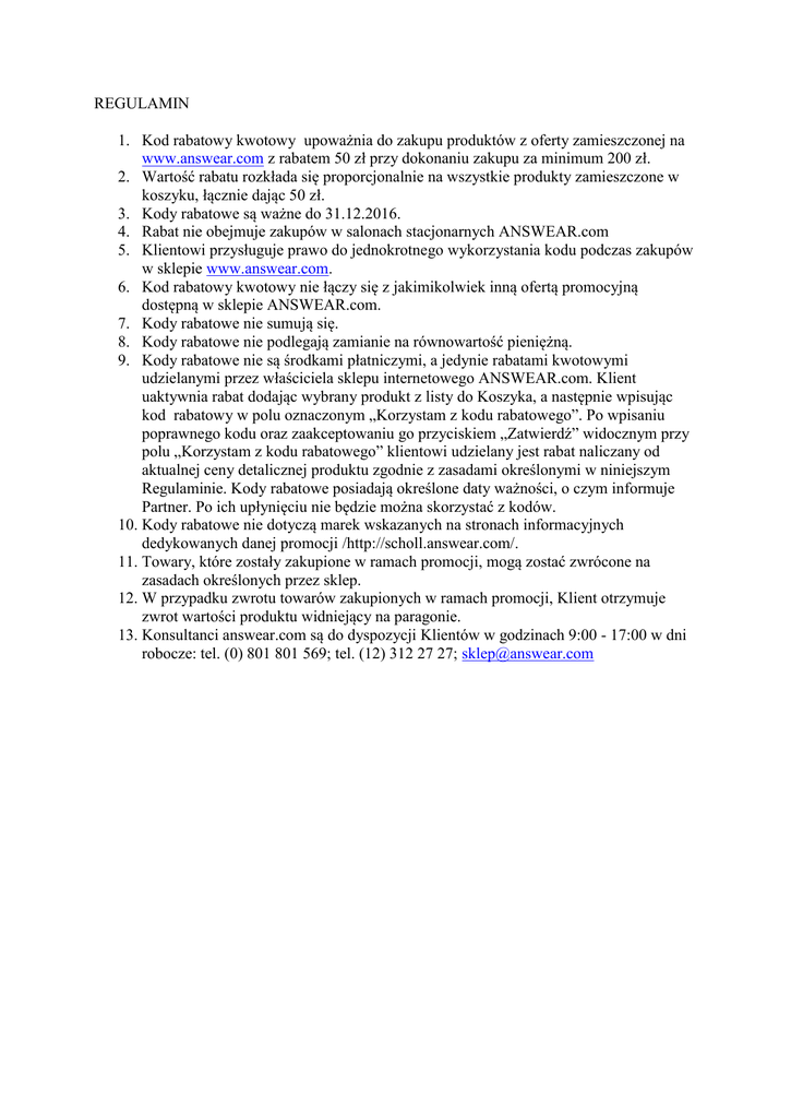 REGULAMIN 1. Kod rabatowy kwotowy upoważnia do zakupu produktów z oferty zamieszczonej na www.answear.com z rabatem 50 zł przy dokonaniu zakupu za minimum 200 zł. 2. Wartość rabatu rozkłada się proporcjonalnie na wszystkie produkty zamieszczone w koszyku, łącznie dając 50 zł. 3. Kody rabatowe są ważne do 31.12.2016. 4. Rabat nie obejmuje zakupów w salonach stacjonarnych ANSWEAR.com 5. Klientowi przysługuje prawo do jednokrotnego wykorzystania kodu podczas zakupów w sklepie www.answear.com. 6. Kod rabatowy kwotowy nie łączy się z jakimikolwiek inną ofertą promocyjną dostępną w sklepie ANSWEAR.com. 7. Kody rabatowe nie sumują się. 8. Kody rabatowe nie podlegają zamianie na równowartość pieniężną. 9. Kody rabatowe nie są środkami płatniczymi, a jedynie rabatami kwotowymi udzielanymi przez właściciela sklepu internetowego ANSWEAR.com. Klient uaktywnia rabat dodając wybrany produkt z listy do Koszyka, a następnie wpisując kod rabatowy w polu oznaczonym „Korzystam z kodu rabatowego”. Po wpisaniu poprawnego kodu oraz zaakceptowaniu go przyciskiem „Zatwierdź” widocznym przy polu „Korzystam z kodu rabatowego” klientowi udzielany jest rabat naliczany od aktualnej ceny detalicznej produktu zgodnie z zasadami określonymi w niniejszym Regulaminie. Kody rabatowe posiadają określone daty ważności, o czym informuje Partner. Po ich upłynięciu nie będzie można skorzystać z kodów. 10. Kody rabatowe nie dotyczą marek wskazanych na stronach informacyjnych dedykowanych danej promocji /http://scholl.answear.com/. 11. Towary, które zostały zakupione w ramach promocji, mogą zostać zwrócone na zasadach określonych przez sklep. 12. W przypadku zwrotu towarów zakupionych w ramach promocji, Klient otrzymuje zwrot wartości produktu widniejący na paragonie. 13. Konsultanci answear.com są do dyspozycji Klientów w godzinach 9:00 - 17:00 w dni robocze: tel. (0) 801 801 569; tel. (12) 312 27 27; [email protected]