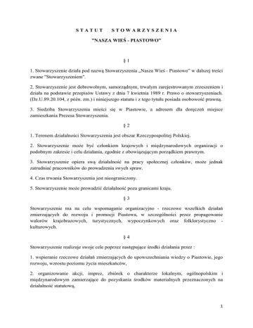 STATUT STOWARZYSZENIA ”NASZA WIEŚ - PIASTOWO” §1 1. Stowarzyszenie działa pod nazwą Stowarzyszenia „Nasza Wieś - Piastowo” w dalszej treści zwane "Stowarzyszeniem". 2. Stowarzyszenie jest dobrowolnym, samorządnym, trwałym zarejestrowanym zrzeszeniem i działa na podstawie przepisów Ustawy z dnia 7 kwietnia 1989 r. Prawo o stowarzyszeniach. (Dz.U.89.20.104, z późn. zm.) i niniejszego statutu i z tego tytułu posiada osobowość prawną. 3. Siedziba Stowarzyszenia mieści się w Piastowie, a adresem dla doręczeń miejsce zamieszkania Prezesa Stowarzyszenia. §2 1. Terenem działalności Stowarzyszenia jest obszar Rzeczypospolitej Polskiej. 2. Stowarzyszenie może być członkiem krajowych i międzynarodowych organizacji o podobnym zakresie i celu działania, zgodnie z obowiązującym porządkiem prawnym. 3. Stowarzyszenie opiera swą działalność na pracy społecznej członków, może jednak zatrudniać pracowników do prowadzenia swych spraw. 4. Czas trwania Stowarzyszenia jest nieograniczony. 5. Stowarzyszenie może prowadzić działalność poza granicami kraju. §3 Stowarzyszenie ma na celu wspomaganie organizacyjno - rzeczowe wszelkich działań zmierzających do rozwoju i promocji Piastowa, w szczególności przez propagowanie walorów krajobrazowych, turystycznych, wypoczynkowych oraz folklorystyczno kulturowych. §4 Stowarzyszenie realizuje swoje cele poprzez następujące środki działania przez : 1. wspieranie rzeczowe działań zmierzających do upowszechniania wiedzy o Piastowie, jego rozwoju, wzrostu poziomu życia mieszkańców, 2. organizowanie akcji, imprez, zbiórek o charakterze lokalnym, ogólnopolskim i międzynarodowym zamierzające do pozyskania środków materialnych przeznaczonych na działalność statutową, 1 3. prowadzenie działalności integrującą członków Stowarzyszenia poprzez aktywność kulturalną, rekreacyjną i towarzyską, 4. współpracę z organami administracji państwowej, innymi instytucjami oraz organizacjami społecznymi, fundacjami itp. w zakresie swojej działalności, 5. współpracę w zakresie swoich zadań z innymi organizacjami krajowymi i zagranicznymi, 6. prowadzenie działalności mającej na celu budowanie wspólnoty mieszkańców wsi i okolicy, 7. współpracę z wszelkimi dostępnymi mediami, 8. działanie mające na celu poprawę i rozwój infrastruktury technicznej na terenie wsi Piastowo, 9. współpracę z lokalnymi przedsiębiorcami i wspieranie ich rozwoju w zakresie w jakim zgodne jest to z celami stowarzyszenia, 10. prowadzenie działań promocyjnych sprzyjających rozwojowi celów statutowych organizacji. §5 Stowarzyszenie organizuje okresowe spotkania członków zainteresowanych omówieniem problematyki wiążącej się z realizacją zadań statutowych. §6 Dla realizacji celów statutowych, Stowarzyszenie może powoływać inne organizacje w granicach prawem dopuszczonych. §7 Członkowie Stowarzyszenia dzielą się na: 1. członków zwyczajnych, 2. członków wspierających. §8 Członkami zwyczajnymi Stowarzyszenia mogą być osoby pełnoletnie, obywatele polscy i cudzoziemcy mający stałe miejsce zamieszkania na terytorium Rzeczypospolitej Polskiej, którzy wspierają cele Stowarzyszenia oraz deklarują i dają rękojmię czynnego uczestnictwa w wysiłku zmierzającym do realizacji celów. §9 1. O przyjęciu danej osoby w poczet członków zwyczajnych Stowarzyszenia decyduje Zarząd Stowarzyszenia przez przyjęcie kandydatury zwykłą większością głosów w drodze uchwały. 2 2. Od odmowy przyjęcia w poczet członków zwyczajnych zainteresowanemu przysługuje odwołanie do Walnego Zebrania Stowarzyszenia, którego uchwała w tym przedmiocie jest ostateczna. § 10 1. Członkowie Stowarzyszenia posiadają: a. czynne i bierne prawo wyborcze do władz Stowarzyszenia, b. prawo uczestniczenia w spotkaniach, imprezach i innych działaniach wynikających z realizacji celów Stowarzyszenia, c. prawo wnioskowania we wszystkich sprawach dotyczących celów oraz funkcjonowania Stowarzyszenia. 2. Członkowie Stowarzyszenia są obowiązani: a. brać czynny udział w pracach Stowarzyszenia, b. przestrzegać postanowień Statutu oraz uchwał władz Stowarzyszenia, c. postępować zgodnie z zasadami koleżeństwa w stosunkach między członkami i nie naruszać solidarności organizacyjnej, d. swoją postawą i działaniami przyczyniać się do wzrostu roli i znaczenia Stowarzyszenia, e. dbać o dobre imię i wizerunek Stowarzyszenia, f. regularnie i bez wezwań opłacać składki. § 11 1. Utrata członkostwa następuje przez skreślenie lub wykluczenie członka zwyczajnego. 2. Skreślenie z listy członków zwyczajnych Stowarzyszenia dokonuje Zarząd Stowarzyszenia w następujących przypadkach: a. rezygnacji z członkostwa złożonej przez członka na piśmie, b. nieusprawiedliwionego zalegania z opłatami składek za okres przekraczający 2 miesiące od wyznaczonego terminu wpłaty i pomimo pisemnego upomnienia dalsze ich nieuregulowanie, c. śmierć członka. 3. Wykluczenia członka zwyczajnego Stowarzyszenia dokonuje Zarząd Stowarzyszenia w następujących przypadkach: a. prowadzenia działalności rażąco sprzecznej z niniejszym statutem, b. popełnienia czynu, który dyskwalifikuje daną osobę jako członka lub godzi w dobre imię Stowarzyszenia, 3 c. nie usprawiedliwionego nie brania udziału w pracach Stowarzyszenia. 4. Od uchwał Zarządu Stowarzyszenia w przedmiocie wykluczenia, członkowi przysługuje prawo odwołania się do Walnego Zgromadzenia Członków Stowarzyszenia na co najmniej 21 dni przed terminem Walnego Zgromadzenia Stowarzyszenia. Uchwała Walnego Zgromadzenia Stowarzyszenia jest ostateczna. § 12 1. Osoby prawne mogą zostać członkami wspierającymi poprzez złożenie oświadczenia woli Zarządowi Stowarzyszenia, który podejmuje w tej kwestii stosowną uchwałę. 2. Członek wspierający opłaca składkę członkowską w zadeklarowanej przez siebie wysokości. 3. Człon