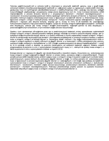 Telomery pełnią kluczową rolę w ochronie końców chromosomów utrzymując stabilność genomu, wraz z grupą białek ochronnych shelterin chronią je przed degradacją, fuzją końców i włączeniem systemów naprawczych, a także utratą informacji genetycznej. Komórki tracą fragment zakończeń telomerowych z każdą turą replikacji DNA i podziału. Gdy telomery osiągają krytyczną długość ustają podziały i przyspieszony zostaje proces degeneracyjny komórki. Coraz liczniejsze doniesienia wiążą nieprawidłowości w procesie skracania telomerów z przyspieszonym starzeniem i chorobami neurodegeneracyjnymi i nowotworami. Kluczowym pozostaje pytanie jak możemy zapobiegać nadmiernemu skracaniu się telomerów. Najnowsze badania dowodzą o możliwym wpływie wielonienasyconych kwasów tłuszczowych na stabilność telomerów. Wielonienasycone kwasy tłuszczowe omega-6 i omega-3 modulują procesy biologiczne i funkcje molekularne poprzez oddziaływanie z receptorami jądrowymi i regulację, jako aktywne biolipidy, ekspresji genów. Kwasy te mimo iż są niezbędne dla prawidłowego funkcjonowania organizmu maja przeciwstawne działanie. Uznaje się, że kwasy omega-6 mają działanie prozapalne i zwiększają stres oksydacyjny, podczas gdy kwasy omega-3 działają przeciwzapalnie, wpływają ujemnie na stres oksydacyjny i przeciwdziałają licznym schorzeniom, w tym chorobom układu sercowo-naczyniowego. Zgodne z tymi doniesieniami są wyłonione przez nas w preeliminacyjnych badaniach zmiany spowodowane suplementacją kwasami omega-6 i omega-3. Sekwencjonowanie następnej generacji wskazało na zmianę w poziomie ekspresji szeregu genów kodujących białka kluczowe dla biologii telomerów w tkance mięśniowej w wyniku suplementacji kwasami omega-6 i omega-3. Wyniki te zainspirowały nas do podjęcia tej tematyki i sformułowania przedstawionej w niniejszym projekcie hipotezy o wpływie kwasów omega-6 i omega-3 na biologię telomerów. Zamierzamy zbadać możliwie różny wpływ wielonienasyconych kwasów omega-3 i omega-6 zawartych w olejach roślinnych na długość telomerów w leukocytach i mięśniu szkieletowym oraz poziomu wybranych białek związanych z biologią telomerów. Wśród białek wyselekcjonowanych do dalszych badań znajdują się również te, które wykazały zmianę w ekspresji na poziomie transkryptomu we wstępnych badaniach własnych. Badania zostaną przeprowadzone na poziomie in-vivo z wykorzystaniem transgenicznych myszy fat-1, zdolnych do syntezy kwasu omega-3, a także na poziomie in-vitro z wykorzystaniem mioblastów mysich C2C12. Biologia telomerów i regulacja ich długości jest dziedziną poznaną w niewielkim stopniu. Zrozumienie czy wielonienasycone kwasy omega-6 i omega-3 wpływają na długość telomerów wniesie istotny, poznawczy wkład w omawianą tematykę. Projekt ponadto porusza dotąd niepodejmowany problem wpływu kwasów omega-6 i omega-3 na poziom wyłonionych na drodze badani preeliminacyjnych, wysoce istotnych dla zachowania długości telomerów białek. Co więcej poznanie roli wielonienasyconych kwasów tłuszczowych w procesie regulowania długości telomerów i oddziałujących z nimi białek daje podstawy do badań nad wykorzystaniem kwasów omega-6 i omega-3 w terapiach skierowanych przeciwko schorzeniom związanym z dysfunkcjami telomerowymi - nowotworami, chorobami układu sercowo-naczyniowego, przedwczesnym starzeniem, obniżeniem zdolności poznawczych i chorobami neurodegeneracyjnymi. Realizacja prezentowanego projektu pozwoli na uzyskanie kluczowych odpowiedzi dotyczących wpływu kwasów omega-6 i omega-3 na funkcjonowanie telomerów.
