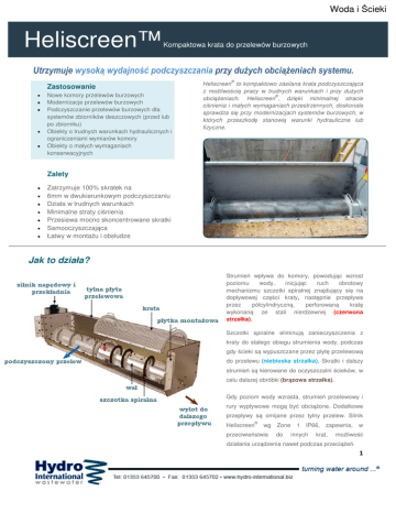 Woda i Ścieki Heliscreen™ Kompaktowa krata do przelewów burzowych Utrzymuje wysoką wydajność podczyszczania przy dużych obciążeniach systemu. ® Zastosowanie • • • • • Nowe komory przelewów burzowych Modernizacje przelewów burzowych Podczyszczanie przelewów burzowych dla systemów zbiorników deszczowych (przed lub po zbiorniku) Obiekty o trudnych warunkach hydraulicznych i ograniczeniami wymiarów komory Obiekty o małych wymaganiach konserwacyjnych Heliscreen to kompaktowo zasilana krata podczyszczająca z możliwością pracy w trudnych warunkach i przy dużych ® obciążeniach. Heliscreen , dzięki minimalnej stracie ciśnienia i małych wymaganiach przestrzennych, doskonale sprawdza się przy modernizacjach systemów burzowych, w których przeszkodę stanowią warunki hydrauliczne lub fizyczne. Zalety • • • • • • • Zatrzymuje 100% skratek na 6mm w dwukierunkowym podczyszczaniu Działa w trudnych warunkach Minimalne straty ciśnienia Przesiewa mocno skoncentrowane skratki Samooczyszczająca Łatwy w montażu i obsłudze Jak to działa? Strumień wpływa do komory, powodując wzrost poziomu wody, inicjując ruch obrotowy mechanizmu szczotki spiralnej znajdujący się na dopływowej części kraty, następnie przepływa przez półcylindryczną, perforowaną kratę wykonaną ze stali nierdzewnej (czerwona strzałka). Szczotki spiralne eliminują zanieczyszczenia z kraty do stałego obiegu strumienia wody, podczas gdy ścieki są wypuszczane przez płytę przelewową do przelewu (niebieska strzałka). Skratki i dalszy strumień są kierowane do oczyszczalni ścieków, w celu dalszej obróbki (brązowa strzałka). Gdy poziom wody wzrasta, strumień przelewowy i rury wypływowe mogą być obciążone. Dodatkowe przepływy są omijane przez tylny przelew. Silnik Heliscreen ® wg Zone 1 IP66, zapewnia, w przeciwieństwie do innych krat, możliwość działania urządzenia nawet podczas przeciążeń. 1 Woda i Ścieki Heliscreen™ Kompaktowa krata do przelewów burzowych Projekt ® Wszechstronne i dostosowane do warunków pracy urządzenie Heliscreen jest dostępne o standardowych średnicach 300mm, 500mm, 700mm oraz 1000mm. Konfiguracje ® Wszechstronność Heliscreen pozwala na instalację jednostki równolegle lub szeregowo, aby spełnić każde wymagania przepływu. Rozmiary Średnica 300mm DŁUGOŚĆ KRATY 1,5m 2,0m 2,5m 3,0m 3,5m OBSZAR PROJEKTU 550mm x 2500mm 550mm x 3000mm 550mm x 3500mm 550mm x 4000mm 550mm x 4500mm MAX PRZEPŁYW PRZELEWOWY 241 l/s 321 l/s 401 l/s 481 l/s 561 l/s DŁUGOŚĆ KRATY 1,5m 2,0m 2,5m 3,0m 3,5m OBSZAR PROJEKTU 750mm x 2500mm 750mm x 3000mm 750mm x 3500mm 750mm x 4000mm 750mm x 4500mm MAX PRZEPŁYW PRZELEWOWY 401 l/s 535 l/s 668 l/s 802 l/s 935 l/s DŁUGOŚĆ KRATY 1,5m 2,0m 2,5m 3,0m 3,5m OBSZAR PROJEKTU 950mm x 2500mm 950mm x 3000mm 950mm x 3500mm 950mm x 4000mm 950mm x 4500mm MAX PRZEPŁYW PRZELEWOWY 561 l/s 748 l/s 935 l/s 1122 l/s 1310 l/s Średnica 500mm Średnica 700mm Średnica 1000mm DŁUGOŚĆ KRATY 1,5m 2,0m 2,5m 3,0m 3,5m OBSZAR PROJEKTU 1250mm x 2500mm 1250mm x 3000mm 1250mm x 3500mm 1250mm x 4000mm 1250mm x 4500mm MAX PRZEPŁYW PRZELEWOWY 802 l/s 1069 l/s 1336 l/s 1604 l/s 1871 l/s Obsługa ® Elementy wewnętrzne Heliscreen są montowane po „mokrej” stronie przelewu. Dostęp do głównych elementów znajduje się od „suchej” strony, dzięki czemu można w łatwy sposób dokonać konserwacji lub kontroli. Przedstawicielstwa w Polsce PwP Sp. z o.o. ul. Płocka 17 lok. 11, 01-231 Warszawa tel.: +48 22 862 75 30 fax: +48 22 862 10 16 e-mail: [email protected] 2