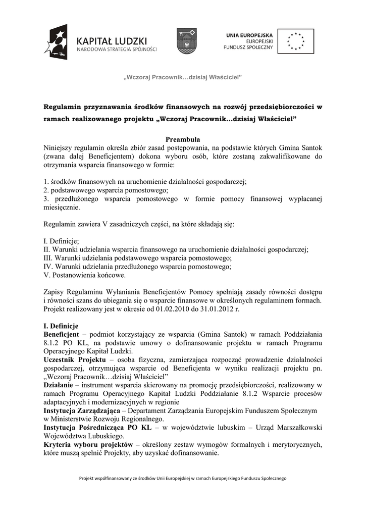 „Wczoraj Pracownik…dzisiaj Właściciel” Regulamin przyznawania środków finansowych na rozwój przedsiębiorczości w ramach realizowanego projektu „Wczoraj Pracownik…dzisiaj Właściciel” Preambuła Niniejszy regulamin określa zbiór zasad postępowania, na podstawie których Gmina Santok (zwana dalej Beneficjentem) dokona wyboru osób, które zostaną zakwalifikowane do otrzymania wsparcia finansowego w formie: 1. środków finansowych na uruchomienie działalności gospodarczej; 2. podstawowego wsparcia pomostowego; 3. przedłużonego wsparcia pomostowego w formie pomocy finansowej wypłacanej miesięcznie. Regulamin zawiera V zasadniczych części, na które składają się: I. Definicje; II. Warunki udzielania wsparcia finansowego na uruchomienie działalności gospodarczej; III. Warunki udzielania podstawowego wsparcia pomostowego; IV. Warunki udzielania przedłużonego wsparcia pomostowego; V. Postanowienia końcowe. Zapisy Regulaminu Wyłaniania Beneficjentów Pomocy spełniają zasady równości dostępu i równości szans do ubiegania się o wsparcie finansowe w określonych regulaminem formach. Projekt realizowany jest w okresie od 01.02.2010 do 31.01.2012 r. I. Definicje Beneficjent – podmiot korzystający ze wsparcia (Gmina Santok) w ramach Poddziałania 8.1.2 PO KL, na podstawie umowy o dofinansowanie projektu w ramach Programu Operacyjnego Kapitał Ludzki. Uczestnik Projektu – osoba fizyczna, zamierzająca rozpocząć prowadzenie działalności gospodarczej, otrzymująca wsparcie od Beneficjenta w wyniku realizacji projektu pn. „Wczoraj Pracownik…dzisiaj Właściciel” Działanie – instrument wsparcia skierowany na promocję przedsiębiorczości, realizowany w ramach Programu Operacyjnego Kapitał Ludzki Poddziałanie 8.1.2 Wsparcie procesów adaptacyjnych i modernizacyjnych w regionie Instytucja Zarządzająca – Departament Zarządzania Europejskim Funduszem Społecznym w Ministerstwie Rozwoju Regionalnego. Instytucja Pośrednicząca PO KL – w województwie lubuskim – Urząd Marszałkowski Województwa Lubuskiego. Kryteria wyboru projektów – określony zestaw wymogów formalnych i merytorycznych, które muszą spełnić Projekty, aby uzyskać dofinansowanie. Projekt współfinansowany ze środków Unii Europejskiej w ramach Europejskiego Funduszu Społecznego „Wczoraj Pracownik…dzisiaj Właściciel” Mikroprzedsiębiorca – Uczestnik Projektu Działania 8.1; poddziałania 8.1.2 PO KL który założył działalność gospodarczą w trakcie korzystania ze wsparcia szkoleniowo-doradczego w ramach poddziałania 8.1.2 PO KL który spełnia kryteria określone dla mikroprzedsiębiorcy, gdzie za mikroprzedsiębiorcę uznaje się osobę fizyczną, która: zatrudnia średnio rocznie mniej niż 10 pracowników (włączając przedsiębiorstwo jednoosobowe) i osiągnęła roczny obrót netto ze sprzedaży towarów, wyrobów i usług oraz operacji finansowych nie przekraczający równowartości w złotych 2 milionów euro, lub suma aktywów jej bilansu sporządzonego na koniec ostatniego roku obrotowego nie przekracza równowartości w złotych 2 milionów euro. Projekt – przedsięwzięcie realizowane w ramach poddziałania 8.1.2 PO KL będące przedmiotem umowy między Instytucją Pośredniczącą POKL. Wniosek – wniosek o dofinansowanie Projektu przygotowany przez Wnioskodawcę. Wydatki kwalifikowalne ogółem – ogół kosztów, które kwalifikują się do refundacji ze środków Funduszy Strukturalnych, poniesionych w trakcie realizacji Projektu oraz w trakcie wdrażania, zarządzania, monitorowania programów, w ramach których powyższy Projekt jest realizowany. Zasada de minimis – pomoc publiczna w ramach poddziałania 8.1.2 PO KL stanowi pomoc de mini mis i jest ona udzielana na podstawie § 31 ust. 1 pkt. 2 i 3 z zastrzeżeniami zawartymi w § 30 rozporządzenia Ministra Rozwoju Regionalnego z dnia 6 maja 2008 r. w sprawie udzielania pomocy publicznej w ramach Programu Operacyjnego Kapitał Ludzki oraz w oparciu o Rozporządzenie Komisji nr 1998/2006/WE z dnia 15 grudnia 2006 r. w sprawie stosowania art. 87 i 88 traktatu do pomocy de minimis (Dz. Urz. WE L379, z 28.12.2006r. Pomoc de minimis nie może zostać udzielona podmiotowi, który w bieżącym roku kalendarzowym oraz w dwóch poprzedzających go latach kalendarzowych otrzymał pomoc de minimis z różnych źródeł i w różnych formach , której wartość brutto łącznie z pomocą, o którą się ubiega, przekracza równowartość w złotych kwoty 200.000 euro, a w przypadku podmiotu prowadzącego działalność w sektorze transportu drogowego – równowartość w złotych kwoty 100.000 euro, obliczonych według średniego kursu NBP obowiązującego w dniu udzielania pomocy. Podstawowe wsparcie pomostowe - pomoc kapitałowa dla Mikroprzedsiębiorcy – Beneficjenta Pomocy projektu „Wczoraj Pracownik…dzisiaj Właściciel” w formie comiesięcznego wsparcia w wysokości 1.200 zł wypłacanych przez okres sześciu miesięcy liczonych od dnia rozpoczęcia działalności przez Mikroprzedsiębiorcę, zgodnie z obowiązującymi przepisami. Wsparcie pomostowe przedłużone – pomoc kapitałowa dla Mikroprzedsiębiorcy, Beneficjenta Pomocy projektu „Wczoraj Pracownik…dzisiaj Właściciel” w formie comiesięcznego wsparcia w wysokości 1.200 wypłacanych przez okres do sześciu miesięcy, liczonych od dnia następnego, do którego wypłacane było wsparcie pomostowe podstawowe, jednak nie dłużej niż do 12 miesięcy od dnia rozpoczęcia działalności gospodarczej. Warunkiem skorzystania z przedłużonego wsparcia pomostowego jest korzystanie ze wsparcia pomostowego podstawowego. Wsparcie finansowe na uruchomienie działalności - udzielenie mikroprzedsiębiorcy, Beneficjentowi Pomocy projektu pn. „Wczoraj Pracownik…dzisiaj Właściciel”, jednorazowego wsparcia kapitałowego ułatwiającego sfinansowanie wydatków związanych z Projekt współfinansowany ze 