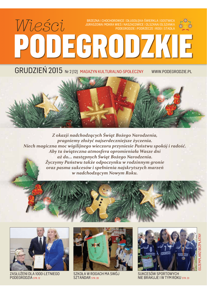 Wieści BRZEZNA | CHOCHOROWICE | DŁUGOŁĘKA-ŚWIERKLA | GOSTWICA JURASZOWA| MOKRA WIEŚ | NASZACOWICE | OLSZANA| OLSZANKA PODEGRODZIE | PODRZECZE | ROGI | STADŁA GRUDZIEŃ 2015 Nr 2 [12] MAGAZYN KULTURALNO-SPOŁECZNY WWW.PODEGRODZIE.PL EGZEMPLARZ BEZPŁATNY Z okazji nadchodzcych wit Bo#ego Narodzenia, pragniemy zo#y najserdeczniejsze #yczenia. Niech magiczna moc wigilijnego wieczoru przyniesie Pastwu spokój i rado. Aby ta witeczna atmosfera opromieniaa Wasze dni a# do... nastpnych wit Bo#ego Narodzenia. yczymy Pastwu tak#e odpoczynku w rodzinnym gronie oraz pasma sukcesów i spenienia najskrytszych marze w nadchodzcym Nowym Roku. ZASŁUŻENI DLA 1000-LETNIEGO PODEGRODZIA STR. 12 SZKOŁA W ROGACH MA SWÓJ SZTANDAR STR. 20 SUKCESÓW SPORTOWYCH NIE BRAKUJE I W TYM ROKU STR. 23 2 WWW.PODEGRODZIE.PL BRZEZNA | CHOCHOROWICE | DŁUGOŁĘKA-ŚWIERKLA | GOSTWICA | JURASZOWA | MOKRA WIEŚ | NASZACOWICE | OLSZANA „Świat nie jest niestety doskonały. Jest w nim tyle do poprawienia. Uczyńmy więc coś w tym kierunku już dziś – zacznijmy od siebie. Przyjdzie czas, kiedy zima zapyta nas, co robiliśmy latem.” Szanowni Mieszkańcy! Po dłuższej niż zwykle przerwie przedstawiam kolejne wydanie „Wieści Podegrodzkich” i zachęcam do ich lektury. „Wieści Podegrodzkie” jak zawsze są skarbnicą informacji na temat najważniejszych i najciekawszych wydarzeń na terenie naszej gminy. Kończący się 2015 rok nie wywołał, na szczęście, takich szerokich emocji jak poprzedni. Był rokiem normalnej, codziennej pracy, w którym udało się zrealizować wiele potrzebnych inwestycji ułatwiających nam codzienne życie, np.: budowa kanalizacji w Podegrodziu i Stadłach, modernizację oczyszczalni ścieków w Podrzeczu, wybudowanie kaplicy cmentarnej w Podrzeczu, budowa obwodnicy zachodniej, instalacja solarów dla kilkudziesięciu gospodarstw domowych, budowa wodociągu na Mokrej Wsi i wielu dróg w każdej miejscowości. W obecnym numerze „Wieści Podegrodzkich” chciałam zwrócić Państwa uwagę na dwa optymistyczne wydarzenia. Pierwsze to jubileusz złotych, szmaragdowych i diamentowych godów 27 par, mieszkańców naszej gminy. Szczególnie w okresie świąt Bożego Narodzenia to wydarzenie nabiera szczególnego znaczenia. Wzajemny szacunek, wsparcie, ponoszenie wspólnie trudów życia i wychowania przez wszystkich jubilatów jest godne podziwu i naśladowania. Serdecznie im tego gratuluję i życzę wszystkim, żeby mogli być uczestnikami takich chwil. Drugie wydarzenie to promocja monografii „Podegrodzie i Gmina Podegrodzka. Zarys dziejów” oraz Wieści PODEGRODZKIE MAGAZYN KULTURALNO-SPOŁECZNY Wieści PODEGRODZKIE wręczenie medali „Zasłużony dla Gminy Podegrodzie”. Z nieukrywaną przyjemnością uczestniczyłam w sobotnie popołudnie w promocji książki, która była podsumowaniem uroczystych obchodów 1000-lecia parafii podegrodzkiej. Duża frekwencja na spotkaniu, ciekawe prelekcje autorów monografii, żywa dyskusja na temat dziejów Podegrodzia i Gminy Podegrodzie pokazała, że publikacja była oczekiwana i potrzebna. W jednym miejscu została zebrana wiedza o dziejach gminy, jej zwyczajach i ludziach, którzy te zwyczaje tworzyli i przekazywali następnym pokoleniom. Niewielka część tych osób zapisała się w najnowszych dziejach Gminy Podegrodzia. Decyzją Kapituły Honorowej zostali odznaczeni medalem „Zasłużony dla Gminy Podegrodzia”. To szczególne wyróżnienie dla wszystkich osób, które wniosły istotny wkład w rozwój naszej gminy. Serdecznie im tego gratuluję. W związku z tym, że były to pierwsze tego typu wyróżnienia, obejmowały okres kilkunastu lat działalności, Kapituła przyznała tych medali aż 45. Zachęcam wszystkich do zapoznania się z procedurą przyznawania tych medali i zgłaszania społeczników zasłużonych dla naszej gminy. Szanowni mieszkańcy. Moje tradycyjne, coroczne życzenia nabierają wyjątkowego znaczenia. Najbliższa przyszłość zapowiada się dla jednych ciekawie, inni zapowiadają mroczne czasy. Bez względu na okoliczności bardzo Was proszę, żeby te wydarzenia nie podzieliły naszej społeczności. Dużo spokoju, uśmiechu, odpoczynku w rodzinnej atmosferze Świąt Bożego Narodzenia. Spokojnego 2016 roku, w którym realizacja marzeń i celów będzie dla nas najważniejsza. I jak nigdy dużo optymizmu i pogody ducha. Z serdecznymi pozdrowieniami, MAŁGORZATA GROMALA WÓJT GMINY PODEGRODZIE Wydawca: Urząd Gminy Podegrodzie, Podegrodzie 248, 33-386 Podegrodzie tel. (18) 445-90-66, 445-90-41, Skład i druk: IPRESS STUDIO WWW.IPRESS.PRO GRUDZIEŃ 2015 W NUMERZE WWW.PODEGRODZIE.PL OLSZANKA | PODEGRODZIE | PODRZECZE | ROGI | STADŁA 21 8 Młodzieżowa kapela z Podegrodzia nie przerywa pasma sukcesów Istnieje dopiero od pięciu lat, ale już na stałe w dość spontaniczny i żywiołowy sposób zagościła w życiu kulturalnym gminy. Kapela Młodzieżowa Muzyka „Podegrodzie” rozpoczęła działalność w 2010 r. w ramach Szkółki Muzykowania Ludowego, zorganizowanej przez Starostwo Powiatowe w Nowym Sączu, działającej przy Gminnym Ośrodku Kultury w Podegrodziu. WIADOMOŚCI Dla dobra mieszkańców i środowiska Wspólnie świętowali Złote, Szmaragdowe i Diamentowe Gody 4 5 Jolanta Mrówka zdobywa kolejne laury Ponad 70 uczestników pokonała uczennica II klasy Gimnazjum w Podegrodziu Jolanta Mrówka podczas I Krakowskiego Przeglądu Interpretacji Piosenki Aktorskiej „Wesołe Miasteczko 2015”, który 21-22 listopada miał miejsce w Krakowie. Młoda piosenkarka zachwyciła jurorów Grzegorza Jurasa, Danutę Pietraszewską i Mateusza Borkowskiego własnym wykonaniem piosenek „Czy ten pan i pani” oraz „Nie daj mi odejść”. Przywrócili do łask zapomniane katarzynki Magia i pierwszy wypas bydła w tradycji lachowskiej „Lachowskie Lato” w Podegrodziu Wakacyjna wycieczka do Podrzecza Modern Jazz Warsztaty bibułkarskie Wakacje z GOK-iem w Naszacowicach Wycieczka na Łazy Zas