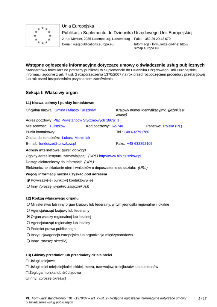 Unia Europejska Publikacja Suplementu do Dziennika Urzędowego Unii Europejskiej 2, rue Mercier, 2985 Luxembourg, Luksemburg Faks: +352 29 29 42 670 E-mail: [email protected] Informacje i formularze on-line: http:// simap.europa.eu Wstępne ogłoszenie informacyjne dotyczące umowy o świadczenie usług publicznych Standardowy formularz na potrzeby publikacji w Suplemencie do Dziennika Urzędowego Unii Europejskiej informacji zgodnie z art. 7 ust. 2 rozporządzenia 1370/2007 na rok przed rozpoczęciem procedury przetargowej lub rok przed bezpośrednim przyznaniem zamówienia. Sekcja I: Właściwy organ I.1) Nazwa, adresy i punkty kontaktowe: Oficjalna nazwa: Gmina i Miasto Tuliszków Krajowy numer identyfikacyjny: (jeżeli jest znany) _____ Adres pocztowy: Plac Powstańców Styczniowych 1863r. 1 Miejscowość: Tuliszków Kod pocztowy: 62-740 Punkt kontaktowy: _____ Państwo: Polska (PL) Tel.: +48 632791780 Osoba do kontaktów: Łukasz Marciniak E-mail: [email protected] Faks: +48 632892105 Adresy internetowe: (jeżeli dotyczy) Ogólny adres instytucji zamawiającej: (URL) http://www.bip.tuliszkow.pl Dostęp elektroniczny do informacji: (URL) _____ Elektroniczne składanie ofert i wniosków o dopuszczenie do udziału: (URL) _____ Więcej informacji można uzyskać pod adresem Powyższy(-e) punkt(-y) kontaktowy(-e) Inny (proszę wypełnić załącznik A.I) I.2) Rodzaj właściwego organu Ministerstwo lub inny organ krajowy lub federalny, w tym jednostki regionalne i lokalne Agencja/urząd krajowy lub federalny Organ władzy regionalnej lub lokalnej Agencja/urząd regionalny lub lokalny Podmiot prawa publicznego Instytucja/agencja europejska lub organizacja międzynarodowa Inna: (proszę określić) I.3) Główny przedmiot lub przedmioty działalności Usługi kolejowe Usługi kolei miejskiej/kolei lekkiej, metra, tramwajów, trolejbusów lub autobusów Żegluga morska lub śródlądowa Inny: (proszę określić) PL Formularz standardowy T01 - 1370/07 – art. 7 ust. 2 - Wstępne ogłoszenie informacyjne dotyczące umowy o świadczenie usług publicznych 1 / 12 Ogólne usługi publiczne I.4) Udzielenie zamówienia w imieniu innych właściwych organów Właściwy organ dokonuje zakupu w imieniu innych właściwych organów: tak nie (jeżeli tak, więcej informacji o tych właściwych organach można podać w załączniku A.II) PL Formularz standardowy T01 - 1370/07 – art. 7 ust. 2 - Wstępne ogłoszenie informacyjne dotyczące umowy o świadczenie usług publicznych 2 / 12 Sekcja II: Przedmiot zamówienia II.1) Opis: II.1.1) Nazwa nadana zamówieniu: Świadczenie usług w zakresie publicznego transportu zbiorowego II.1.2) Rodzaj zamówienia, dziedzina(-y), której(-ych) dotyczą usługi transportu publicznego: Kategoria usług: nr: T-05 (Zob. kategorie usług w załączniku B) Dziedziny, których dotyczą usługi transportu publicznego: Transport osobowy Kod NUTS: PL414 II.1.3) Krótki opis zamówienia: Dokonanie wyboru operatora na podstawie ustawy z dnia 29 stycznia 2004 r. – Prawo zamówień publicznych (t.j. Dz. U. z 2013 r. poz. 907 ze zm.) w związku z art 19 ust 1 pkt 1 ustawy z dnia 16 grudnia 2010 r. o publicznym transporcie zbiorowym (Dz.U. z 2011r., Nr 5, poz. 13 z późn zm) a) określenie rodzaju transportu: transport drogowy, przewozy autobusowe b) określenie sieci komunikacyjnej: przewozy autobusowe w publicznym transporcie zbiorowym na sieci komunikacyjnej obejmującej obszar gminy Tuliszków, dla której Gmina jest organizatorem publicznego transportu zbiorowego. II.1.4) Wspólny Słownik Zamówień (CPV) Główny przedmiot Dodatkowe przedmioty Słownik główny 60100000 60112000 Słownik uzupełniający (jeżeli dotyczy) II.1.5) Informacje na temat podwykonawstwa Przewidywane jest zlecenie podwykonawstwa: tak nie (jeżeli tak) Wartość lub część zamówienia, które prawdopodobnie będzie zlecone stronom trzecim: minimalny procent: _____ (%), maksymalny procent: _____ (%) wartości zamówienia albo Nieznana Krótki opis wartości/części zamówienia, które będzie zlecone podwykonawcom: _____ II.2) Ilość i/lub wartość usług Opis: _____ km usług publicznych w zakresie transportu pasażerskiego: _____ Szacunkowy koszt bez VAT: (proszę podać wyłącznie dane liczbowe) _____ albo Zakres: między _____ i _____ Waluta: Waluta: II.3) Planowana data rozpoczęcia i czas trwania zamówienia lub termin realizacji Rozpoczęcie: 01/01/2017 (dd/mm/rrrr) Okres w miesiącach: 12 albo w dniach: _____ (od udzielenia zamówienia) PL Formularz standardowy T01 - 1370/07 – art. 7 ust. 2 - Wstępne ogłoszenie informacyjne dotyczące umowy o świadczenie usług publicznych 3 / 12 Sekcja III: Informacje o charakterze prawnym, ekonomicznym, finansowym i technicznym III.1) Warunki dotyczące zamówienia: III.1.1) Parametry kosztów w celu obliczenia rekompensaty: _____ III.1.2) Informacje o wyłącznych prawach: Przyznano wyłączne prawa tak nie (jeżeli tak) Wyszczególnienie przyznanych wyłącznych praw: _____ III.1.3) Podział przychodów ze sprzedaży biletów: Odsetek przydzielony podmiotowi świadczącemu usługi publiczne: _____ (%) (uznaje się, że pozostała część jest przyznawana właściwemu organowi) III.1.4) Standardy socjalne: (przejęcie personelu zgodnie z dyrektywą 2001/23/WE) Wykaz wymaganych standardów (w tym lista pracowników, których to dotyczy, szczegółowe informacje na temat umownych praw i zobowiązań pracowników oraz warunków, na jakich pracowników uznaje się za związanych ze świadczonymi usługami): _____ III.1.5) Zobowiązania do świadczenia usług publicznych: Wyszczególnienie: _____ III.1.6) Inne szczególne warunki: Wykonanie zamówienia podlega szczególnym warunkom (jeżeli tak) Opis szczególnych warunków: _____ tak nie III.2) Warunki udziału: III.2.1) Zdolność ekonomiczna i finansowa: Informacje i formalności konieczne do dokonania oceny Minimalny poziom ewentualnie wymaganych spełniania wymogów: standardów: _____ __
