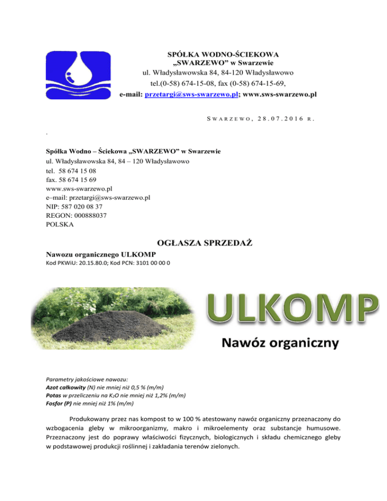 SPÓŁKA WODNO-ŚCIEKOWA „SWARZEWO” w Swarzewie ul. Władysławowska 84, 84-120 Władysławowo tel.(0-58) 674-15-08, fax (0-58) 674-15-69, e-mail: [email protected]; www.sws-swarzewo.pl SWARZEWO, 28.07.2016 R. . Spółka Wodno – Ściekowa „SWARZEWO” w Swarzewie ul. Władysławowska 84, 84 – 120 Władysławowo tel. 58 674 15 08 fax. 58 674 15 69 www.sws-swarzewo.pl e–mail: [email protected] NIP: 587 020 08 37 REGON: 000888037 POLSKA OGŁASZA SPRZEDAŻ Nawozu organicznego ULKOMP Kod PKWiU: 20.15.80.0; Kod PCN: 3101 00 00 0 Parametry jakościowe nawozu: Azot całkowity (N) nie mniej niż 0,5 % (m/m) Potas w przeliczeniu na K2O nie mniej niż 1,2% (m/m) Fosfor (P) nie mniej niż 1% (m/m) Produkowany przez nas kompost to w 100 % atestowany nawóz organiczny przeznaczony do wzbogacenia gleby w mikroorganizmy, makro i mikroelementy oraz substancje humusowe. Przeznaczony jest do poprawy właściwości fizycznych, biologicznych i składu chemicznego gleby w podstawowej produkcji roślinnej i zakładania terenów zielonych. Kompost został wyprodukowany z osadu z oczyszczalni ścieków, słomy i odpadów zielonych pozyskanych z segregacji od mieszkańców. Całkowicie bezpieczny dla środowiska naturalnego. Idealny do : ❖ nawożenia pól i upraw (wg instrukcji stosowania) ❖ ❖ ❖ ❖ ❖ ❖ kształtowania i pielęgnacji terenów zieleni miejskiej, trawników, boisk itp. uprawy roślin ozdobnych szkółkarstwa gospodarki komunalnej rekultywacji terenów zdegradowanych i wysypisk śmieci prac wykończeniowych inwestycji i tworzenia małej architektury Pozwolenie na wprowadzenie do obrotu : Decyzja nr 171/06 z dnia 30-09-2006 r. wydana przez Ministra Rolnictwa i Rozwoju Wsi. Szacunkowa ilość do sprzedaży w okresie 3 lat – 6 tysięcy ton Okres realizacji zamówienia – sukcesywny odbiór przez okres 3 lat od daty zawarcia umowy Załadunek, transport organizuje Kupujący na swój koszt Odbiór kompostu będzie możliwy w dni robocze w godz. od 8.00 – 14.00 Sprzedający zastrzega możliwość odstąpienia od sprzedaży w wysokości 30 % z przyczyn niezależnych od Sprzedającego Termin płatności – do 14 dni od daty wystawienia faktury VAT przez Sprzedającego Odbiór sukcesywny po wezwaniu telefonicznym przez Sprzedającego w terminie nie dłuższym niż 72 godz. Sprzedający nie przystąpi do podpisania umowy w przypadku, gdy oferowane ceny będą poniżej kosztów opłacalności sprzedaży. 1. Termin i miejsce i składania ofert Ofertę cenową należy złożyć do dnia 05.08.2016 r. do godz. 10.00 w formie papierowej lub elektronicznej na adres Spółka Wodno-Ściekowa "SWARZEWO", w Swarzewie Władysławowska 84, 84-120 Władysławowo, tel 58-674-15-08, fax 58 674-15-69, [email protected]. Informuję, że zaproponowane ceny będą porównane z innymi ofertami. Firma, która przedstawi najkorzystniejszą ofertę otrzyma zlecenie na przedmiot zamówienia. Od decyzji zamawiającego nie przysługują środki odwoławcze. Kryteria oceny ofert i ich znaczenie: 1.Kryterium oceny: 1) Przy wyborze oferty Sprzedajacy kierować się będzie następującymi kryteriami: a) cena - 100% 2) Punktacja: a) kryterium będzie oceniane w skali 100 punktowej, tj. od „0” do „100” b) punkty za zaoferowaną cenę netto (X) zostaną wyliczone wg wzoru: (oceniana będzie cena brutto) X = 𝑐𝑒𝑛𝑎 𝑛𝑎𝑗𝑛𝑖ż𝑠𝑧𝑎 𝑤 𝑧ł 𝑐𝑒𝑛𝑎 𝑏𝑎𝑑𝑎𝑛𝑒𝑗 𝑜𝑓𝑒𝑟𝑡𝑦 𝑤 𝑧ł x 100 = ilość uzyskanych punktów Zamówienie zostanie udzielone Kupującemu, który uzyska największą liczbę punktów. Do porozumiewania się z Kupującymi upoważnione są następujące osoby: W zakresie przedmiotu sprzedaży: Gł. spec. ds. przetargów – Mieczysław Antochowski [email protected], tel. 887747171 W zakresie procedury sprzedaży: Gł. spec. ds. przetargów – Mieczysław Antochowski tel. (0-58) 674-15-08 wew. 206 lub 887747171 e-mail: [email protected] w godz. urzędowania w dni robocze: od 07.00 – 14.30 Załączniki: 1. Formularz cenowy 2. Pozwolenie na wprowadzenie do obrotu : Decyzja nr 171/06 z dnia 30-09-2006 r. wydana przez Ministra Rolnictwa i Rozwoju Wsi. Załącznik nr. 1 FORMULARZ CENOWY ………………………. Pieczęć Kupującego Nazwa Kupującego…………………………………………………………………………………… Adres: ………………………………………………………………………………………………… Telefon: ……………………… ……………Faks:……………………………………… NIP: ………………………………………. Regon:……………………………………… Osoba upoważniona do kontaktu w sprawie przedmiotu kupna - sprzedaży: …………………………………………………………………………………………… Oferujemy: sukcesywne kupno nawozu organicznego ULKOMP W ilości szacunkowej 6 tyś. ton w okresie 3 lat za łączną kwotę: …………………… zł. za 1 tonę Cena brutto:…………………………………. zł. za 1 tonę Słownie:………………………………………. zł. Podatek VAT: ……… % ……………………. zł. za 1 tonę Słownie:………………………………………………………………. zł. za 1 tonę Cena netto:…………………………………. zł. za 1 tonę Słownie:………………………………………. zł. za 1 tonę 1. Oświadczamy, że oferta zawiera wszelkie koszty związane z należytym kupnem przedmiotu sprzedaży 3. Oświadczamy, że uważamy się za związanych niniejsza ofertą przez okres 30 dni od daty ostatecznego terminu składania ofert. ………………………………………………………… (pieczątka i podpis osoby uprawnionej do reprezentacji Kupującego)
