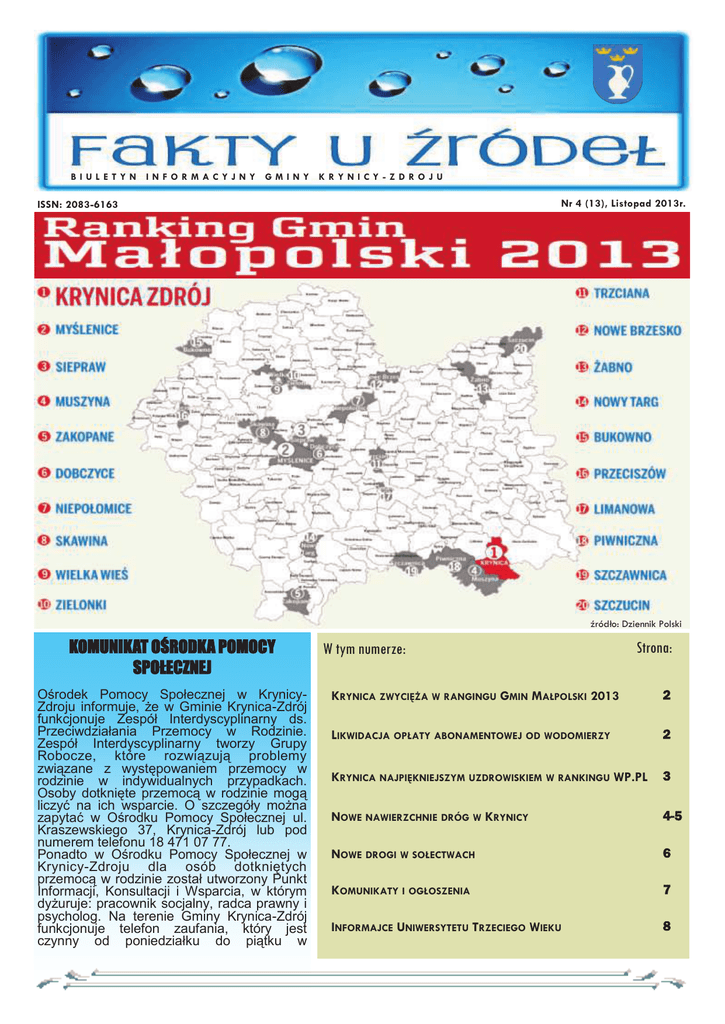 BIULETYN INFORMACYJNY GMINY KRYNICY -ZDROJU Nr 4 (13), Listopad 2013r. ISSN: 2083-6163 źródło: Dziennik Polski KOMUNIKAT OŚRODKA POMOCY SPOŁECZNEJ Ośrodek Pomocy Społecznej w KrynicyZdroju informuje, że w Gminie Krynica-Zdrój funkcjonuje Zespół Interdyscyplinarny ds. Przeciwdziałania Przemocy w Rodzinie. Zespół Interdyscyplinarny tworzy Grupy Robocze, które rozwiązują problemy związane z występowaniem przemocy w rodzinie w indywidualnych przypadkach. Osoby dotknięte przemocą w rodzinie mogą liczyć na ich wsparcie. O szczegóły można zapytać w Ośrodku Pomocy Społecznej ul. Kraszewskiego 37, Krynica-Zdrój lub pod numerem telefonu 18 471 07 77. Ponadto w Ośrodku Pomocy Społecznej w Krynicy-Zdroju dla osób dotkniętych przemocą w rodzinie został utworzony Punkt Informacji, Konsultacji i Wsparcia, w którym dyżuruje: pracownik socjalny, radca prawny i psycholog. Na terenie Gminy Krynica-Zdrój funkcjonuje telefon zaufania, który jest czynny od poniedziałku do piątku w W tym numerze: Strona: KRYNICA ZWYCIĘŻA W RANGINGU GMIN MAŁPOLSKI 2013 2 LIKWIDACJA OPŁATY ABONAMENTOWEJ OD WODOMIERZY 2 KRYNICA NAJPIĘKNIEJSZYM UZDROWISKIEM W RANKINGU WP.PL 3 NOWE NAWIERZCHNIE DRÓG W KRYNICY 4-5 NOWE DROGI W SOŁECTWACH 6 KOMUNIKATY I OGŁOSZENIA 7 INFORMAJCE UNIWERSYTETU TRZECIEGO WIEKU 8 2 Odwiedź nas na: www.krynica-zdroj.pl / Ranking Gmin Małopolski 2013 - Krynica niezmiennie najlepsza w regionie N iezależna i bezstronna instytucja, jaką jest Małopolski Instytut Samorządu Terytorialnego i Administracji po raz trzeci z rzędu umieściła Krynicę na najwyższym miejscu w Rankingu Gmin Małopolski. Celem tego przedsięwzięcia jest ocena potencjału, aktywności oraz wyników osiąganych przez gminy położone na obszarze całego województwa w sferze społecznej i go- spodarczej. Twórcy rankingu stawiają sobie również za cel promocję regionu oraz poszczególnych miejscowości jako obszarów atrakcyjnych dla mieszkańców i inwestorów. Tym bardziej cieszy fakt, że odkąd odpowiedzialność za rozwój naszej Gminy przejął burmistrz Dariusz Reśko, Krynica nigdy nie spadła z pierwszego miejsca. Zdaniem organizatorów plebiscytu, dzieje się tak dlatego, że Krynica-Zdrój „znakomicie opanowała trudną sztukę prowadzenia zrównoważonego rozwoju, stając się niekwestionowanym liderem w Małopolsce”. W oficjalnym komentarzu do tegorocznej edycji czytamy ponadto, że: „Dynamiczny rozwój lidera Rankingu, Krynicy-Zdroju jest determinowany przede wszystkim przez czynniki gospodarcze, tj.: wysokie dochody własne, wydatki inwestycyjne ogółem oraz wydatki inwestycyjne na gospodarkę komunalną i ochronę środowiska, a także wysoki poziom przedsiębiorczości mierzony liczbą firm przypadających na 1 tys. mieszkańców. Potencjał gospodarczy Krynicy determinuje również wysoko rozwinięta turystyka”. Zdecydowanie przodujemy w klasyfikacji ilości udzielonych noclegów w przeliczeniu na 1 tys. mieszkańców. Burmistrz nie zamierza jednak zadawalać się tymi znakomitymi wynikami i z poparciem Rady Miejskiej konsekwentnie podejmuje działania o charakterze strategicznym dla przyszłości Gminy. Umożliwią one dalszą poprawę wskaźników. Mowa tu m. in. o opracowaniu koncepcji rewitalizacji pozostałej części krynickiego Deptaku, o rozpoczęciu procedury związanej z budową kompleksu rekreacji wodnej (krynickiego Aquaparku), o będącej w fazie realizacji inwestycji polegającej na budowie wielokilometrowych szlaków turystycznych oraz o wdrażanym projekcie stworzenia wielkiego skansenu łemkowskiego na południowozachodnim zboczu Góry Parkowej. (RED) Burmistrz Dariusz Reśko wraz z radnymi likwidują opłatę abonamentową od wodomierzy Z przyjemnością informujemy, że z dniem 1 listopada 2013 r. przestała obowiązywać opłata abonamentowa, doliczana przez Zakład Wodociągów i Kanali- zacji do rachunków za wodę. Ustanowiona z inicjatywy poprzedniego kierownictwa opłata pobierana była dodatkowo od każdego wodomierza, niezależnie od zużycia wody. Takie rozwiązanie od samego początku budziło niezadowolenie mieszkańców, powodując wzrost kosztów utrzymania gospodarstw domowych nawet o kilkadziesiąt złotych rocznie. Dostrzegając te uciążliwości, burmistrz Dariusz Reśko zdecydował się na zniesienie abonamentu. Inicjatywę poparli radni Rady Miejskiej, podejmując stosowną uchwałę na sesji w dniu 3 października br. (RED) Odwiedź nas na: www.krynica-zdroj.pl 3 / Krynica Krynica--Zdrój najpiękniejszym uzdrowiskiem w Polsce w rankingu WP.PL M iło nam poinformować, że Krynica-Zdrój zwyciężyła w internetowym konkursie czytelników „Wirtualnej Polski” na najpiękniejsze uzdrowisko w kraju. W rywalizacji brały udział m.in. takie polskie kurorty jak Ciechocinek (7 miejsce), Duszniki-Zdrój (6 miejsce), Kołobrzeg (5 miejsce), Sopot (4 miejsce), Szczawnica (3 miejsce) oraz Nałęczów (2 miejsce). Wyniki głosowania nie pozostawiają wątpliwości co do tego, że odwiedzający Krynicę goście dostrzegają poprawę wizerunku uzdrowiska, jaka nastąpiła w ciągu ostatnich kilku lat. Na tę pozytywną zmianę wpływ mają niewątpliwie liczne inwestycje przeprowadzone przez Gminę. Wśród nich należy wskazać przede wszystkim rewitalizację krynickiego Deptaku. Ta część Krynicy pięknieje także dzięki renowacji Nowego Domu Zdrojowego, Starego Domu Zdrojowego oraz Pijalni Głównej. Wymienione przedsięwzięcia prowadzi obecnie na szeroką skalę Uzdrowisko Krynica-Żegiestów S.A. Dostrzegane są także działania inwestorów prywatnych oraz mieszkańców Krynicy. W ostatnim czasie odnowiono wiele kamienic i elewacji budynków. Nie ulega wątpliwości, że także te inicjatywy budują pozytywny obraz uzdrowiska, potwierdzony zwycięstwem w konkursie. (RED) 4 Remont ulicy Jaworowej W dniach od 28 maja do 1 października bieżącego roku na zlecenie Gminy przeprowadzony został kapitalny remont ulicy