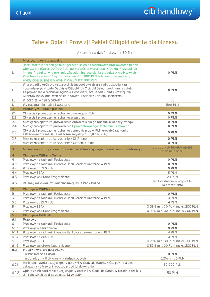Tabela Opłat i Prowizji Pakiet Citigold oferta dla biznesu Aktualna na dzień 1 stycznia 2015 r. 1 2.6 2.7 Miesięczna opłata za pakiet Jeżeli wartość średniego miesięcznego salda na rachunkach oraz lokatach będzie większa lub równa 100 000 PLN lub wartość przyznanego Kredytu, Pożyczki lub innego Produktu w rozumieniu „Regulaminu udzielania produktów kredytowych Klientom Firmowym” wynosi minimum 100 000 PLN, lub limit głównej Karty Kredytowej Business wynosi minimum 100 000 PLN W przypadku osób prowadzących jednoosobową działalność gospodarczą i posiadających Konto Osobiste Citigold lub Citigold Select zwolnione z opłaty za prowadzenie rachunku zgodnie z obowiązującą Tabelą Opłat i Prowizji dla Klientów indywidualnych po ustanowieniu relacji z Kontem Osobistym W pozostałych przypadkach Wymagana minimalna kwota sald Produkty w ramach pakietu Otwarcie i prowadzenie rachunku głównego w PLN Otwarcie i prowadzenie rachunku w walutach Miesięczna opłata za prowadzenie Automatycznego Rachunku Depozytowego Miesięczna opłata za prowadzenie Oprocentowanego Rachunku Firmowego Otwarcie i prowadzenie rachunku pomocniczego w PLN (również rachunku zakładowego funduszu świadczeń socjalnych – tylko w PLN) Miesięczna opłata za korzystanie z CitiPhone Miesięczna opłata za korzystanie z Citibank Online 3 Minimalna kwota przewalutowania z możliwością negocjowania kursu walutowego 4 4.1 4.2 4.3 4.4 4.5 Obsługa w Citibank Online Przelewy na rachunki Posiadacza Przelewy na rachunki klientów Banku oraz zewnętrzne w PLN Przelewy do ZUS i US Przelewy SEPA Przelewy walutowe i zagraniczne 4.6 Dzienny maksymalny limit transakcji w Citibank Online 5 5.1 5.2 5.3 5.4 5.5 6 6.1 6.1.1 6.1.2 6.1.3 6.1.4 6.1.5 6.1.6 6.2 Obsługa w CitiPhone Przelewy na rachunki Posiadacza Przelewy na rachunki klientów Banku oraz zewnętrzne w PLN Przelewy do ZUS i US Przelewy SEPA Przelewy walutowe i zagraniczne Obsługa w Oddziale Przelewy Przelewy na rachunki Posiadacza Przelewy w bankomacie Przelewy na rachunki klientów Banku oraz zewnętrzne w PLN Przelewy do ZUS i US Przelewy SEPA Przelewy walutowe i zagraniczne Wpłaty i wypłaty gotówkowe – w bankomacie Banku – u doradcy – w PLN oraz w walutach obcych Minimalna kwota dużej wypłaty gotówki w Oddziale Banku, która powinna być zgłaszana na trzy dni robocze przed jej dokonaniem Opłata za nieodebranie dużej wypłaty gotówki w Oddziale Banku w terminie sześciu dni roboczych od dnia zgłoszenia wypłaty 1.1 1.2 1.3 1.4 2 2.1 2.2 2.3 2.4 2.5 6.2.1 6.2.2 0 PLN 0 PLN 60 500 PLN 0 PLN 0 PLN 0 PLN 0 PLN 0 PLN 0 PLN 0 PLN 30 000 PLN lub ekwiwalent w walucie obcej 0 PLN 0 PLN 0 PLN 5 PLN 20 PLN limit uzależniony od profilu Reprezentanta 0 PLN 4 PLN 4 PLN 0,25% min. 30 PLN, maks. 200 PLN 0,25% min. 30 PLN, maks. 200 PLN 0 PLN 0 PLN 4 PLN 4 PLN 0,25% min. 30 PLN, maks. 200 PLN 0,25% min. 30 PLN, maks. 200 PLN 0 PLN 0,2% min. 3 PLN 50 000 PLN 50 PLN 7 7.1 7.2 7.3 8 8.1 8.2 9 10 10.1 10.2 10.3 10.4 10.5 10.6 10.7 10.8 10.9 10.10 10.11 10.12 10.13 11 11.1 11.2 12 12.1 12.2 13 13.1 13.2 13.3 13.4 13.5 13.6 13.7 Pozostałe przelewy Przelewy realizowane za pośrednictwem systemu SORBNET (nie dotyczy przelewów do ZUS i US) 30 PLN pierwszy przelew 0 PLN każdy następny 10 PLN (w danym miesiącu) Posiadacz rachunku zobowiązany jest pokryć, o ile wystąpią, dodatkowe opłaty i prowizje naliczane przez banki korespondentów lub przez instytucje rozliczające transakcje, inne niż Bank Handlowy w Warszawie S.A. Opłaty i prowizje obciążają rachunek, z którego wykonano przelew. Zlecenia stałe Utworzenie/zmiana zlecenia stałego 0 PLN – w Citibank Online – u doradcy w Oddziale i w CitiPhone 4 PLN 0 PLN Realizacja zlecenia stałego Polecenie zapłaty: utworzenie, zmiana i realizacja 0 PLN Karta debetowa/identyfikacyjna 0 PLN Wypłata ze wszystkich bankomatów w kraju 0 PLN Wypłata z bankomatów Citi za granicą 0 PLN Wypłata z bankomatów innych niż Citi za granicą Wpłata w bankomatach Euronet 0,5% min. 1 PLN 0 PLN Prowizja od transakcji Płać kartą i wypłacaj w kraju Dzienny maksymalny limit wypłat w ramach transakcji Płać kartą i wypłacaj (limit ustalony w ramach dziennego maksymalnego limitu wypłat w bankomacie, 1000 PLN lub 5 transakcji pomniejsza ww. limit) Maksymalna jednorazowa kwota wypłaty w ramach transakcji Płać kartą i wypłacaj 300 PLN Dzienny maksymalny limit wypłat w bankomacie 10 000 PLN Limit kwotowy dla jednorazowej Transakcji zbliżeniowej przeprowadzonej na terenie Polski bez konieczności użycia PIN lub podpisu Klienta, ustalany przez organizacje 50 PLN płatnicze Dzienny limit wpłat gotówkowych w bankomacie Banku dokonanych pojedynczą 30 000 PLN kartą debetową Opłata miesięczna za kartę debetową 6 PLN 0 PLN Opłata miesięczna za kartę identyfikacyjną Opłata za zmianę rachunku podpiętego do rozliczeń transakcji dokonywanych kartą 0 PLN debetową Usługa CitiAlerts (powiadomienia sms/mail) Pakiet Standard (opłata miesięczna za jednego użytkownika usługi) 6 PLN Pakiet Premium (opłata miesięczna za jednego użytkownika usługi) 10 PLN Lokaty Wysokość wypłaconych odsetek w przypadku zerwania lokaty przed terminem jej 0% zapadalności 50 000 PLN lub ekwiwalent Minimalna kwota lokaty o negocjowanym oprocentowaniu w walucie obcej Pozostałe prowizje i opłaty 0 PLN Miesięczna opłata za wyciągi z rachunku w formie elektronicznej (dowolny cykl) Opłata za wyciąg z rachunku w formie papierowej – dotyczy wyciągów w cyklu 100 PLN tygodniowym lub dziennym Opłata za wyciąg z rachunku w formie papierowej – dotyczy wyciągów w cyklu 10 PLN miesięcznym Opłata za powtórny/historyczny wyciąg z rachunku 20 PLN Opłata za wydruk historii rachunku do 12 miesięcy wstecz 20 PLN Wystawienie zaświadczenia o posiadanym lub zamkniętym produkcie 100 PLN Potwierdzenie polecenia przelewu/zrealizowania transakcji w formie papierowej 10 PLN Przelewy zewnętrzne oraz wewn